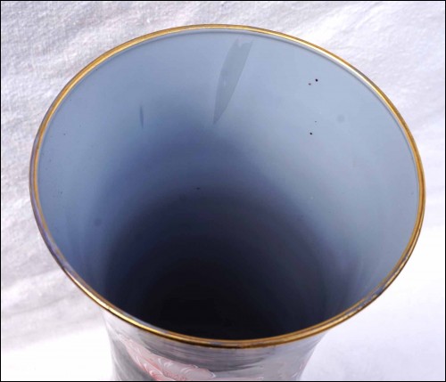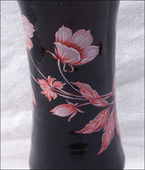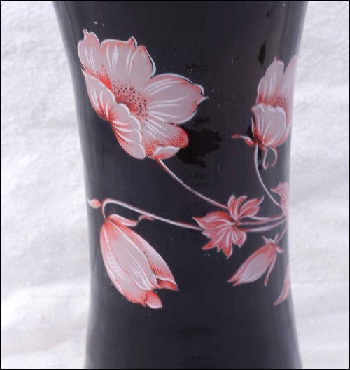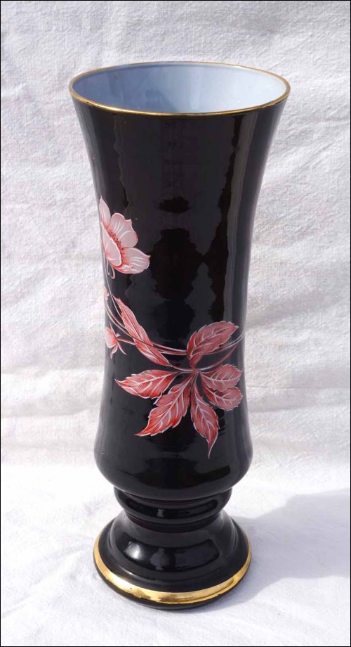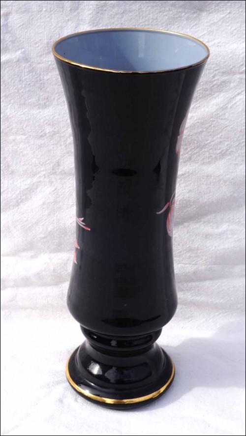 Vase en verre doublé noir réhaussé de fleurs en émail par Harrach verrerie vers 1950's. Hauteur 33cm, diamètre 12.8cm. Très bel état.