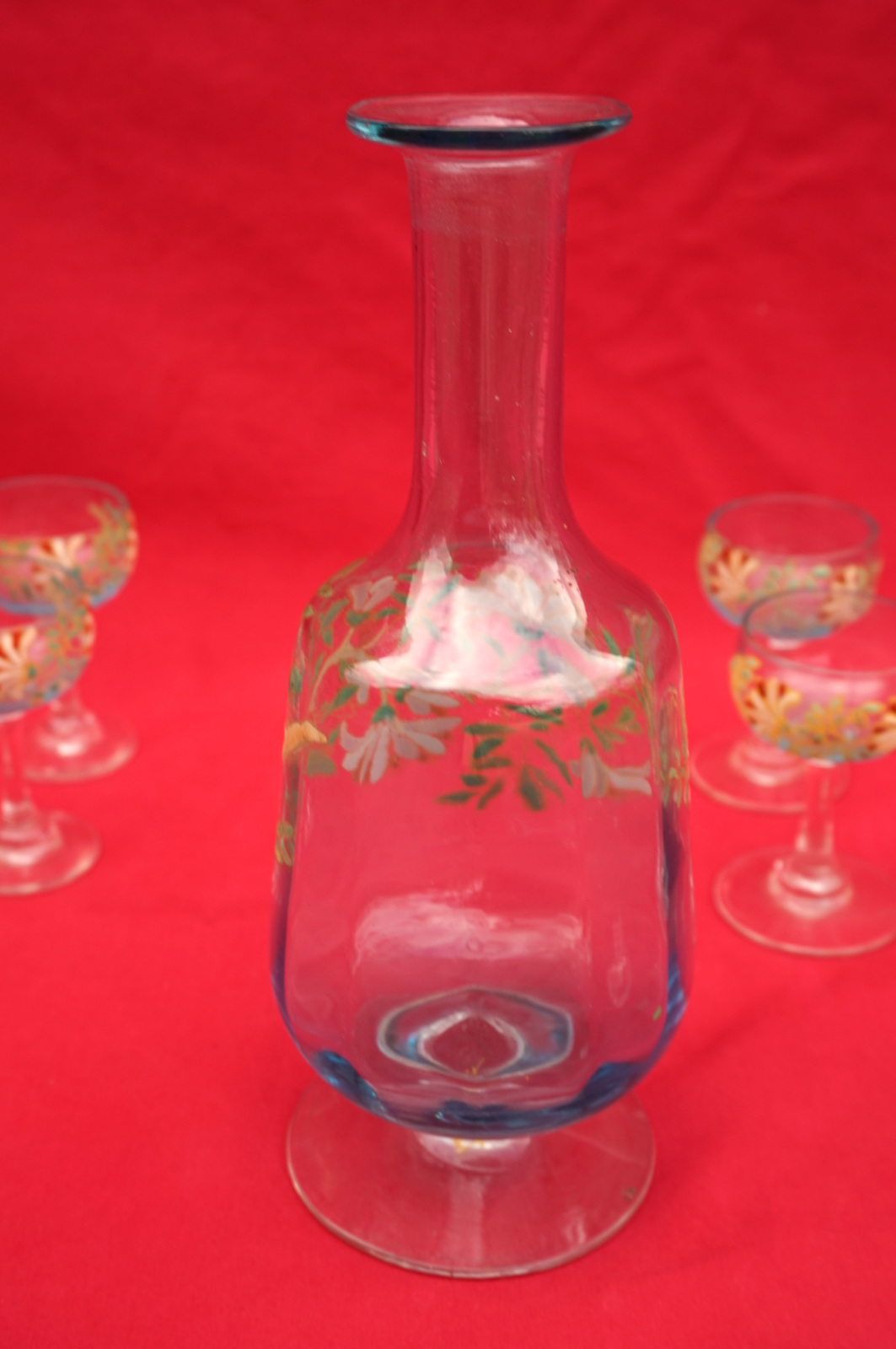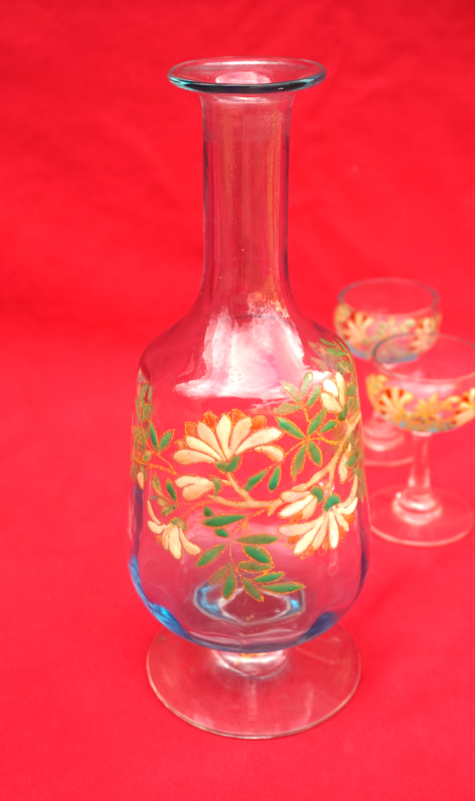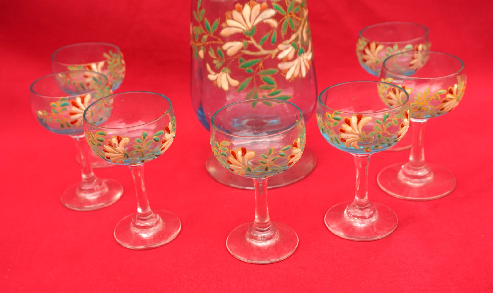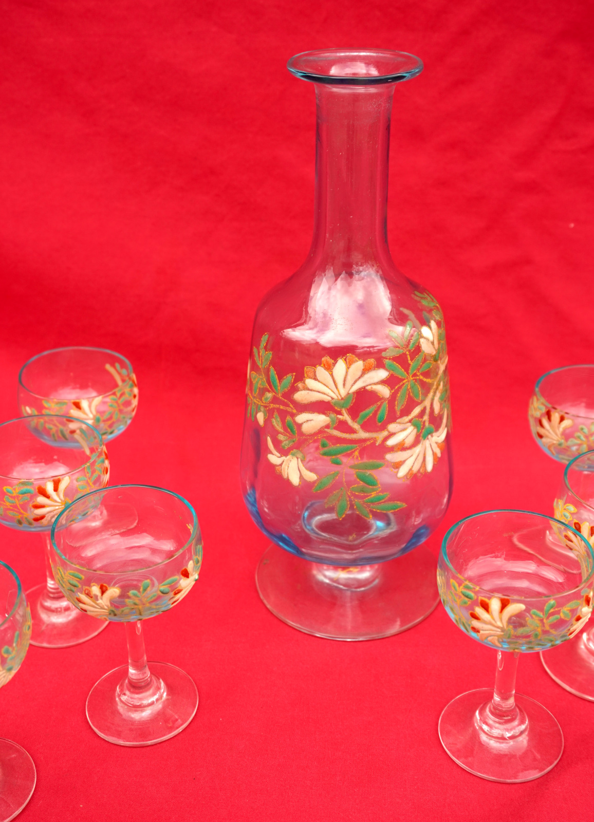 Legras Enamel Glass Cordial Set Cruet 7 Glasses Flowers 1900's