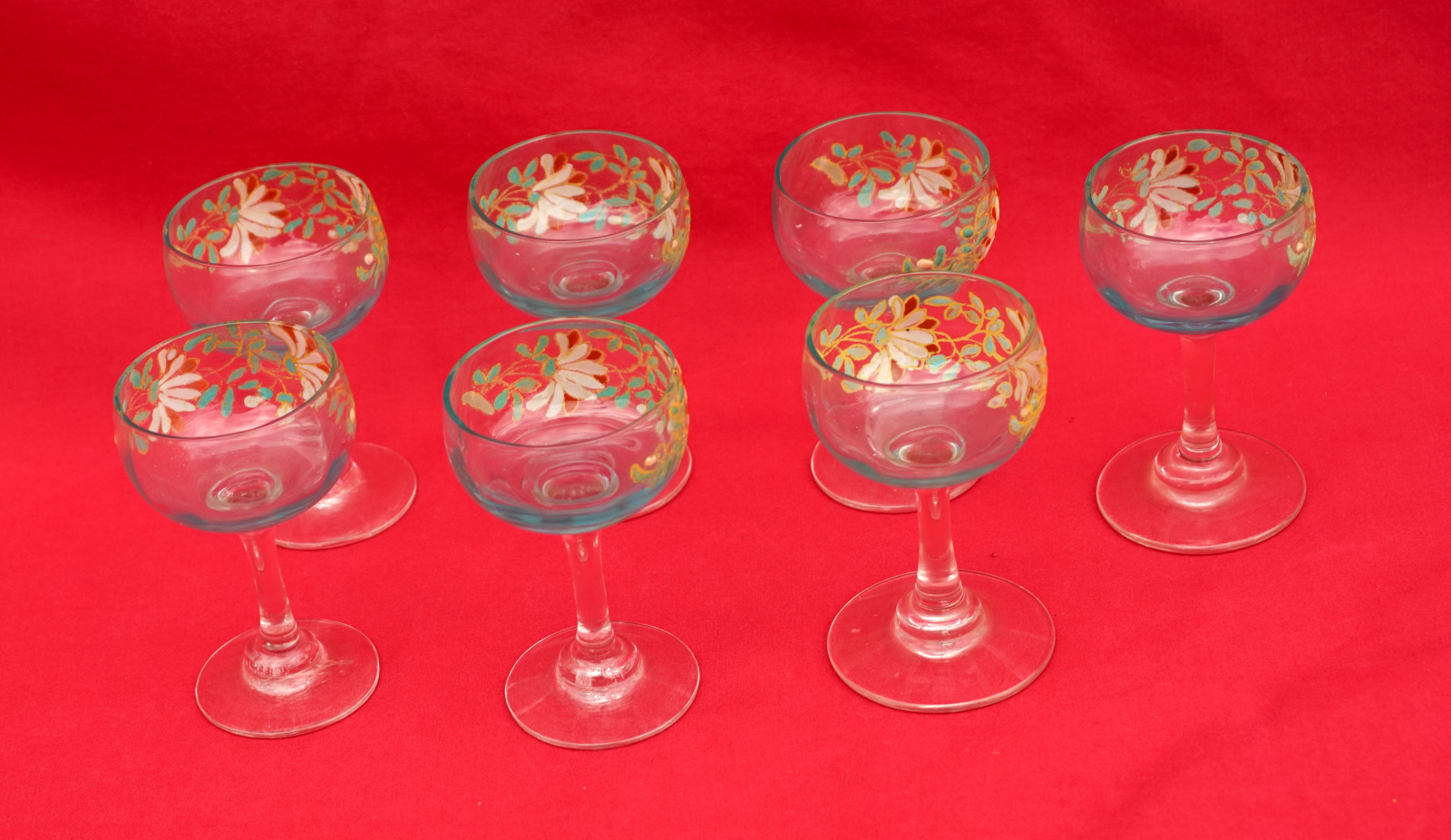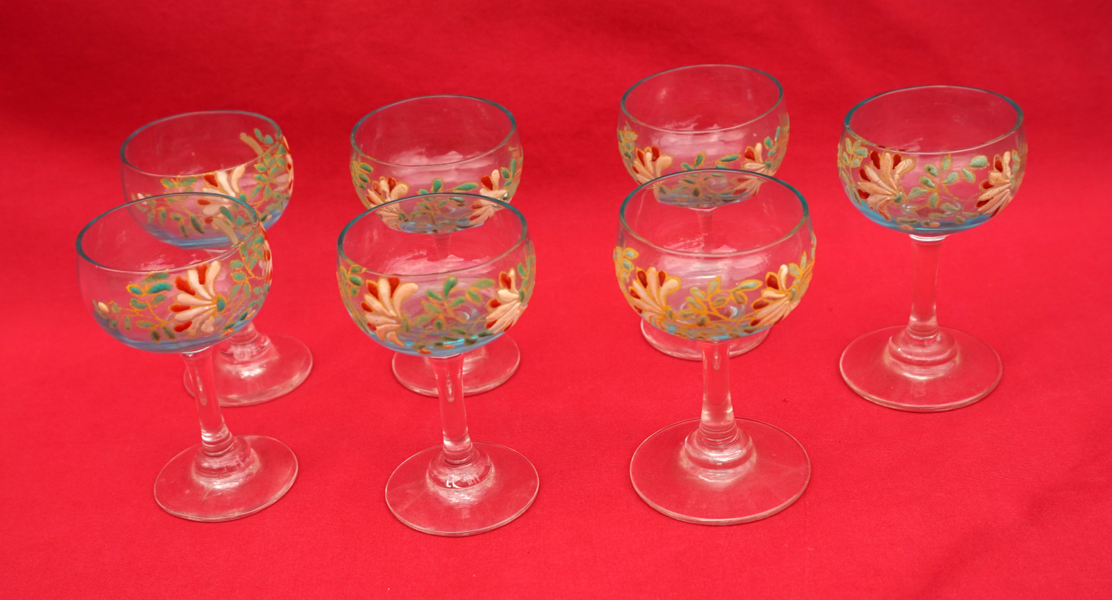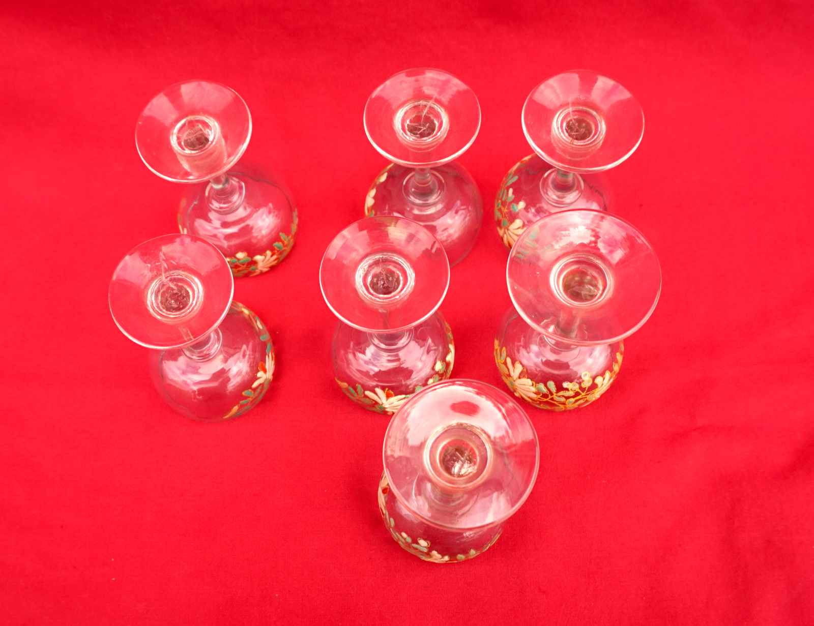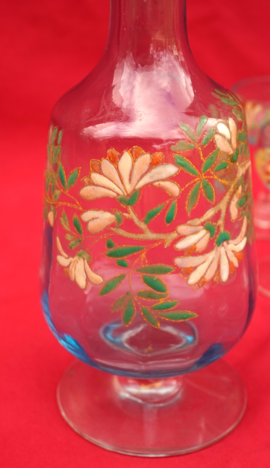 Legras Enamel Glass Cordial Set Cruet 7 Glasses Flowers 1900's