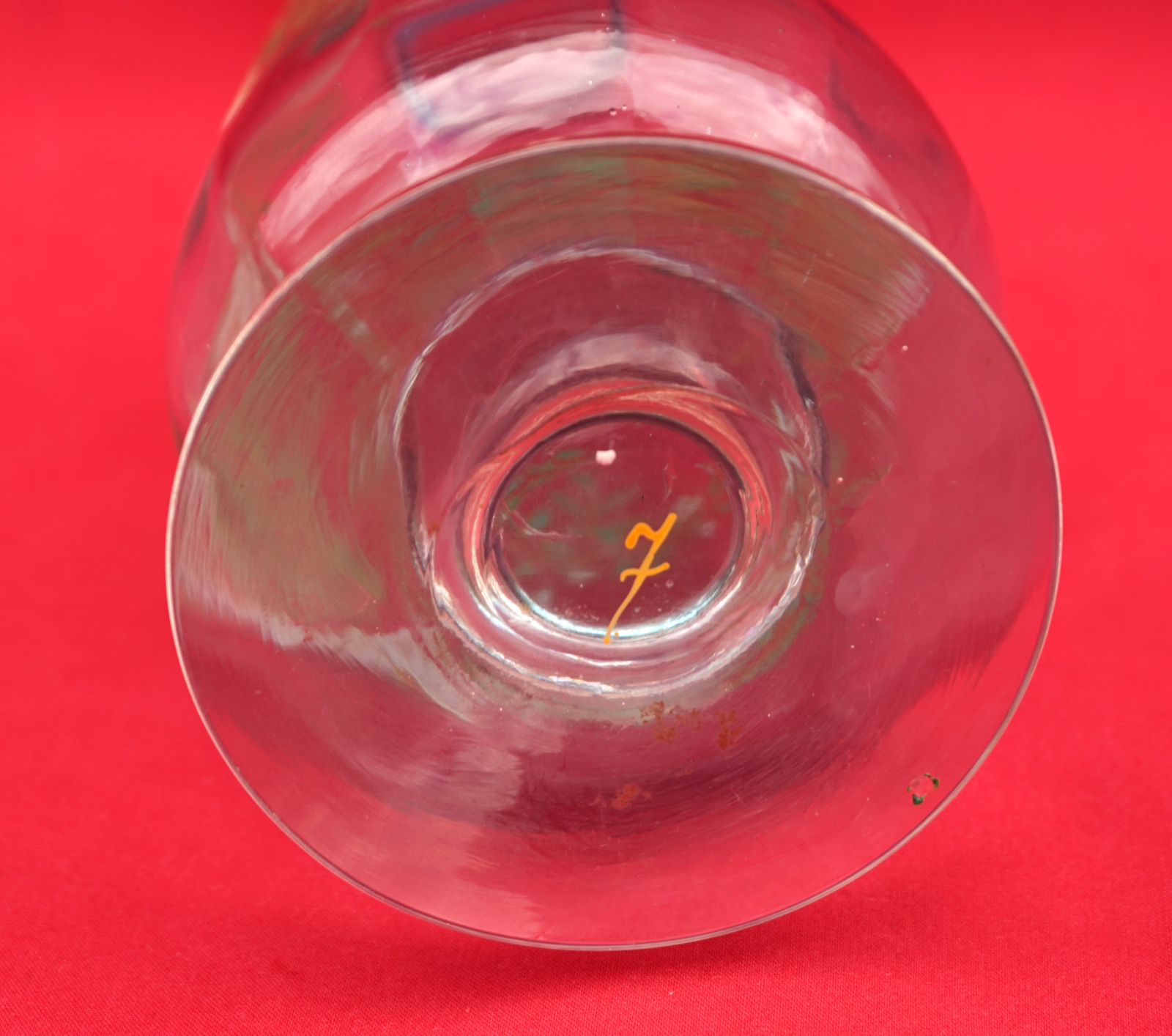 French enamel glass cordial set with one cruet and 7 glasses made by Legras during the 1900's. They measure for the cruet: 7 3/4" (19.7cm) height, 7 1/4" (8.5cm) diameter, for the glass 2 7/8" (7.3cm) height, 1 5/8" (4.2cm) diameter. Good condition the stopper of the cruet is missing