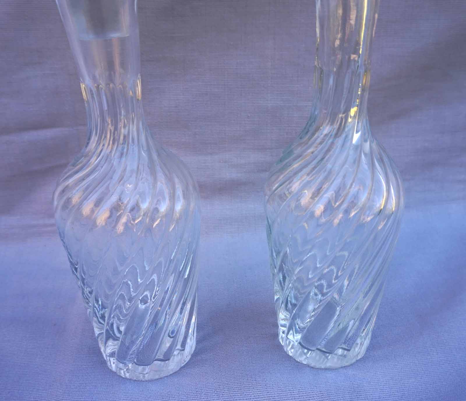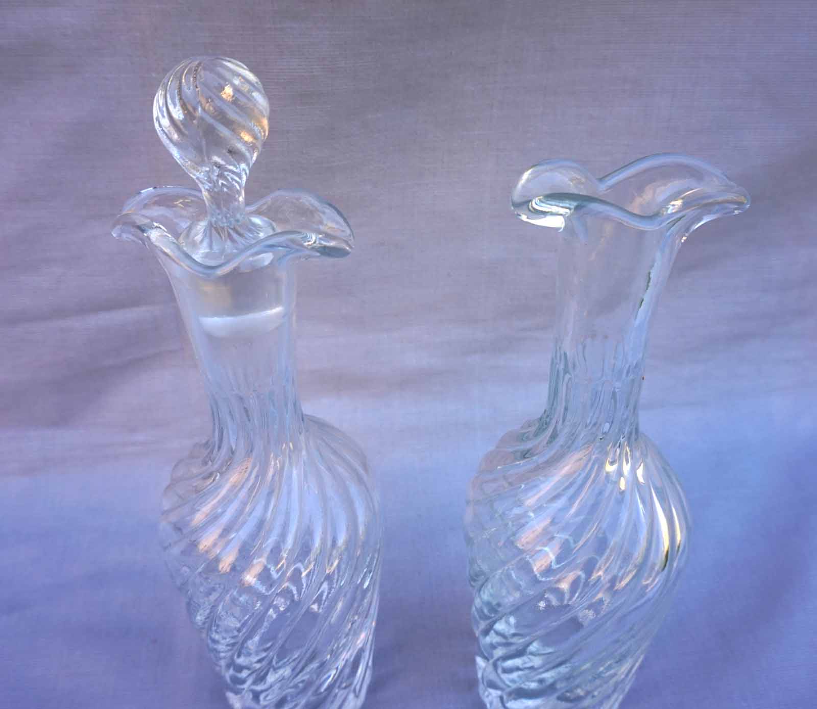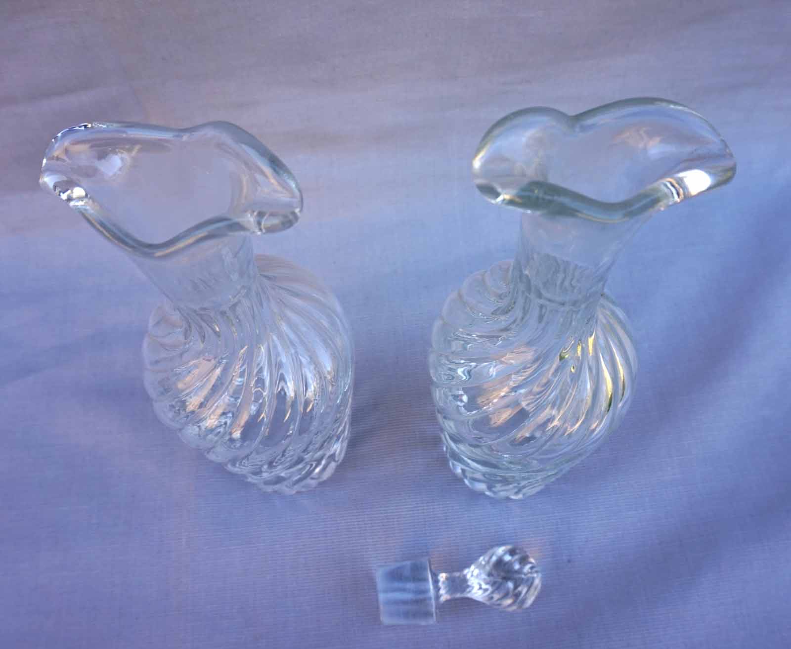 French oil vinegar pressed twisted glass pair of cruets made during the 1910's. 2 3/4" (7cm) diameter 9 1/2" (24cm) height with the stopper. 9 1/2" (24cm) height 2 3/4" (7cm) diameter to the body. Good condition , one stopper is missing.