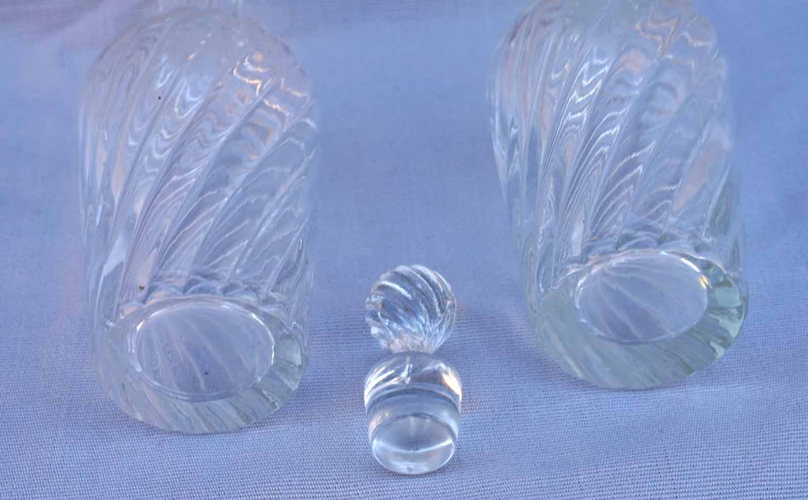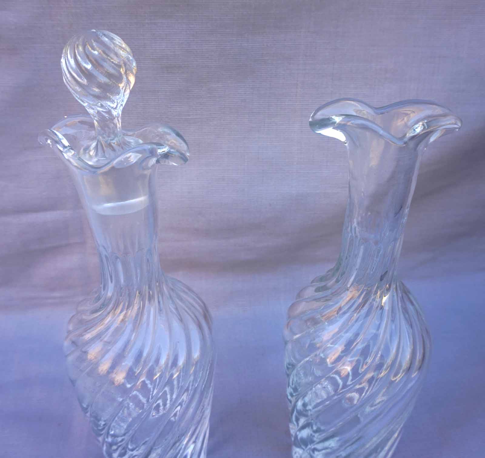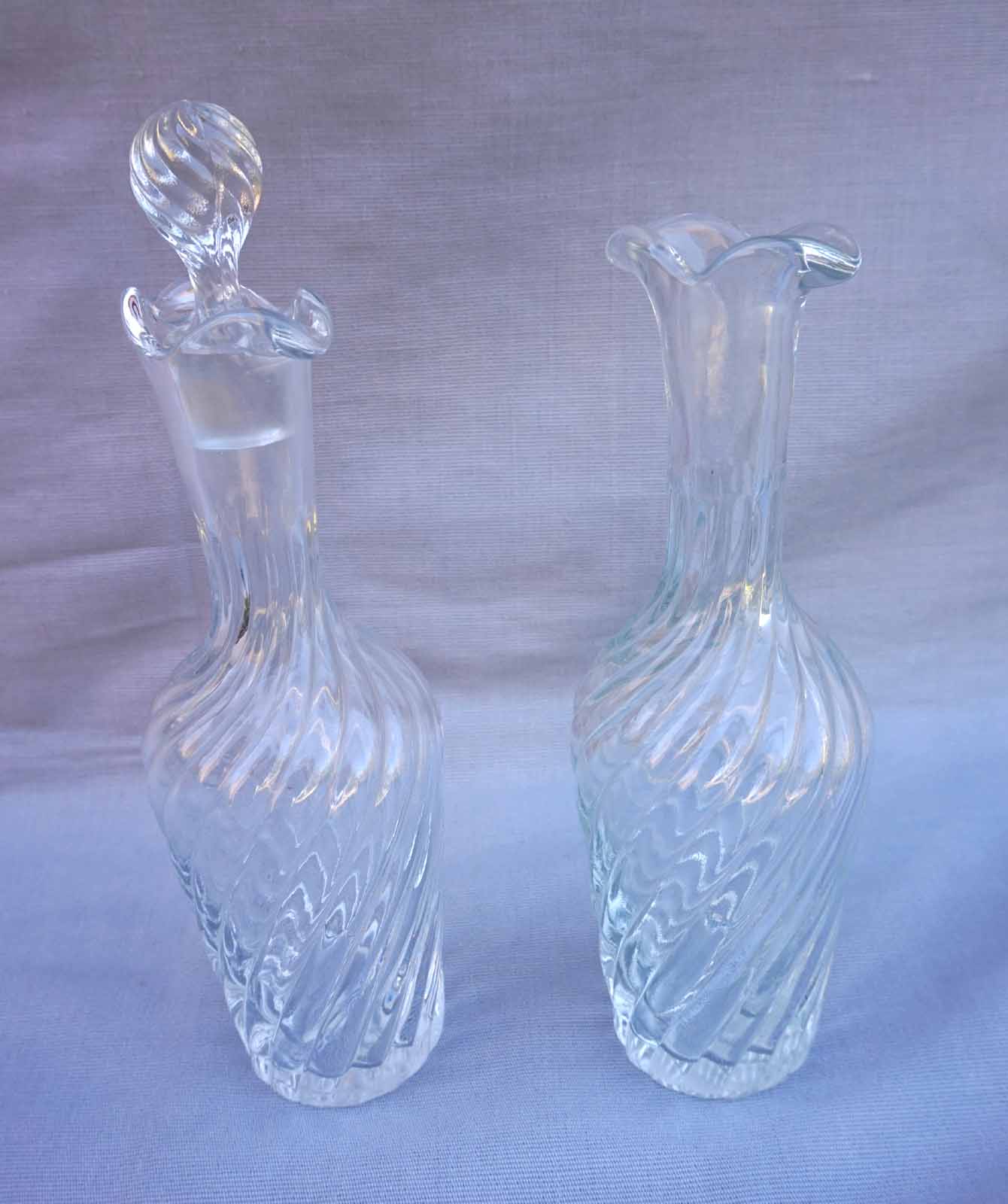 French oil vinegar pressed twisted glass pair of cruets made during the 1910's. 2 3/4" (7cm) diameter 9 1/2" (24cm) height with the stopper. 9 1/2" (24cm) height 2 3/4" (7cm) diameter to the body. Good condition , one stopper is missing.