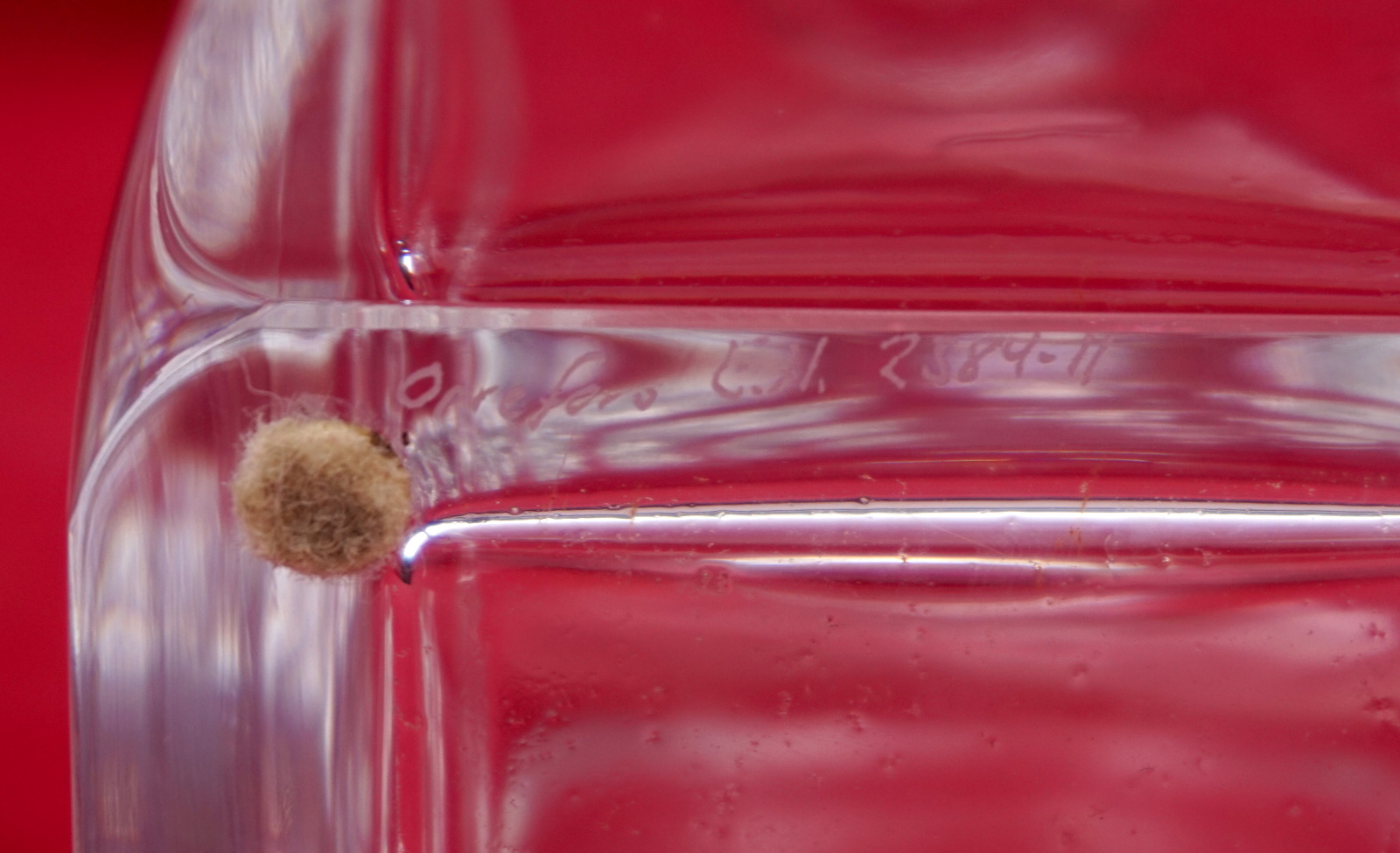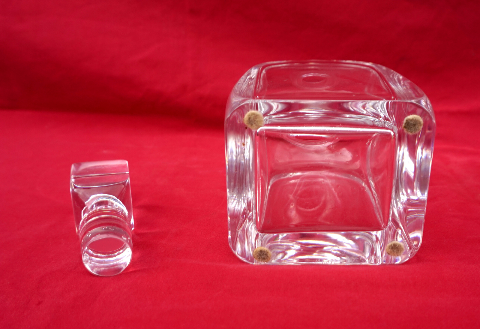 Carafe avec son bouchon en cristal par Vicke Lindstrand pour Orrefors Suède vers 1960's. Elle est signé sur son fond. Hauteur avec le bouchon 23.5 cm, largeur 8.5 cm, profondeur 7.7 cm. Parfait état.