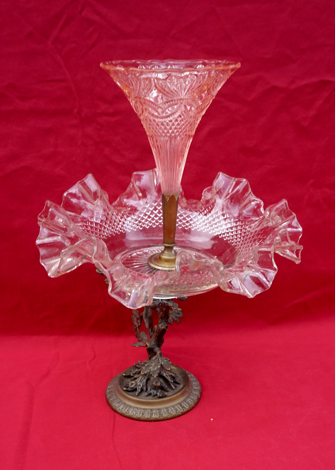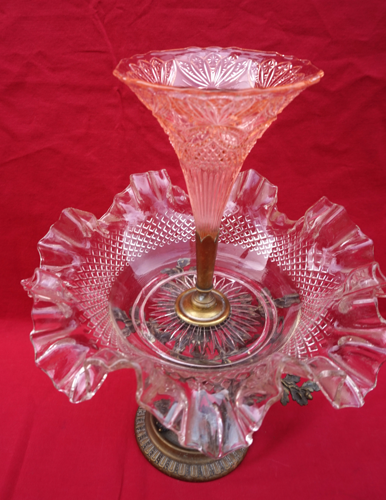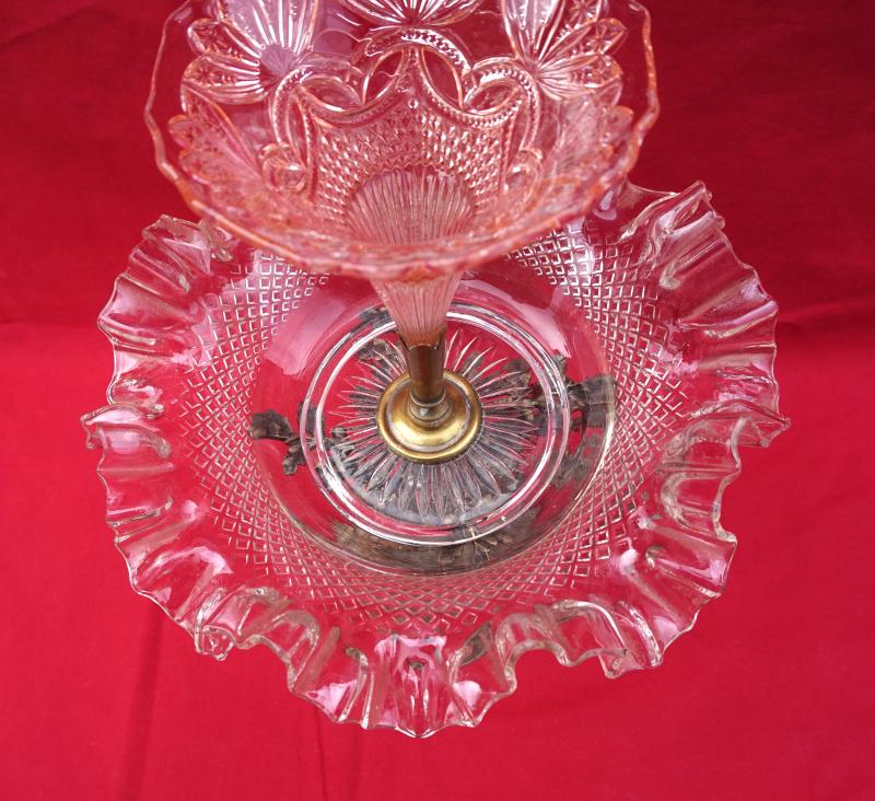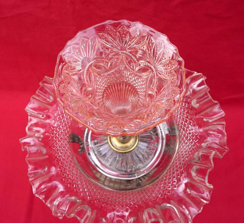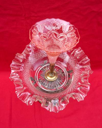Clear and rose pressed glass epergne with spelter base made during the 1930's. 11 3/4" (29.7cm) height, 9" (23cm) diameter. Good condition, it's slightly twisted.
