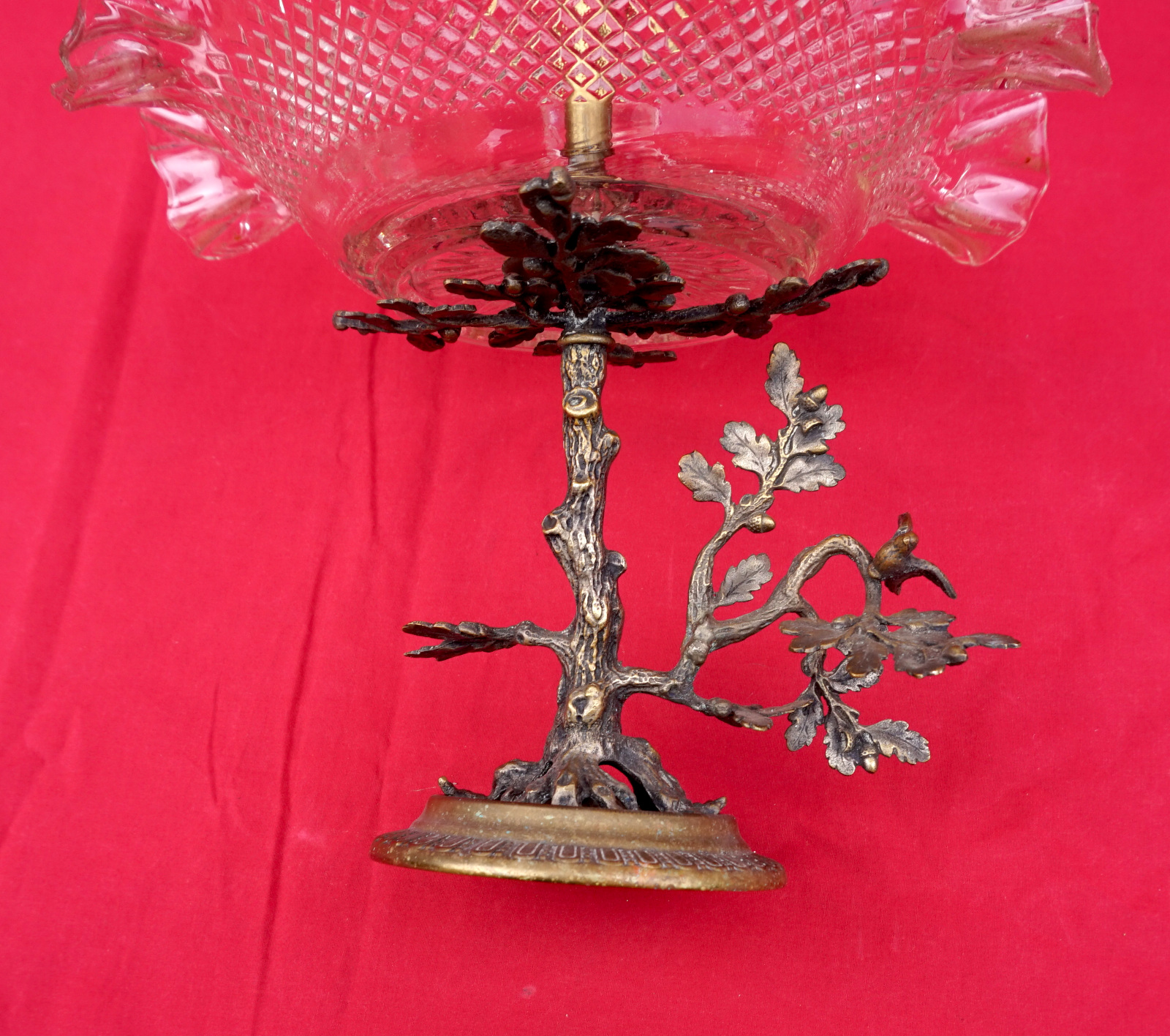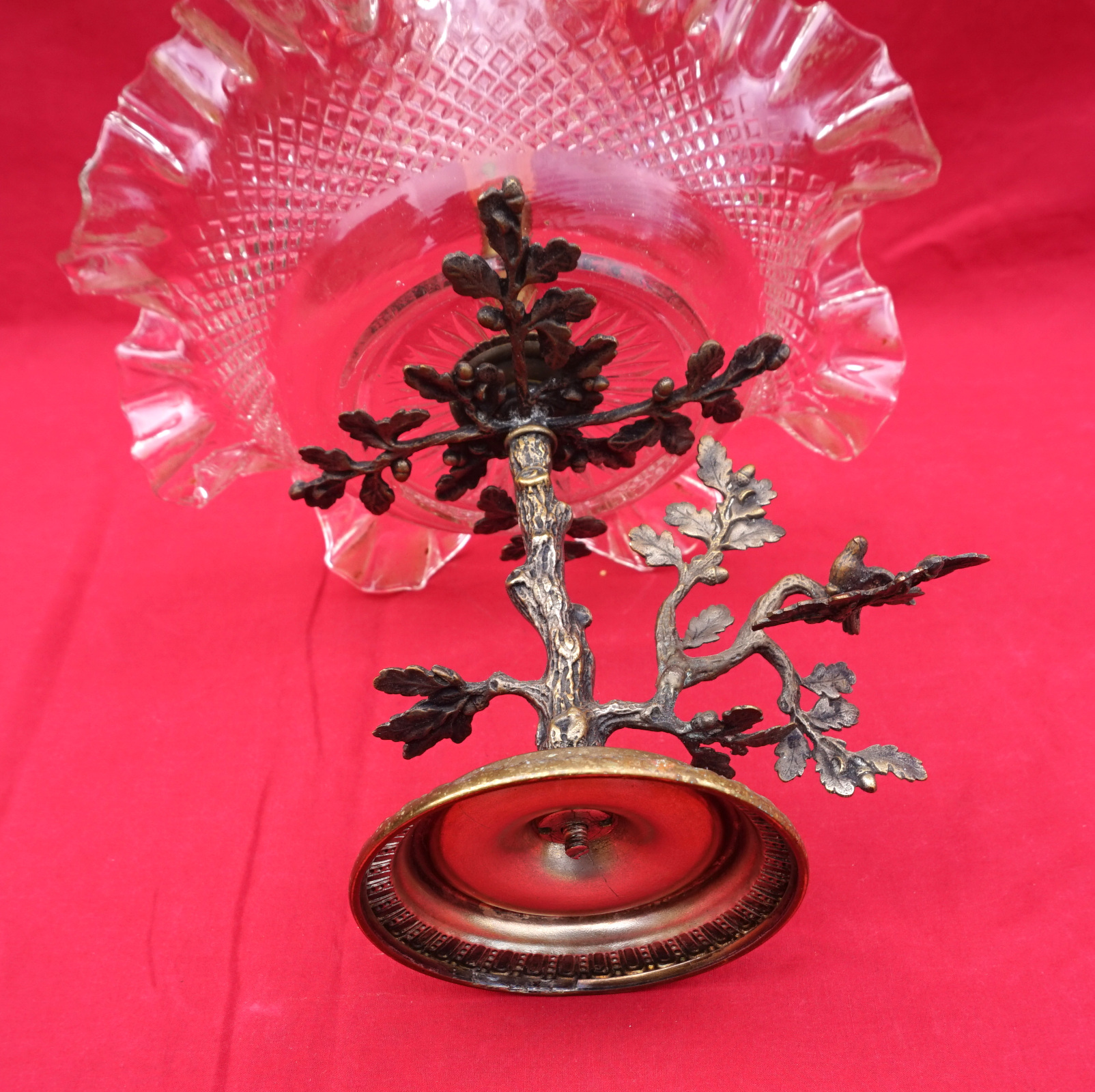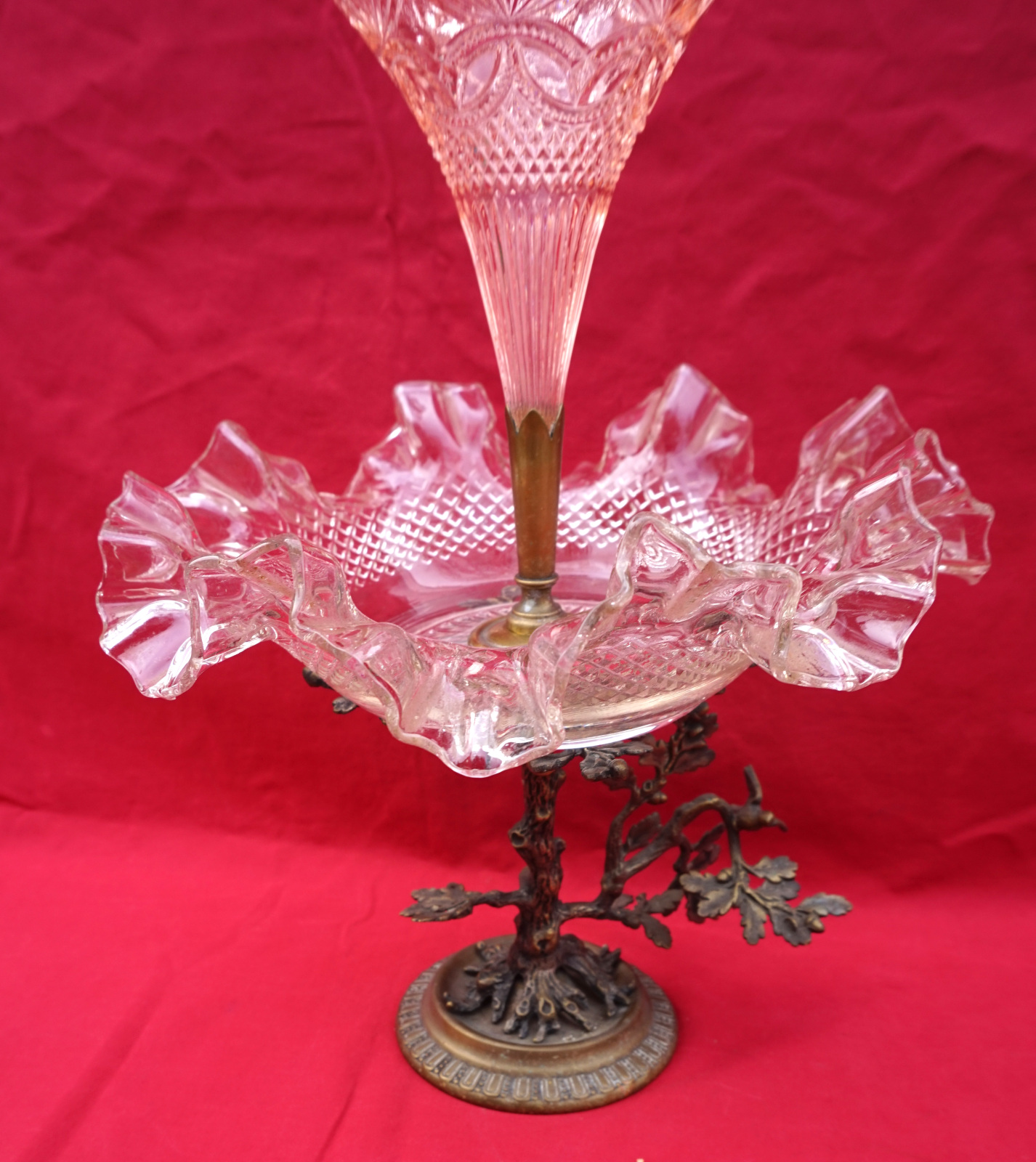Clear and rose pressed glass epergne with spelter base made during the 1930's. 11 3/4" (29.7cm) height, 9" (23cm) diameter. Good condition, it's slightly twisted.