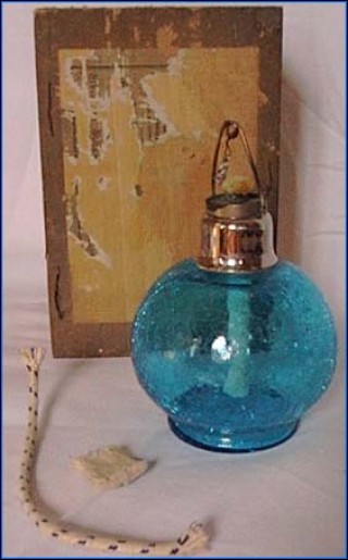 This rare lamp in blue crackled glass has been made in 1910. In mint condition, it has it original box with tools, just the print label has been pulled out. 5"1/4 tall.