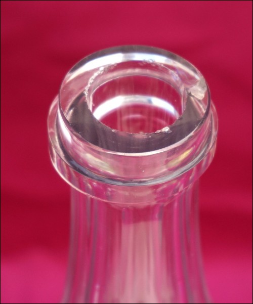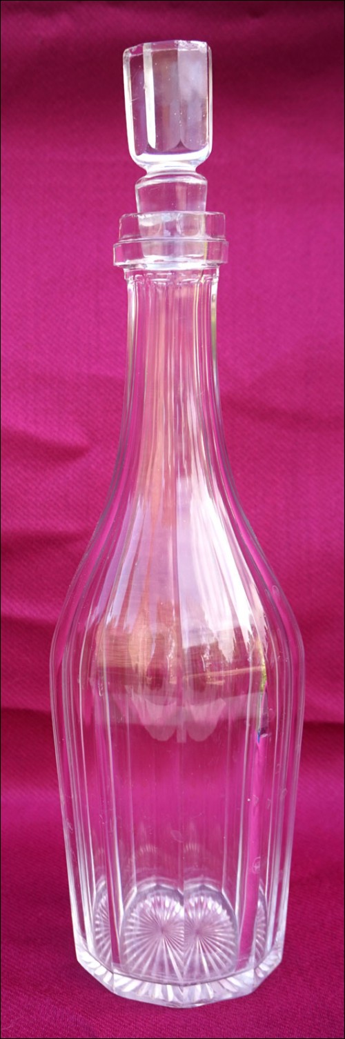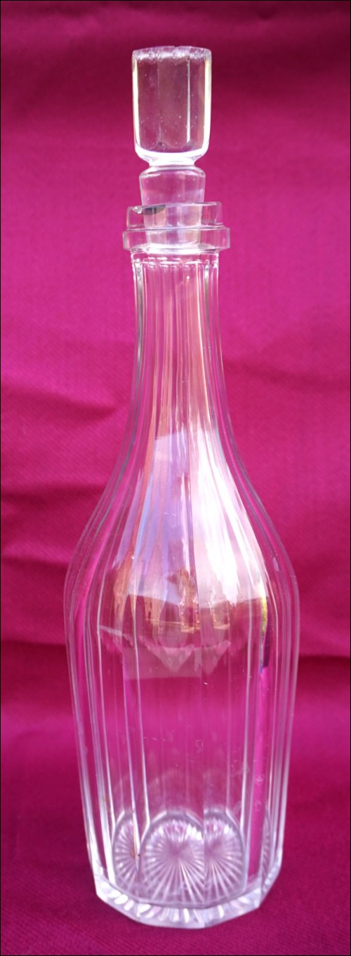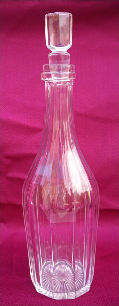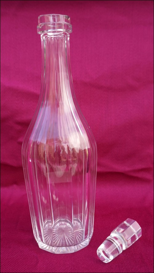 French cut crystal bottle shaped decanter with stopper made by St Louis during the 1900's. 13" (33cm) height. Good condition chip in the crystal to the neck and tiny chips on the stopper as presented on the following pictures.