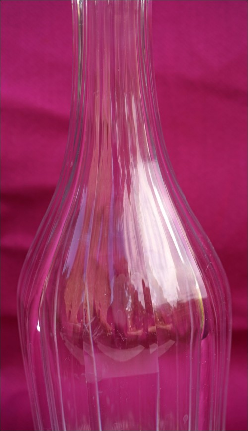 Carafe de forme bouteille en cristal taillé de la manufacture de St Louis, vers 1900. Bel état, accident dans le cristal au col. Egrenures au bouchon. Hauteur 33 cm.