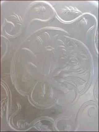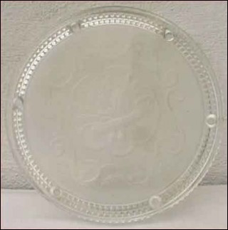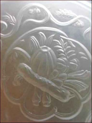 Trivet Art Deco table mat in thick satin glass with vegetables pattern made around 1935. Good condition only 2 chips on the back not visible in front. 9" diameter.