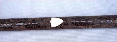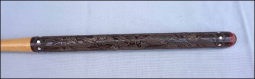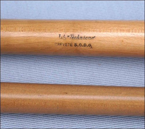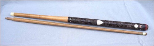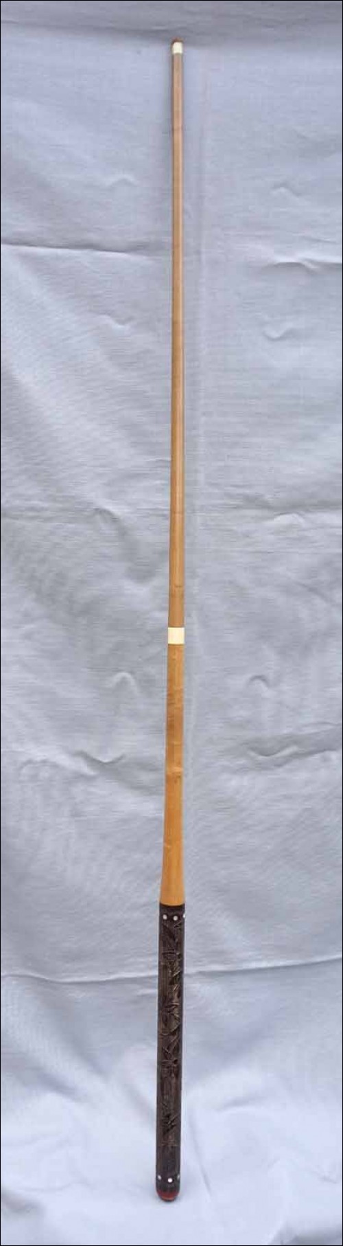 La Technique queue canne de billard français dit carambole, érable et amarante sculptée incrustée de nacre, par Prevoté au catalogue de 1926. Signée sur la queue "La Technique Breveté SGDG" et sur le talon 3 boules de billard dont une rouge et "DLL" entouré de 2 ailes. Longueur 139.5cm, poids 524gr. Très bel état, très léger voile.