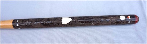 La Technique french billiard cue with mother of pearl inlayed on carved rosewood made by Prévoté Paris in 1926. It's signed La technique Breveté SGDG and DLL with wings in the rosewood. 55" (139.5cm) length, 18.48oz (524grams). Beautiful condition as shown by the following pictures.