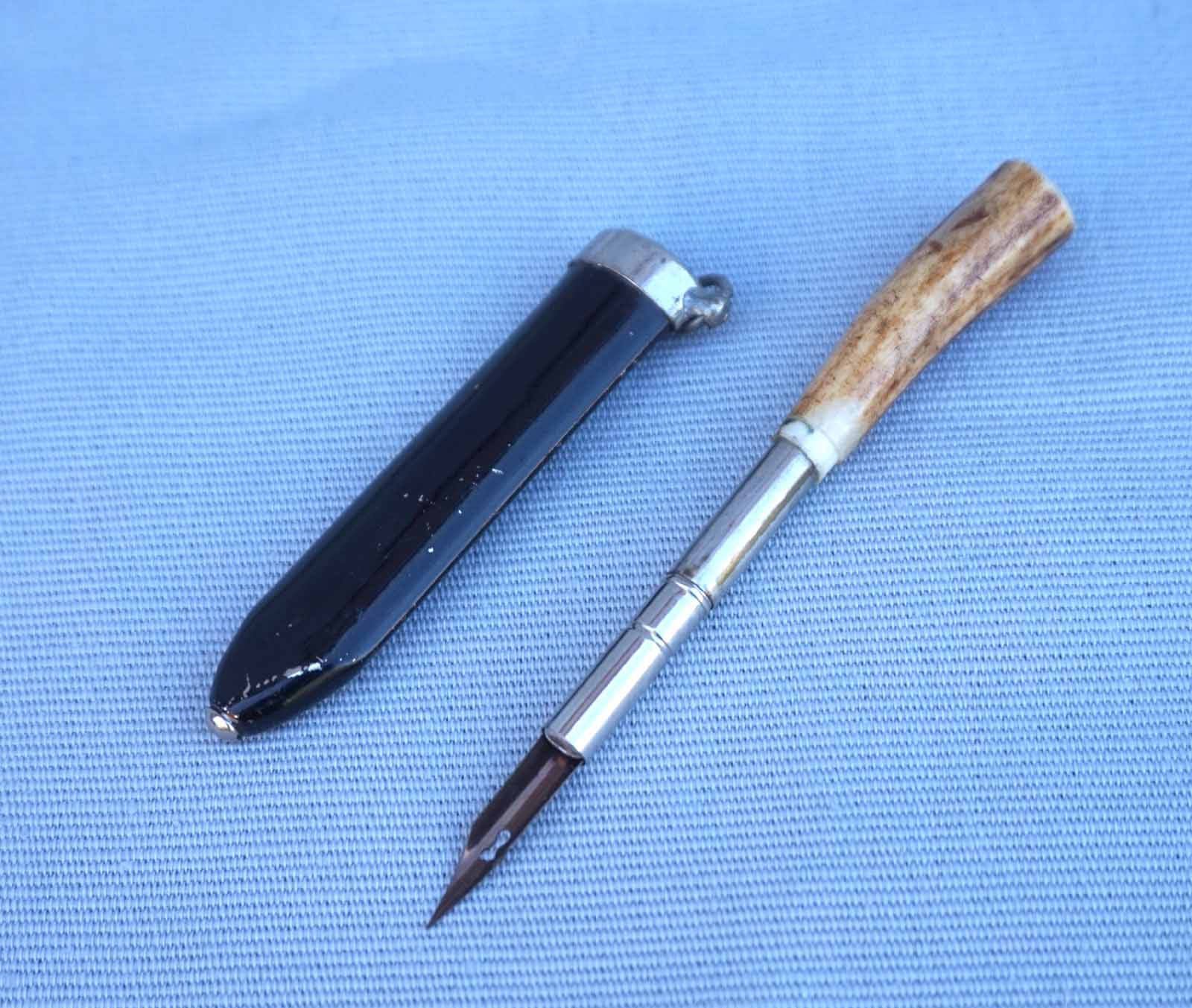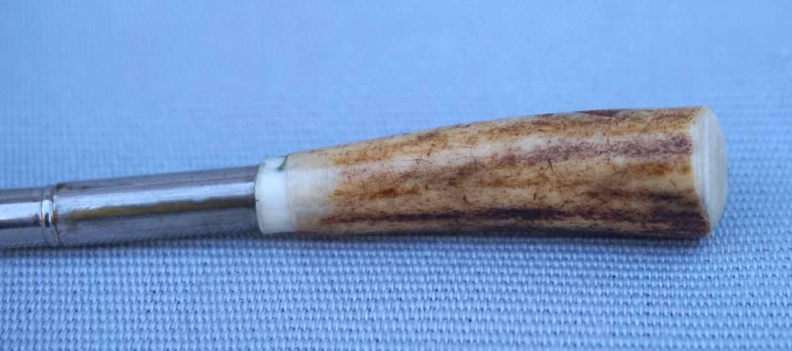 Porte plume miniature avec fourreau et manche en bois de cerf milieu XXème. Longueur total 11.2 cm, longueur du manche en corne 4.2 cm. Bel état, la bague de liaison entre la corne et le porte plume est manquante