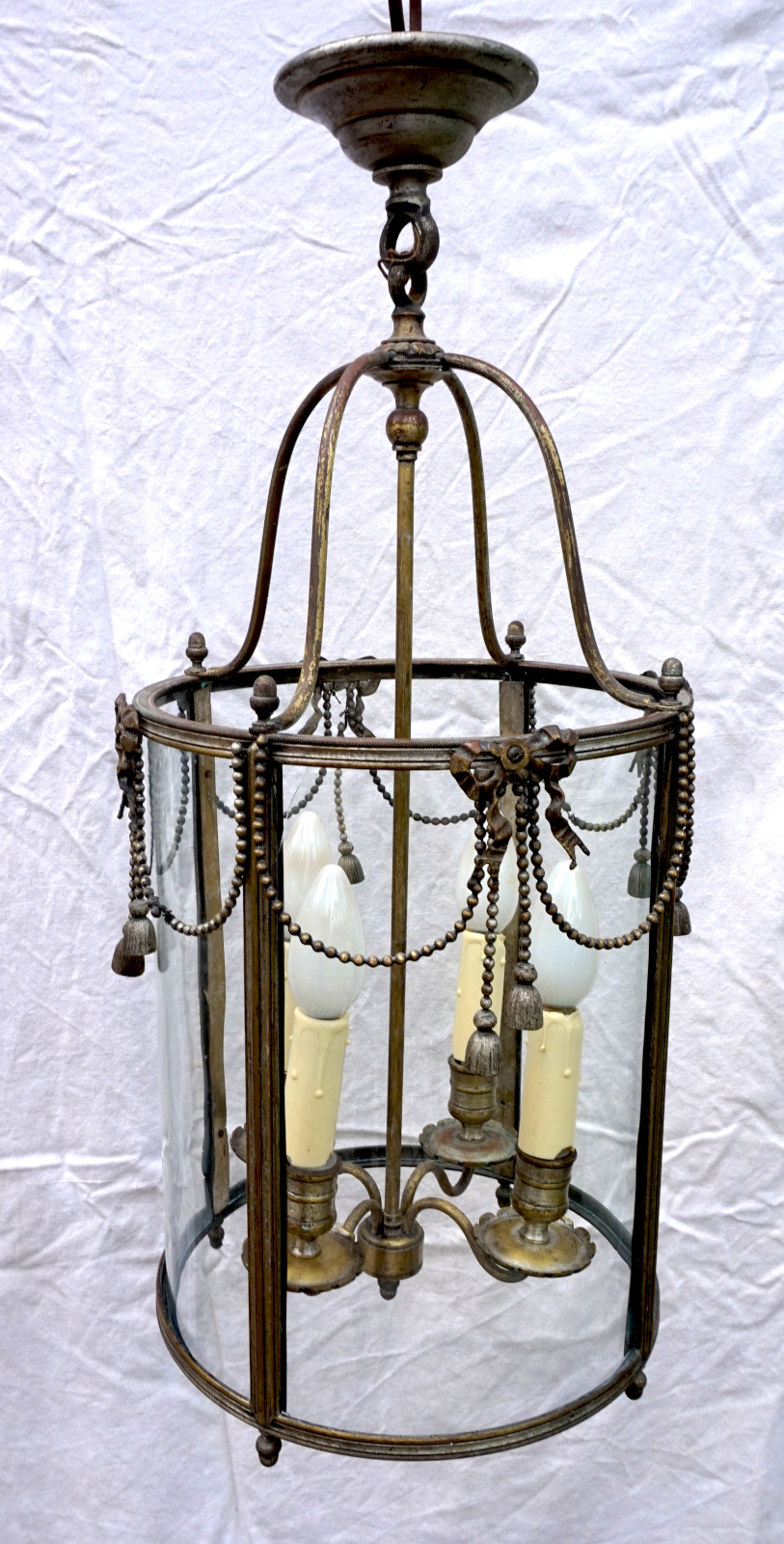 Hall Lantern Chandelier Silver Bronze 4 Light Louis XVI style Ribbon Signed 1930's