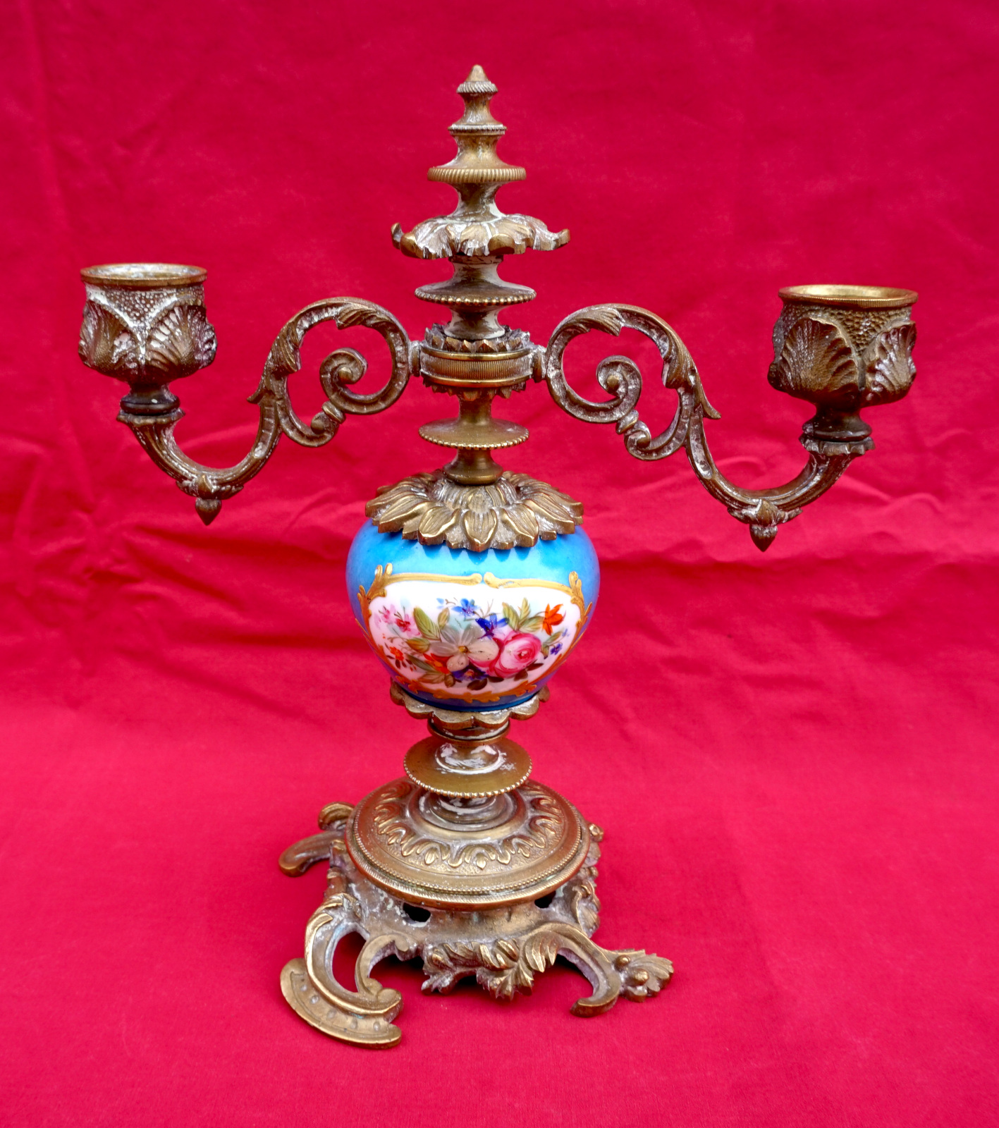Gilt Brass Hand Painted Porcelain Candlestick 2 Lights Late 19th C