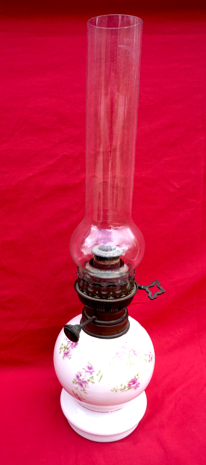 Oil Lamp Roses Porcelain Matador Adjustable Burner Chimney 1900's