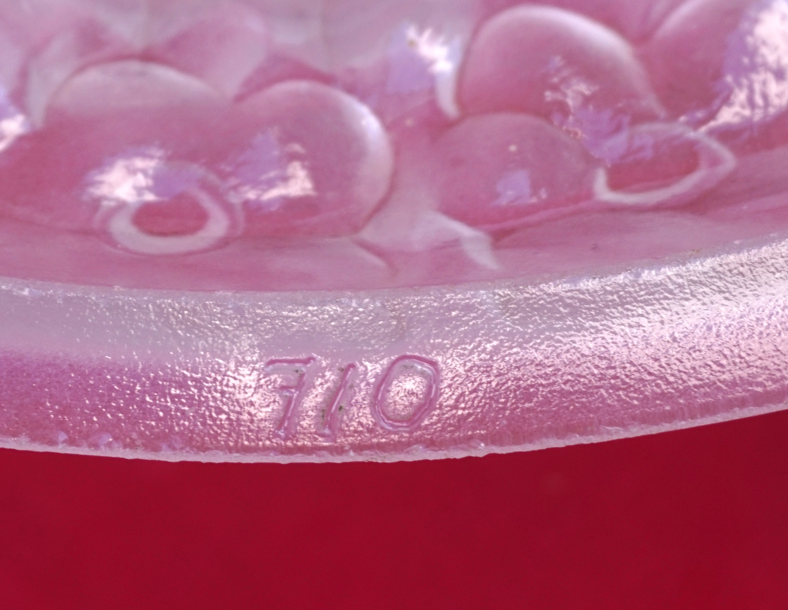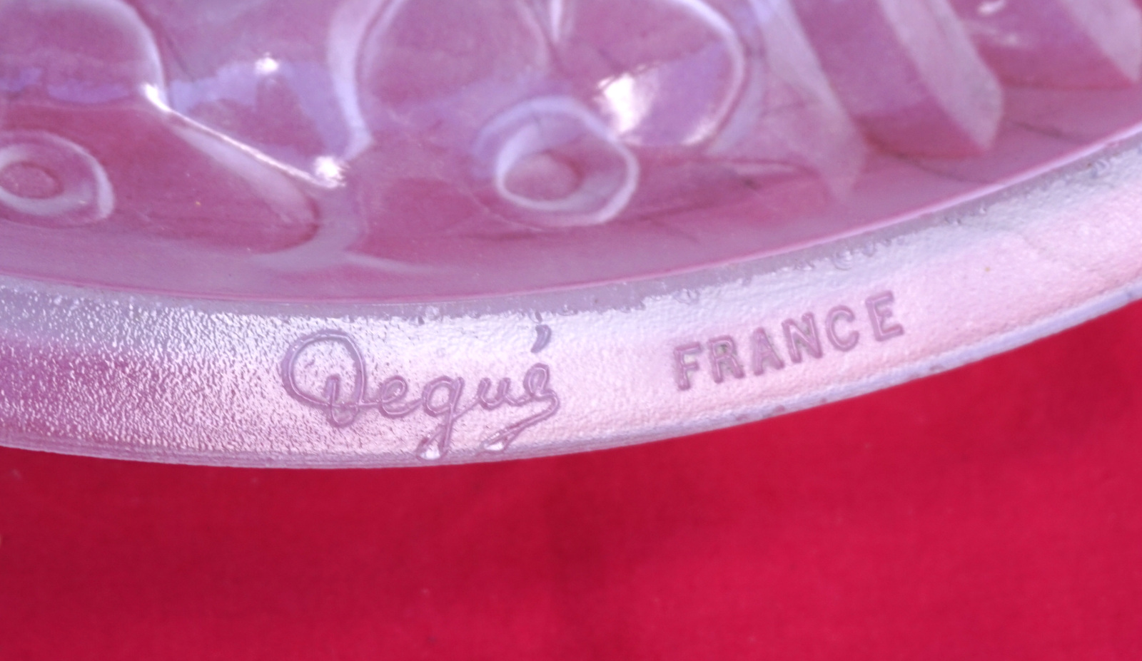 Grand coupe plafonnier en verre pressé par Degué Paris vers 1930. Ell est signée est numérotée 710. Diamètre 34.8 cm, hauteur sans les chaines 12.8 cm, poids 2.560 kg. Parfait état.