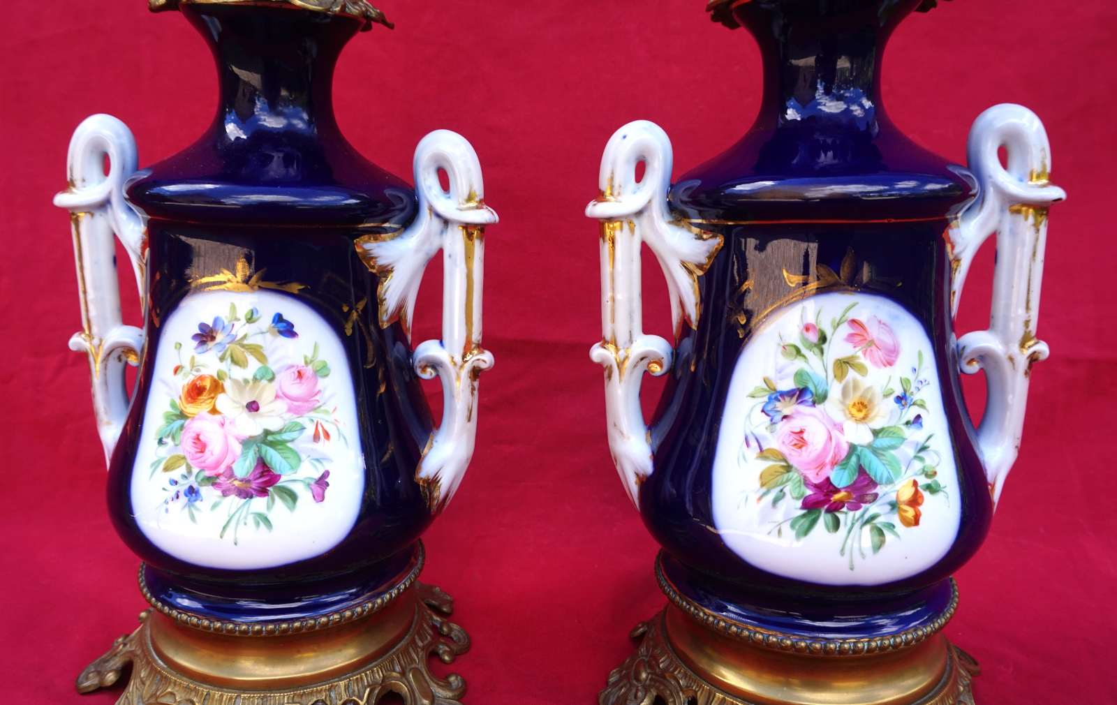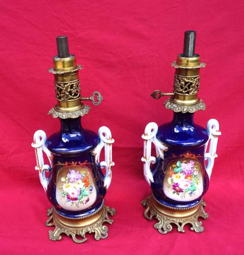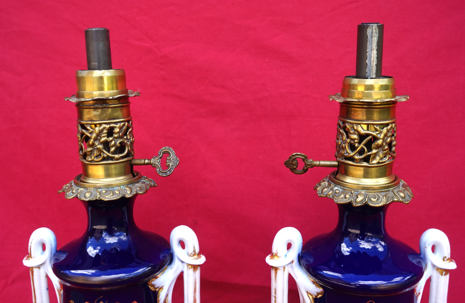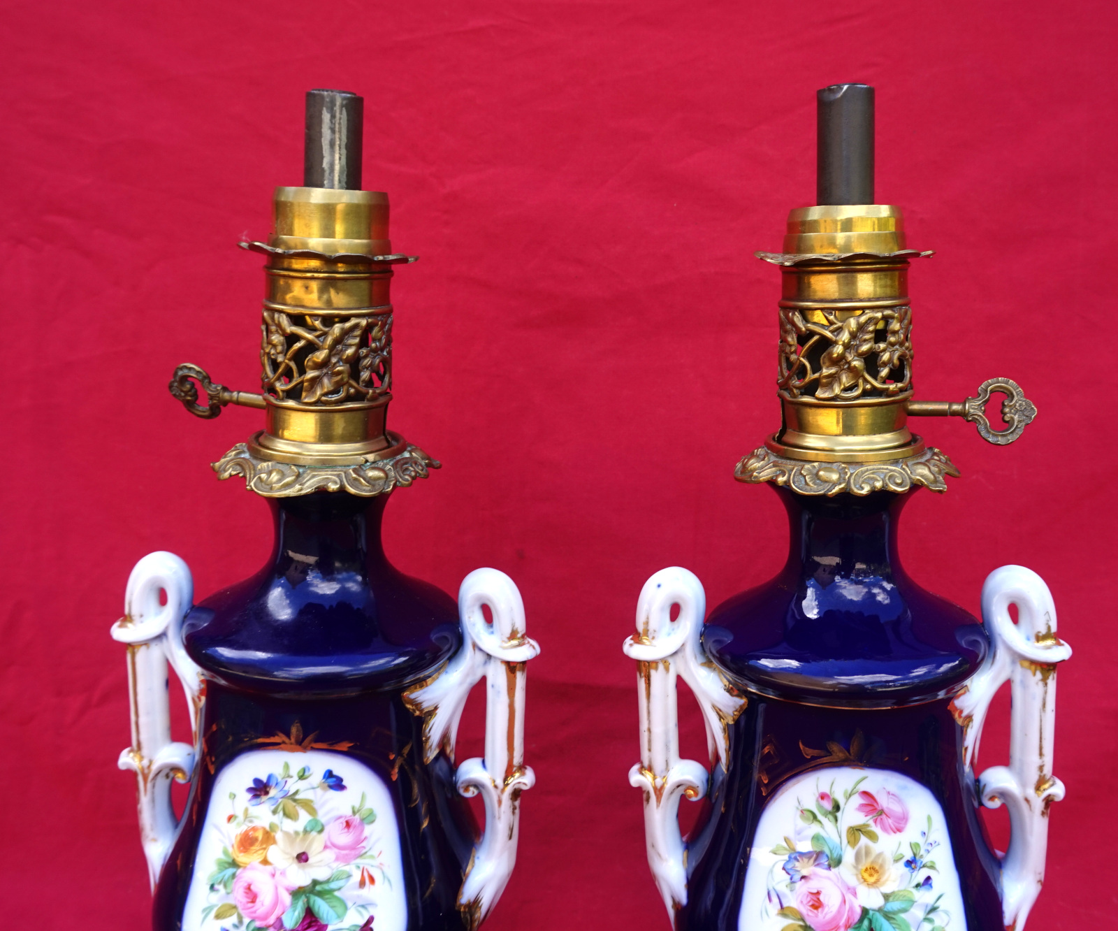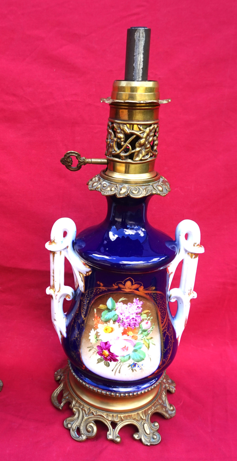 Antique french oil kerosene pair lamps in hand painted and gilt porcelain showing flowers in each side with gilt border on dark blue background made by Valentine or Bayeux during the second half of the 19th century, Napoleon III are. 16 1/2" (42cm) total height, 6 3/4" (17.2cm) base diameter, weight 8lb 13oz (4 kilograms) for the pair. Beautiful condition only the gilt is slightly used