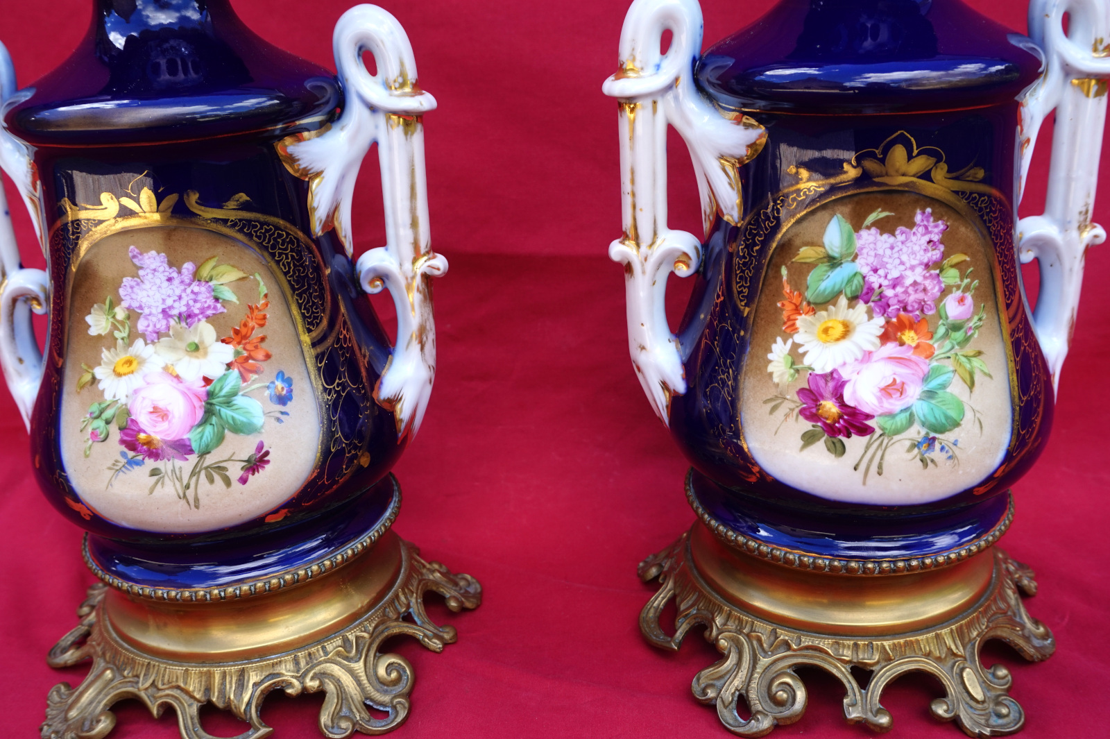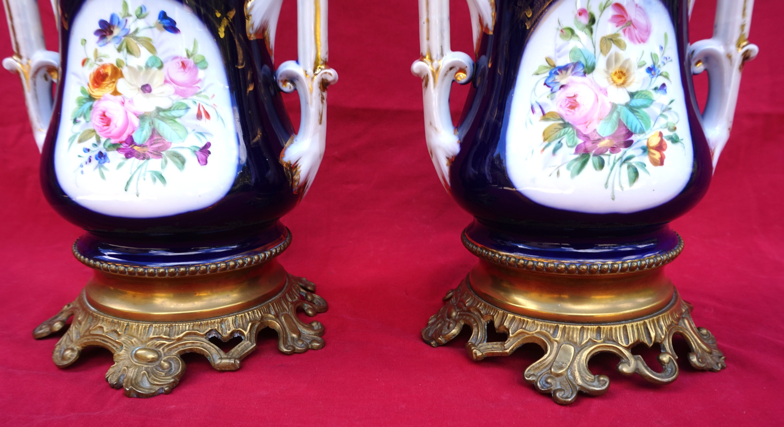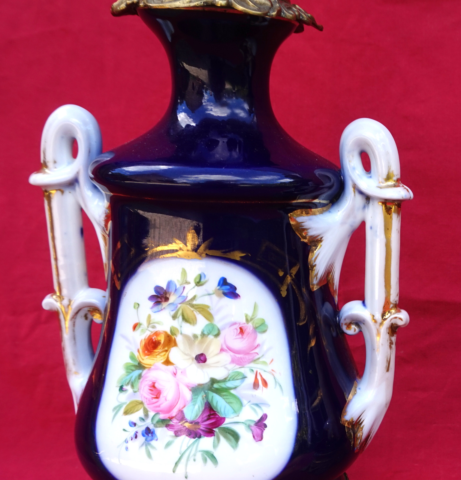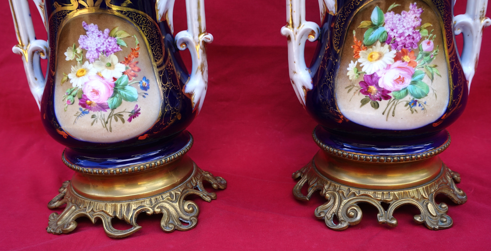 Antique french oil kerosene pair lamps in hand painted and gilt porcelain showing flowers in each side with gilt border on dark blue background made by Valentine or Bayeux during the second half of the 19th century, Napoleon III are. 16 1/2" (42cm) total height, 6 3/4" (17.2cm) base diameter, weight 8lb 13oz (4 kilograms) for the pair. Beautiful condition only the gilt is slightly used