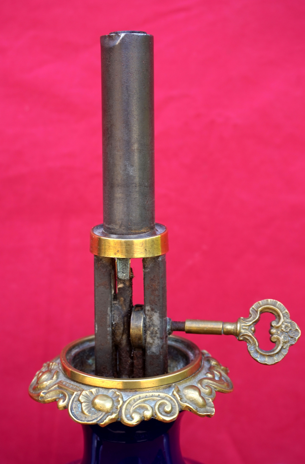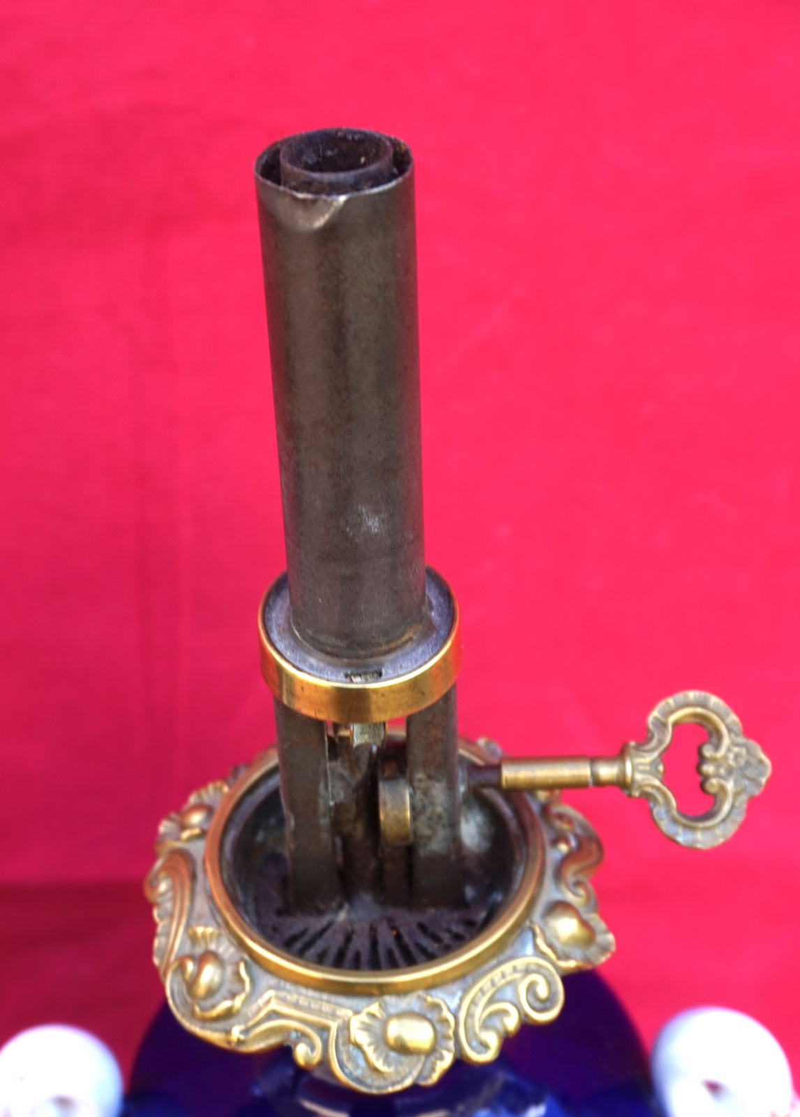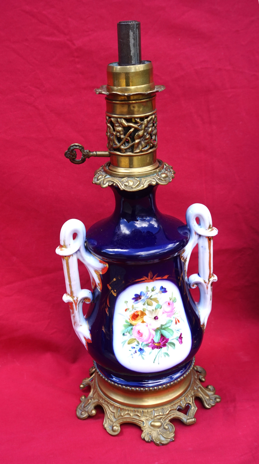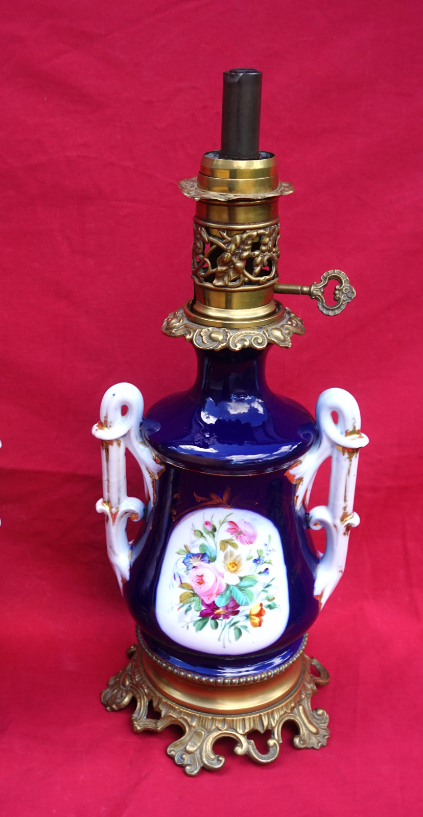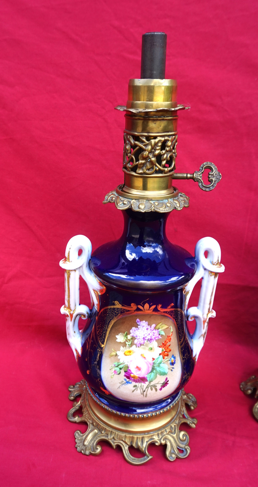 Paire de lampes à petrole en porcelaine de Bayeux ou Valentine , sur unn fond bleu de four un décor en madaillons de fleurs peint à la main réhaussé de dorure, sur une socle en bronze; deuxième moitié du XIX) siècle. Haueur 42 cm, diamètre à la base 17.2 cm. Très bel état, usures de dorures.