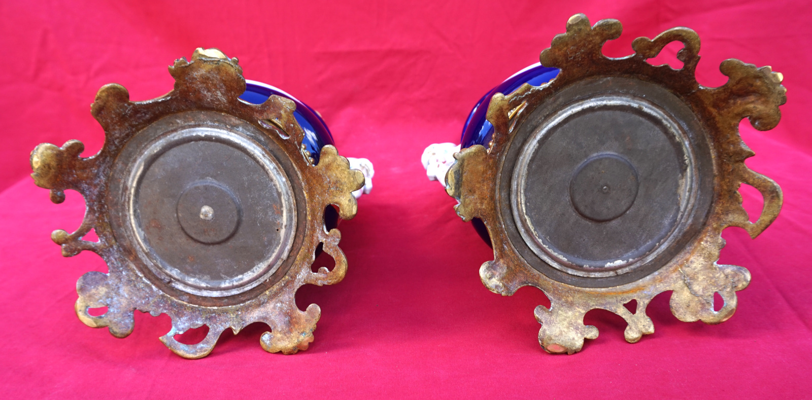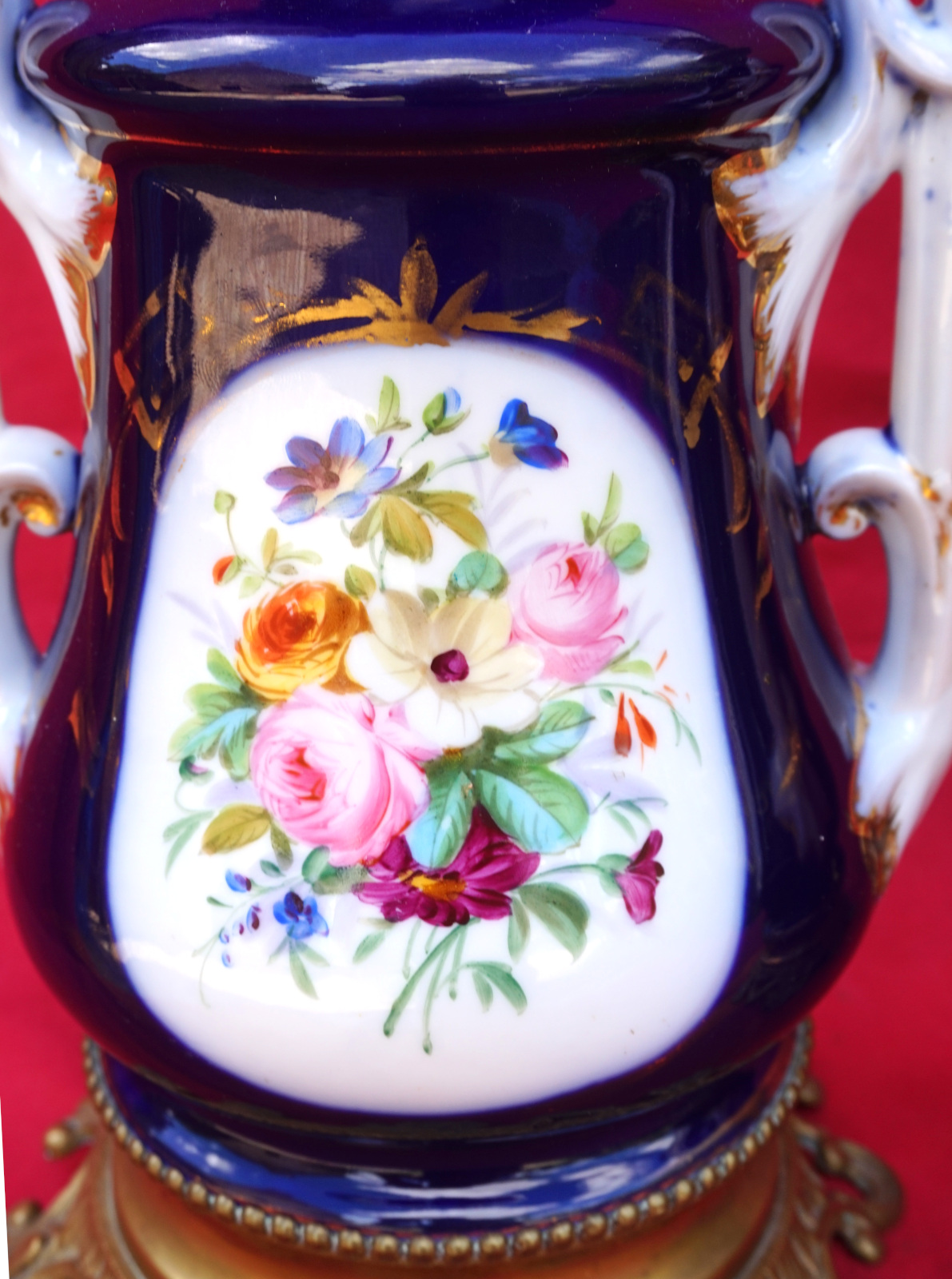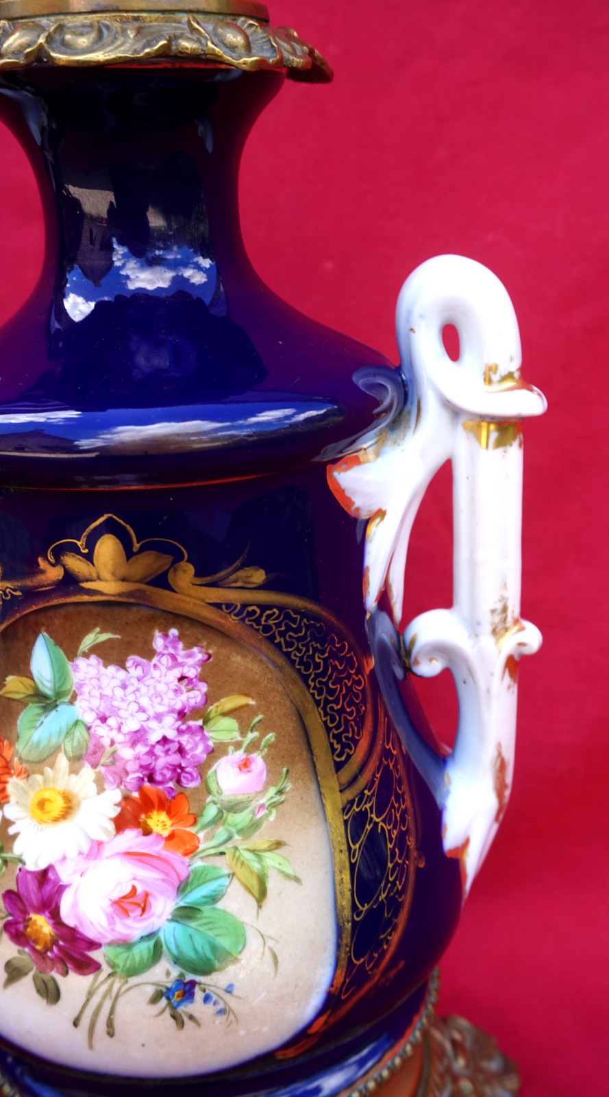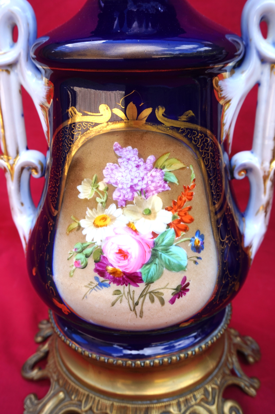 Bayeux Hand Painted Gilt Porcelain Large Pair Oil Lamp Brass Mounted Flowers 19th C