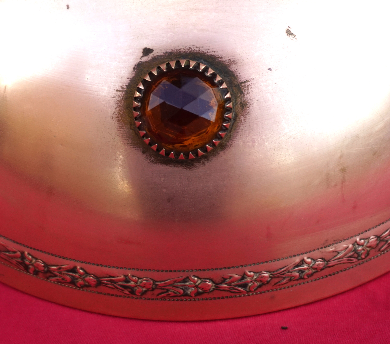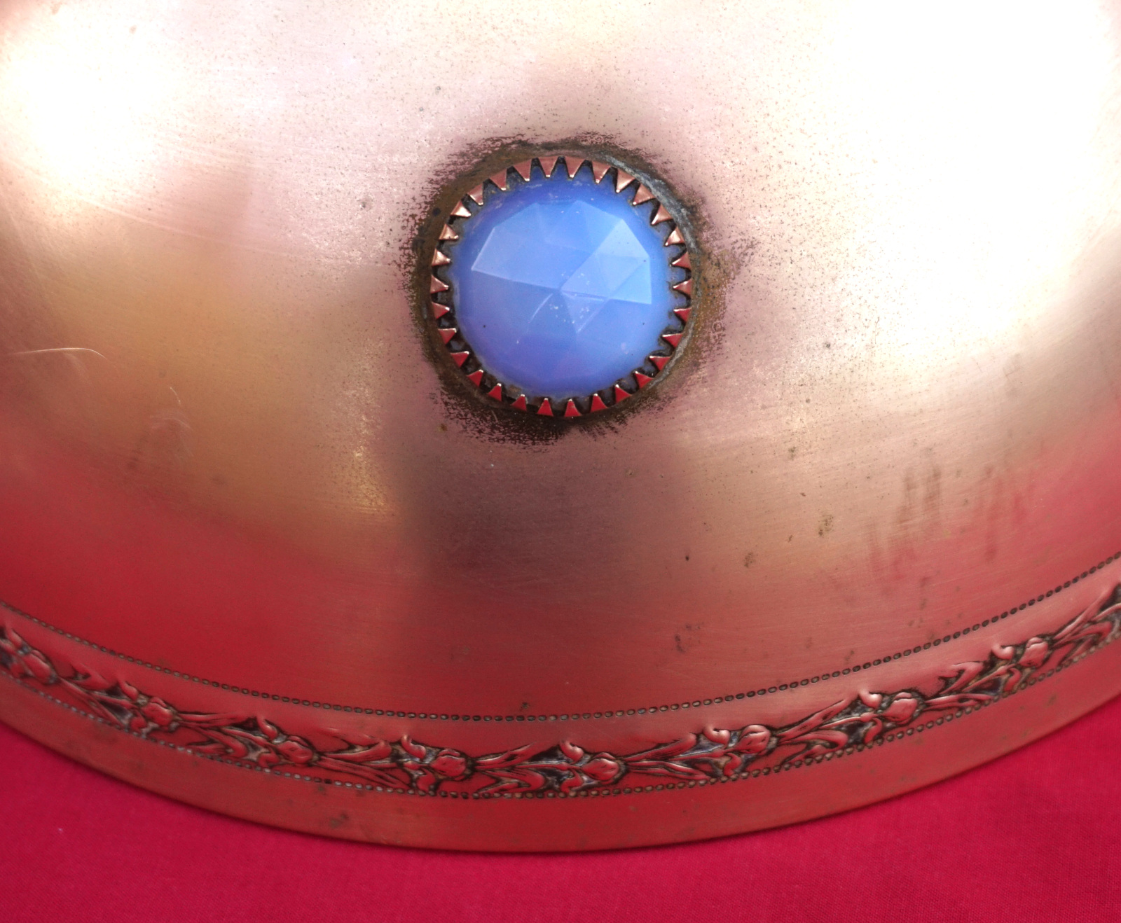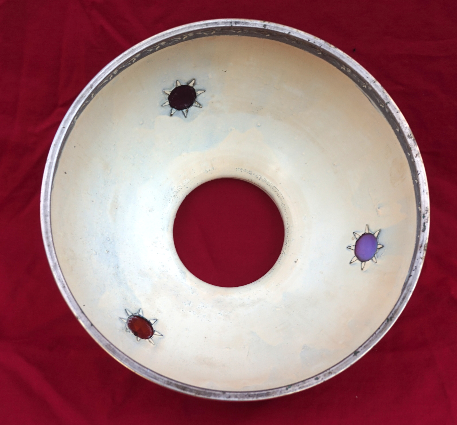 Abat-jour en laiton à cabochon de verres, vers 1900. Hauteur 11 cm, diamètre à la base 22.8 cm, diamètre au col 8.5 cm. Très bel état, intérieur peint.