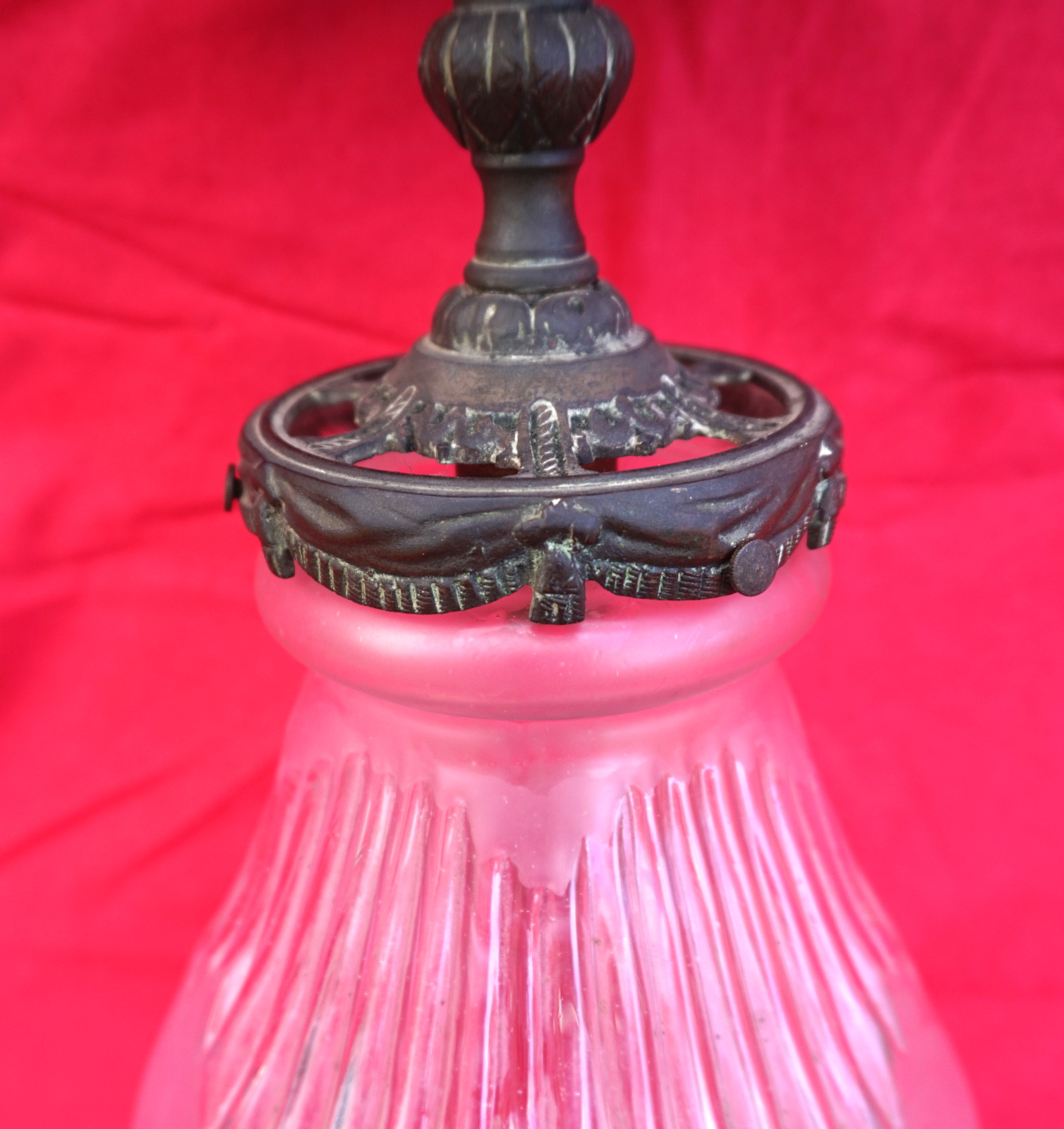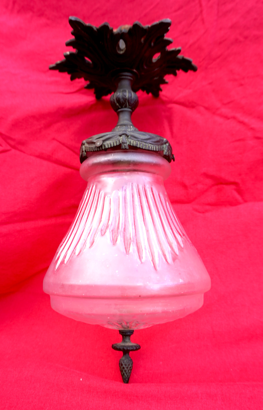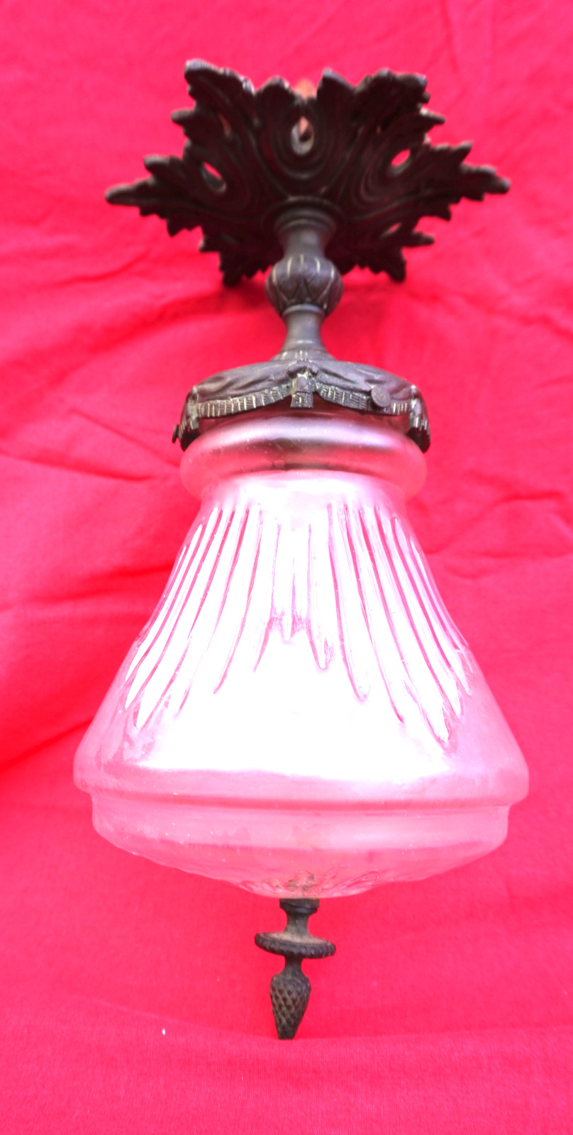 Plafonnier en bronze et verrerie en cristal taillé et dépoli, vers 1900. Hauteur 33 cm, diamètre 15.2 cm. Très bel état.
