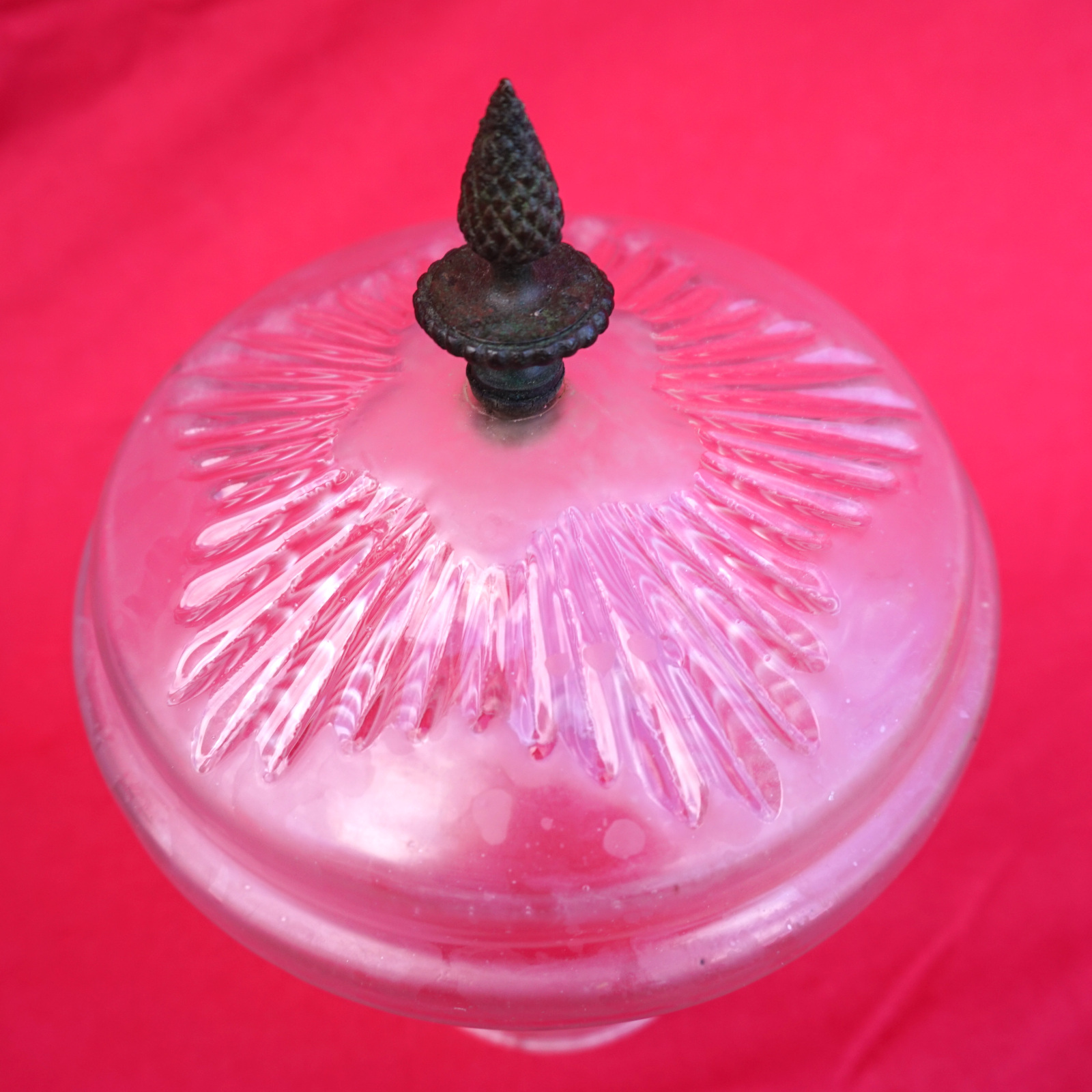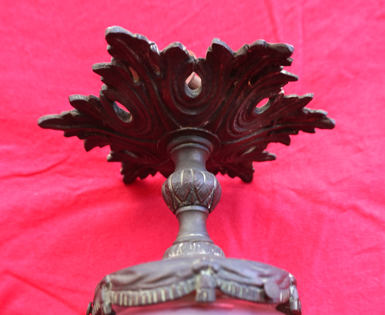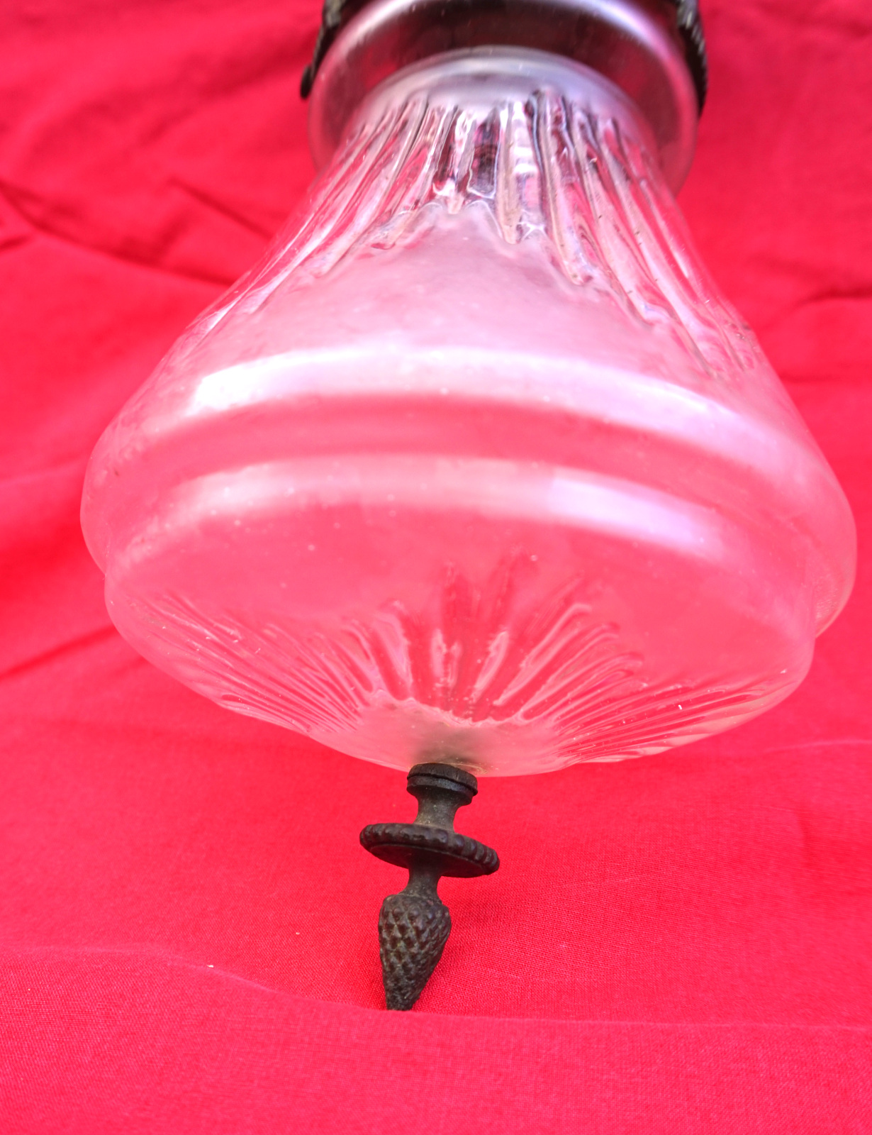 Plafonnier en bronze et verrerie en cristal taillé et dépoli, vers 1900. Hauteur 33 cm, diamètre 15.2 cm. Très bel état.