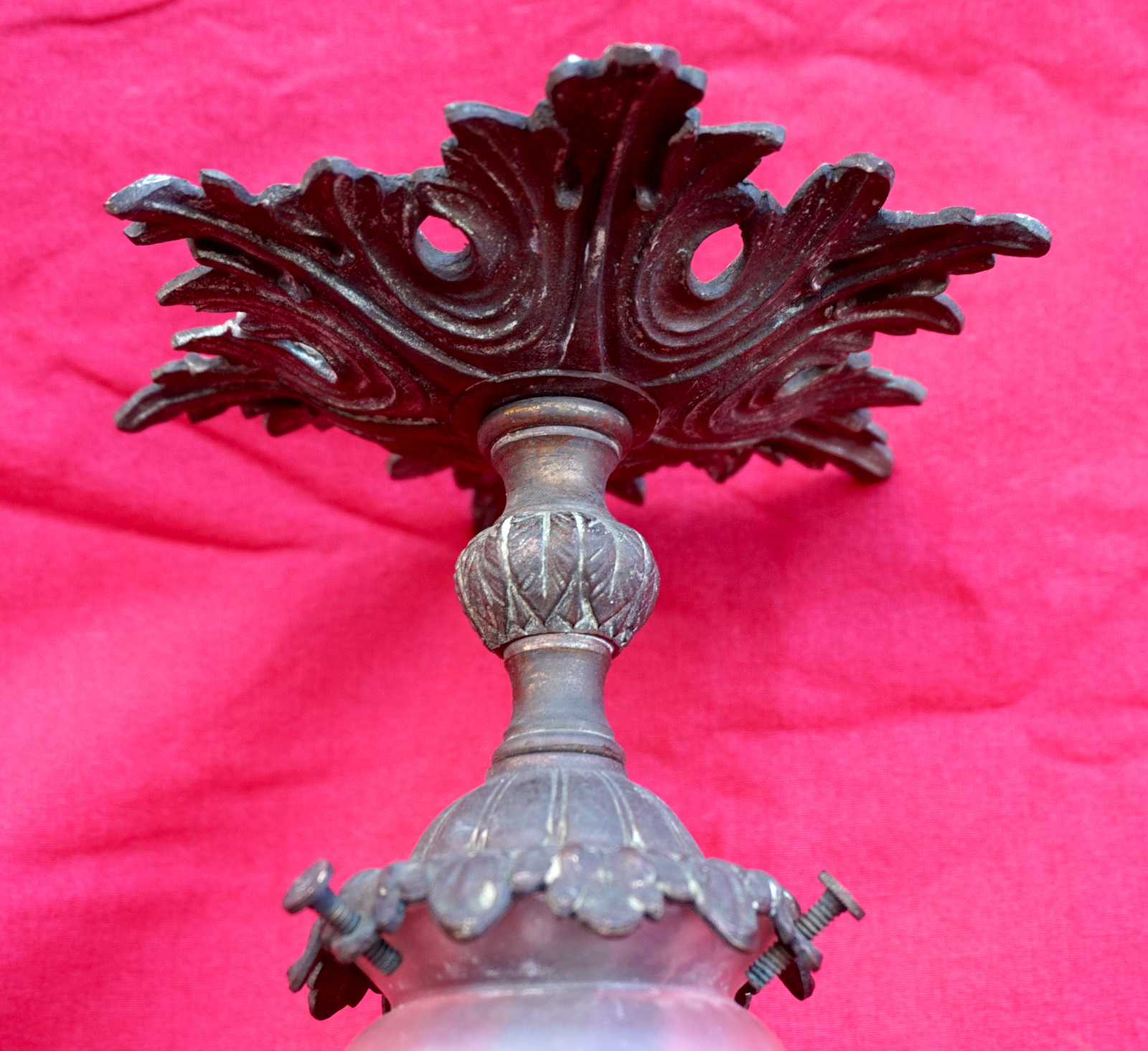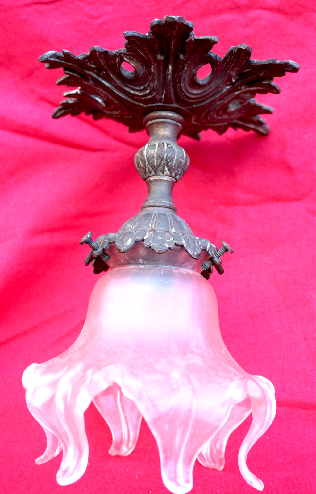 Plafonnier en bronze avec tulipe en verre dépolie vers 1900. Hauteur 20 cm, diamètre 15.2 cm. Bel état.