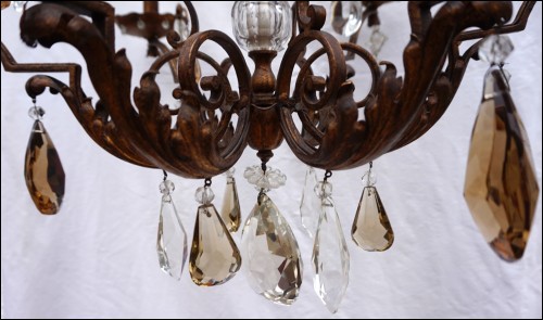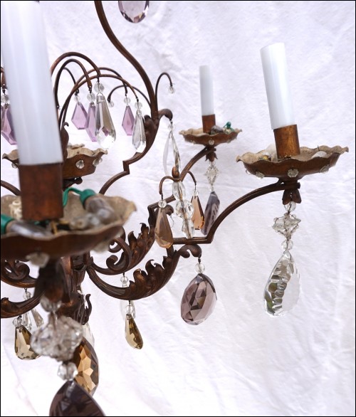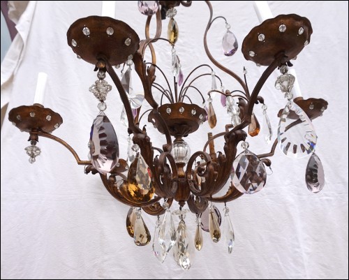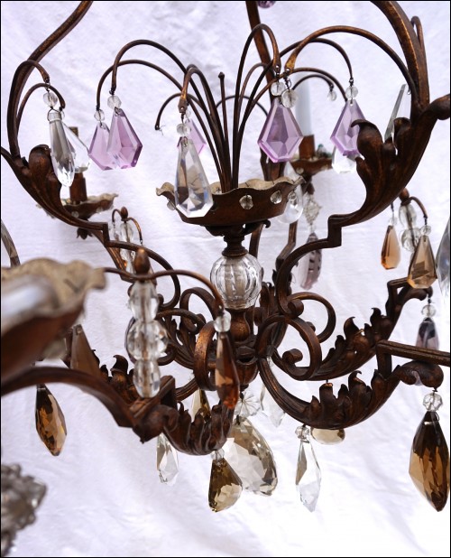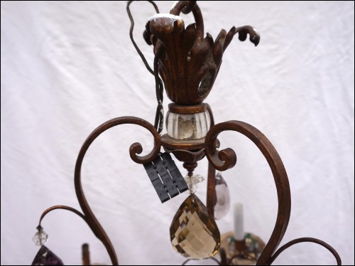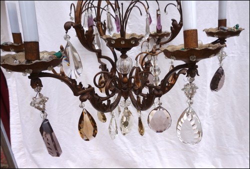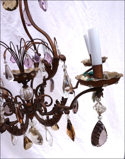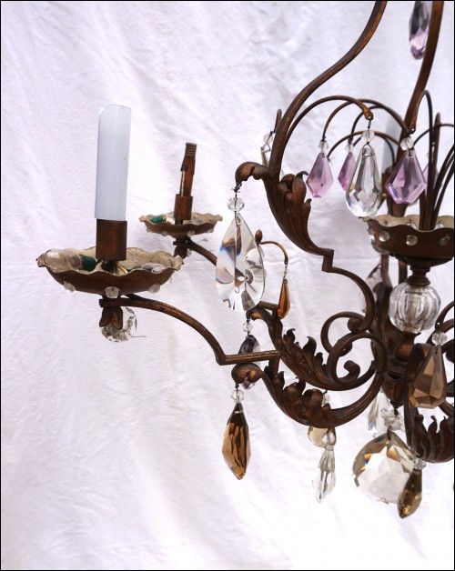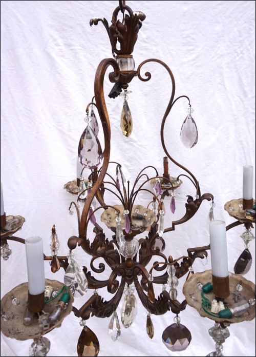 French gilt iron with large and heavy colored crystal 6 lights chandelier. 31 1/2" (80cm) height, 29" (74cm) diameter. It needs some repairs as shown by the following pictures.