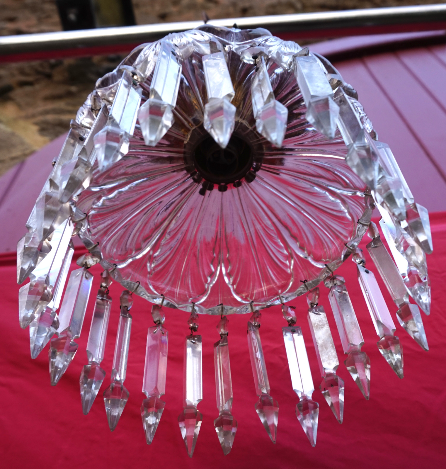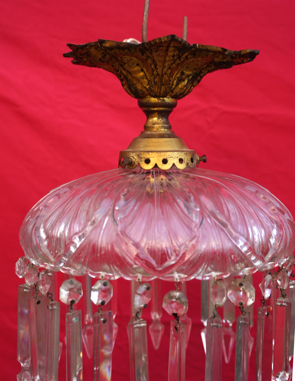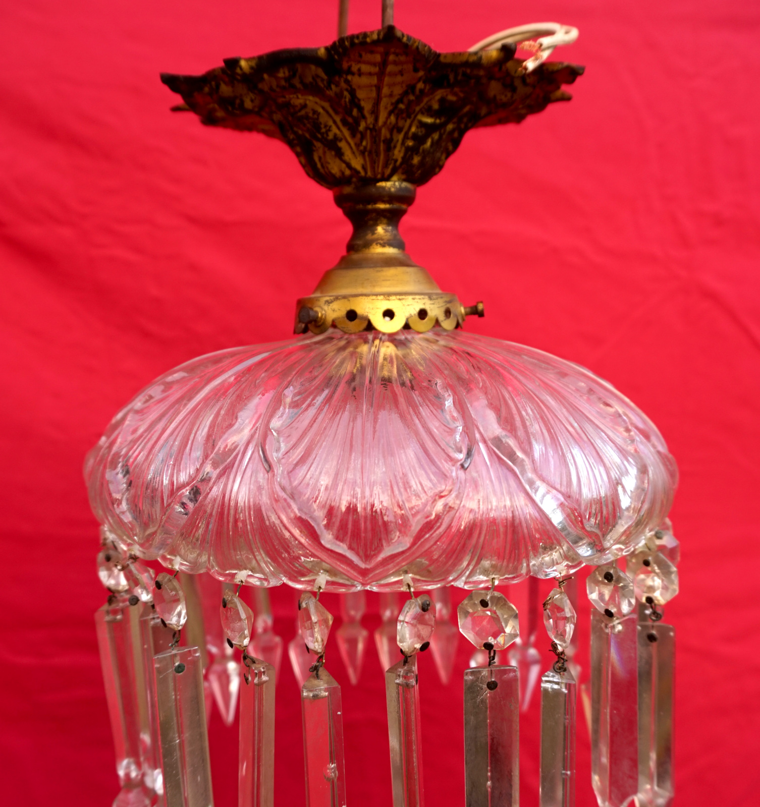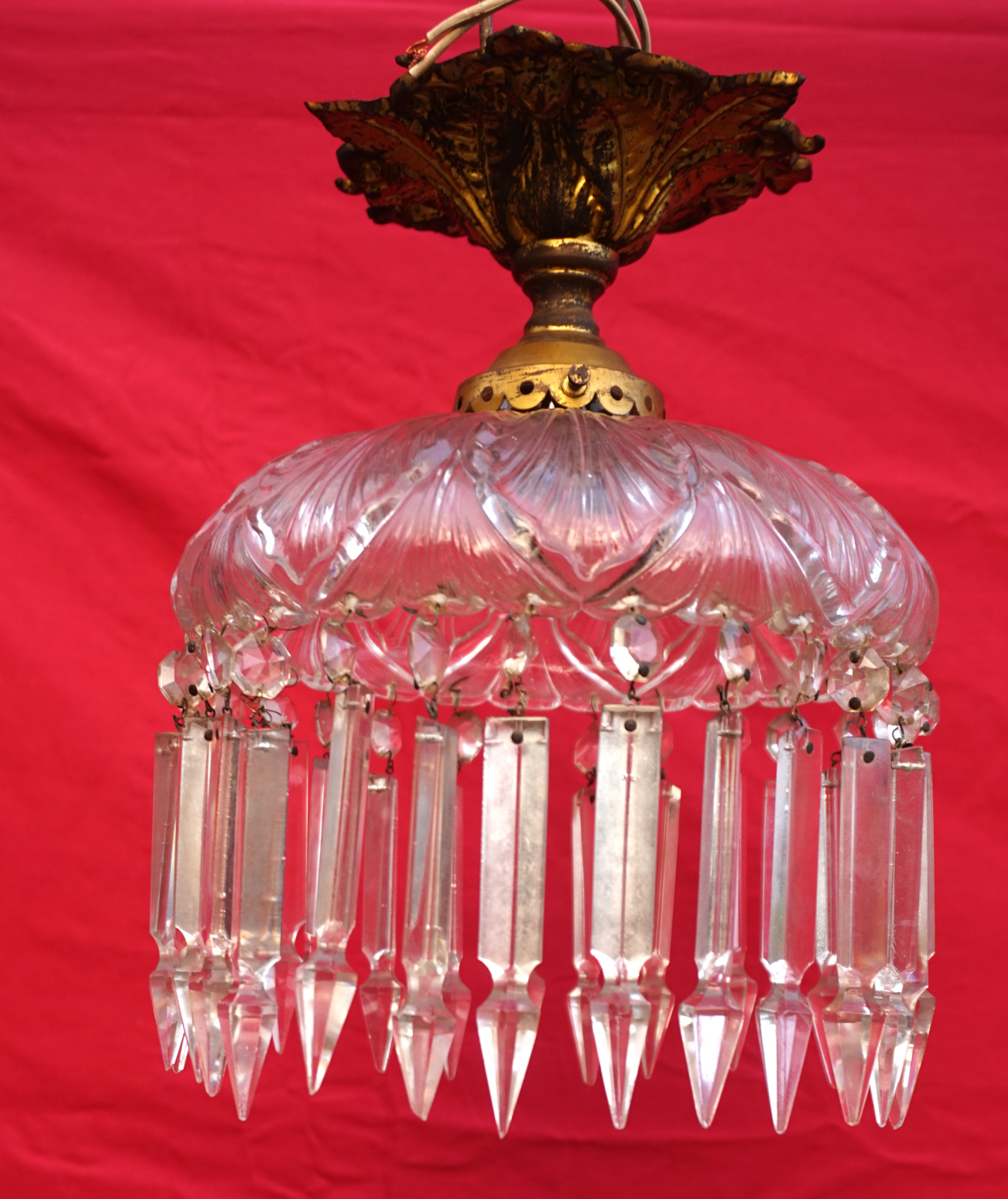 French chandelier ceiling light for 1 light with cut crystal prism pressed glass shade with gilt brass setting made duing the 1900's. 11" (28cm) height, 7 3/4" (19.7cm) diameter. Beautiful condition, it needs to be re-wiring to the standard electric, as shown by the following pictures.
