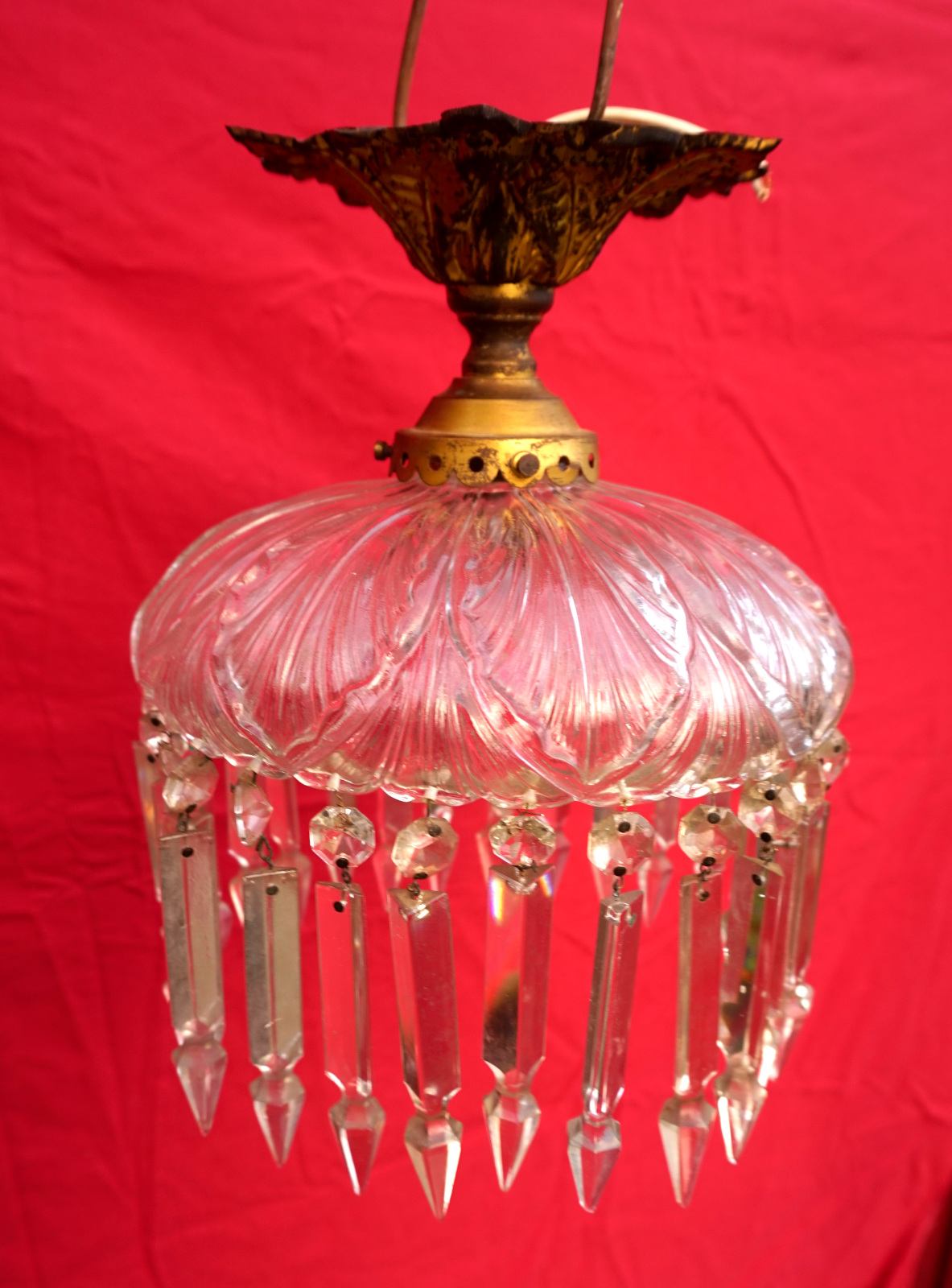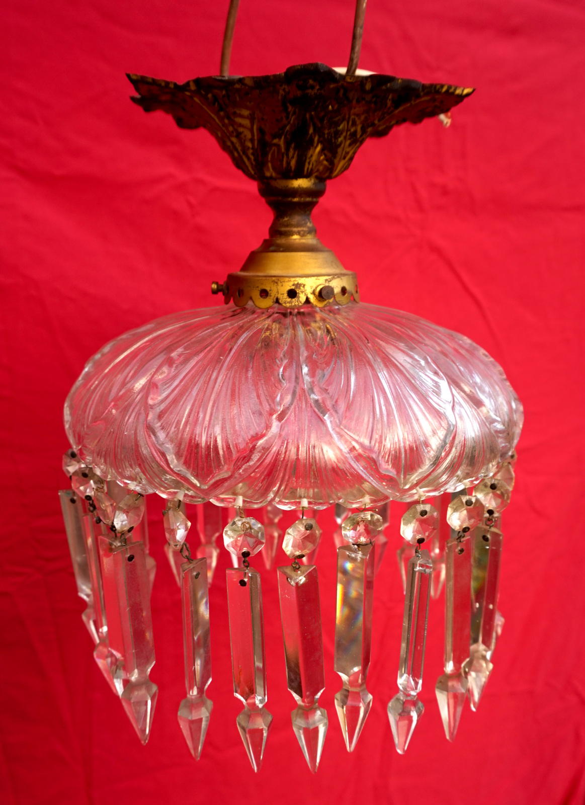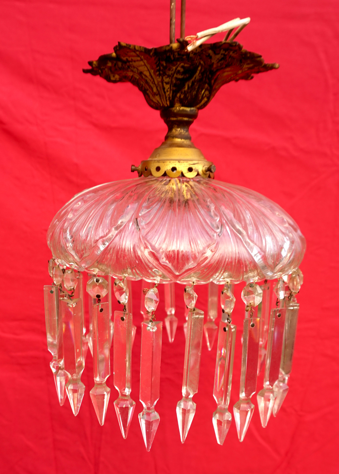 French chandelier ceiling light for 1 light with cut crystal prism pressed glass shade with gilt brass setting made duing the 1900's. 11" (28cm) height, 7 3/4" (19.7cm) diameter. Beautiful condition, it needs to be re-wiring to the standard electric, as shown by the following pictures.