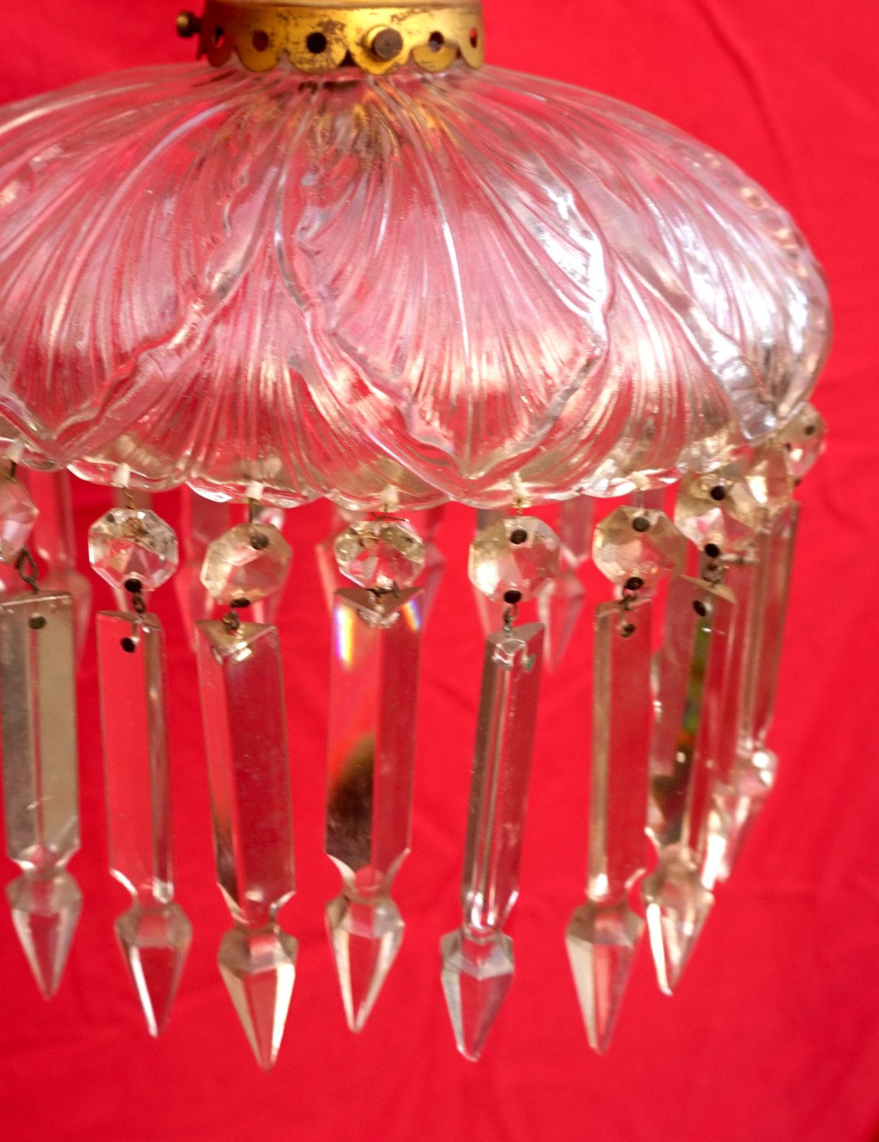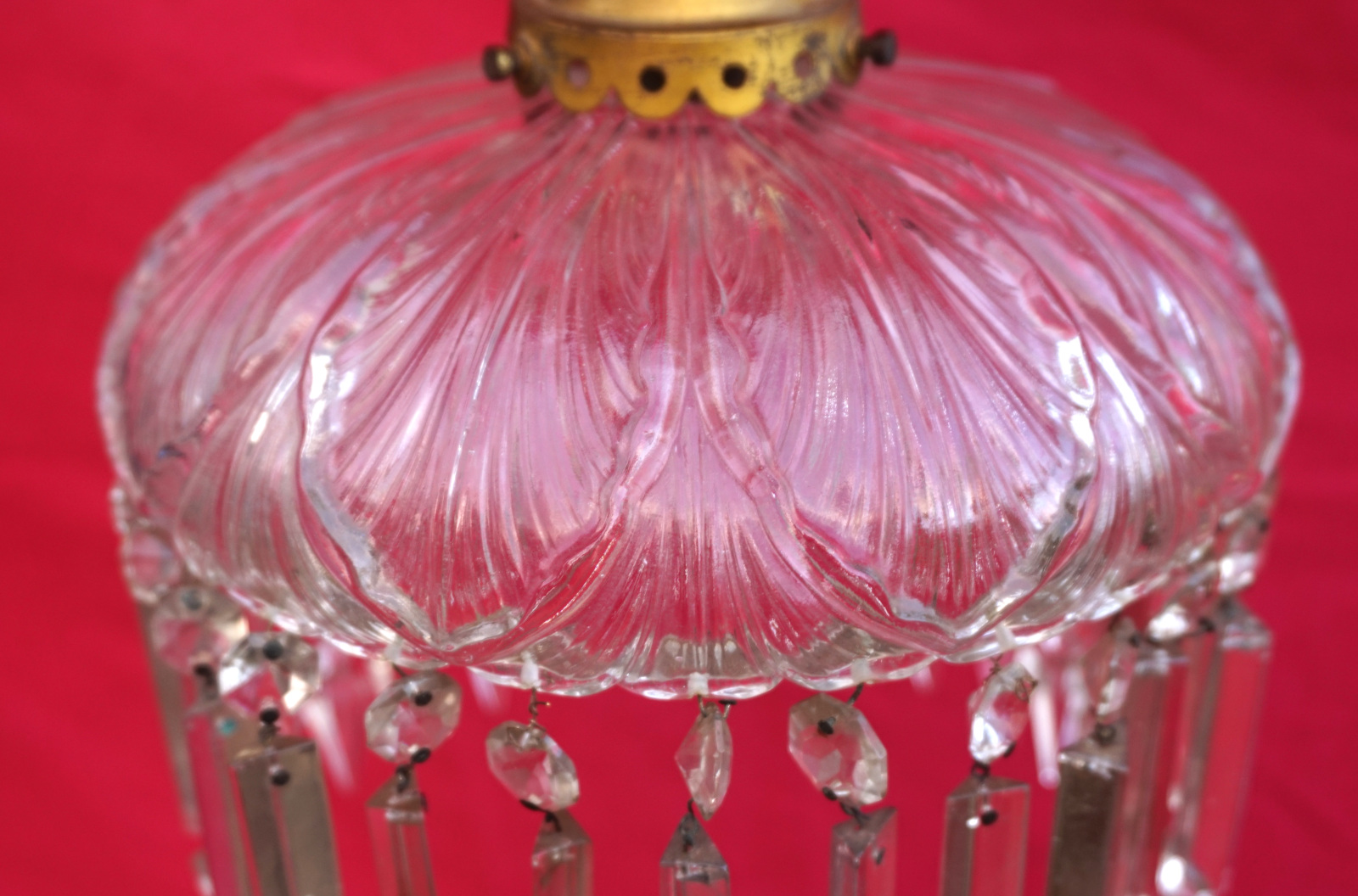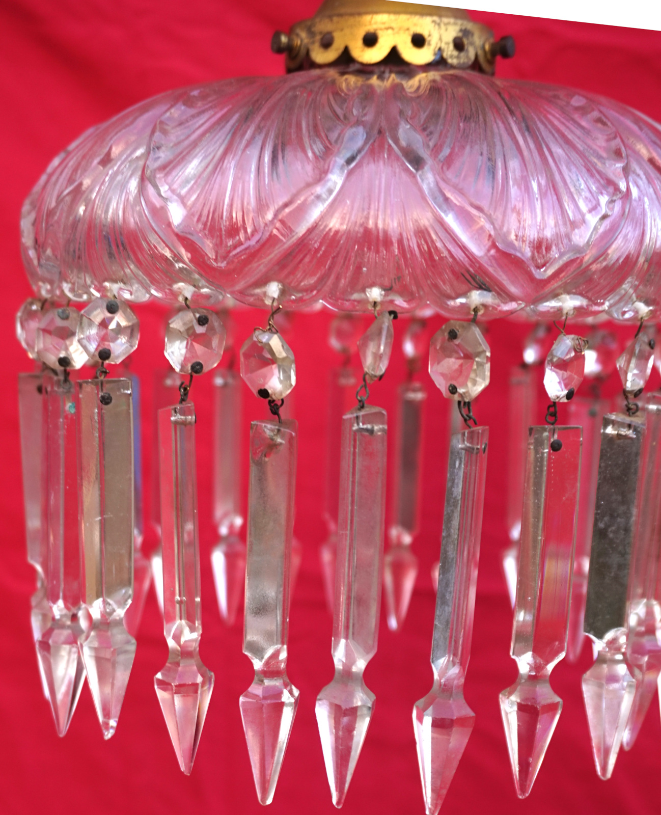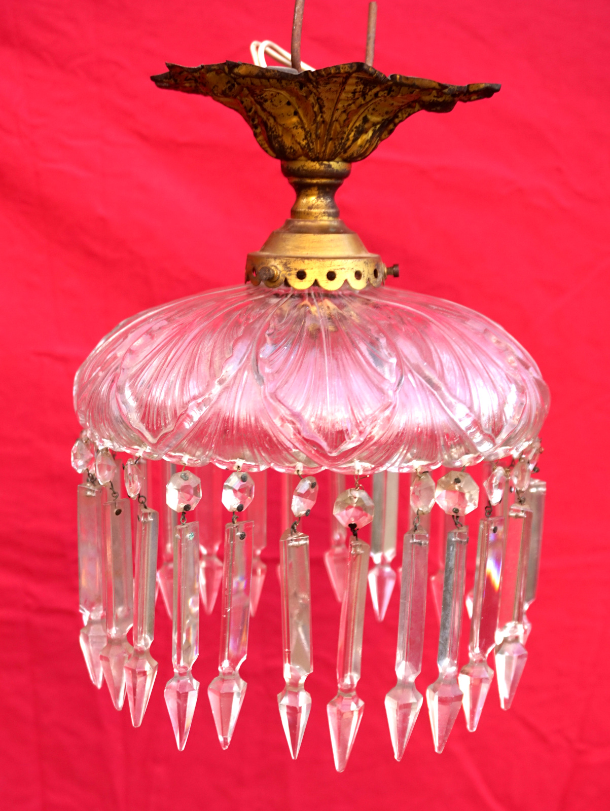 French chandelier ceiling light for 1 light with cut crystal prism pressed glass shade with gilt brass setting made duing the 1900's. 11" (28cm) height, 7 3/4" (19.7cm) diameter. Beautiful condition, it needs to be re-wiring to the standard electric, as shown by the following pictures.