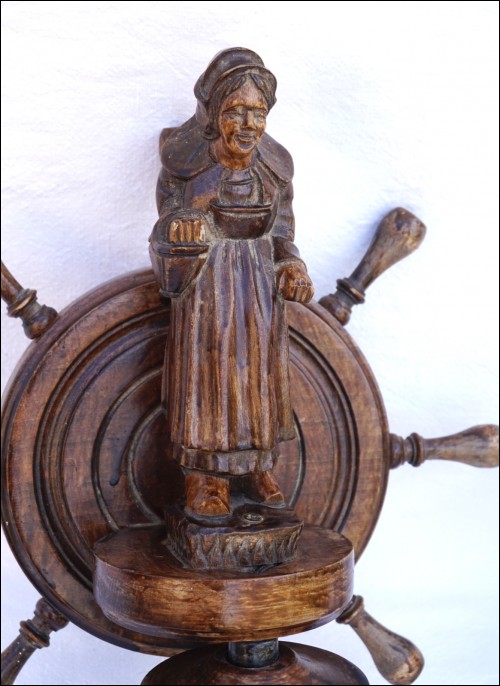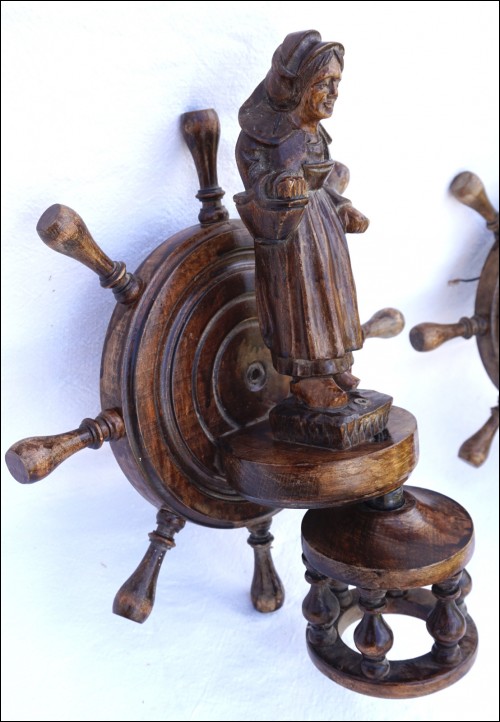 French hand carved wood pair of sconce wall light showing a couple of breton made during the mid-century near Quimper. 13 1/4" (33.5cm) height, 11 1/4" (28.5cm) width, 4" (10.2cm) depth. Good condition they need re-wiring to the US standard as shown by the following pictures.