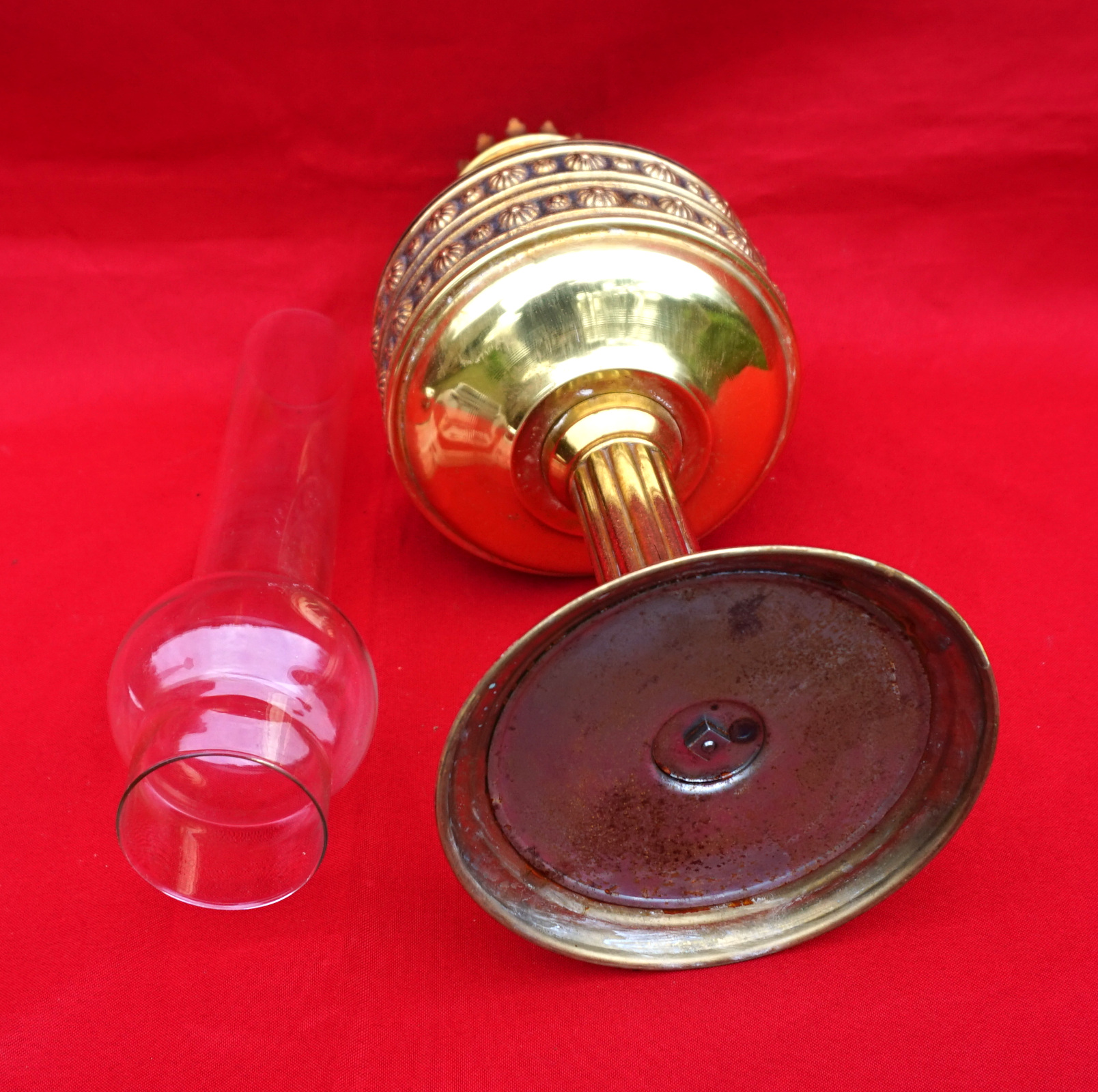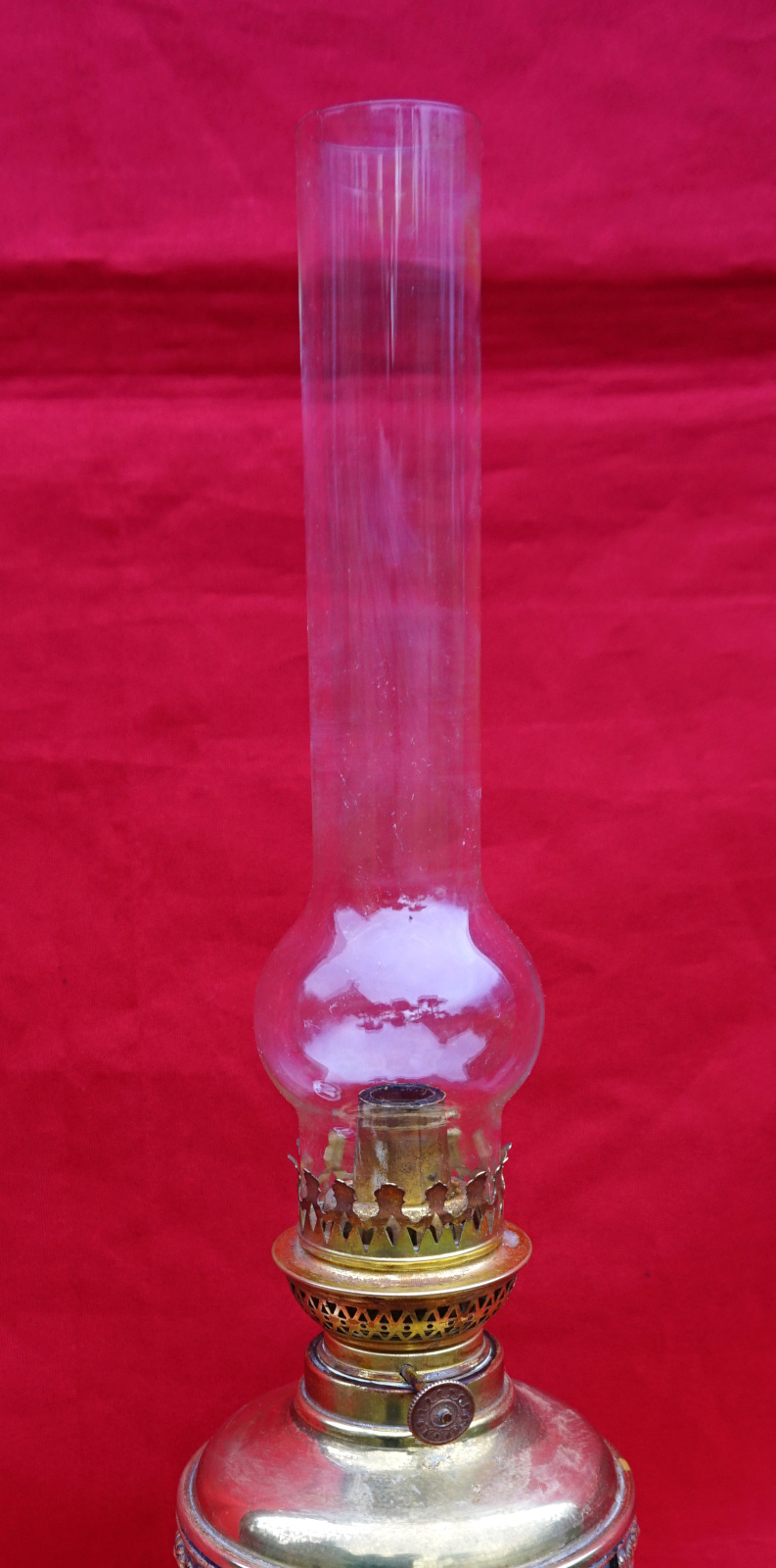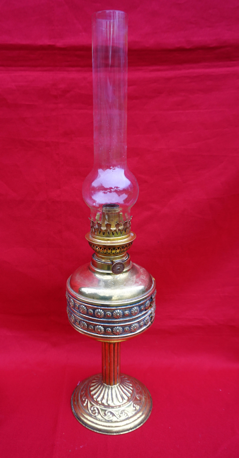 German embossed brass oil lamp with glass chimney and Kosmos burner made during the 1920's. 22" (56cm) total height with glass, 12 1/4" (31cm) lamp base height, 5 3/8" (13.5cm) diameter to the body. Perfect condition.