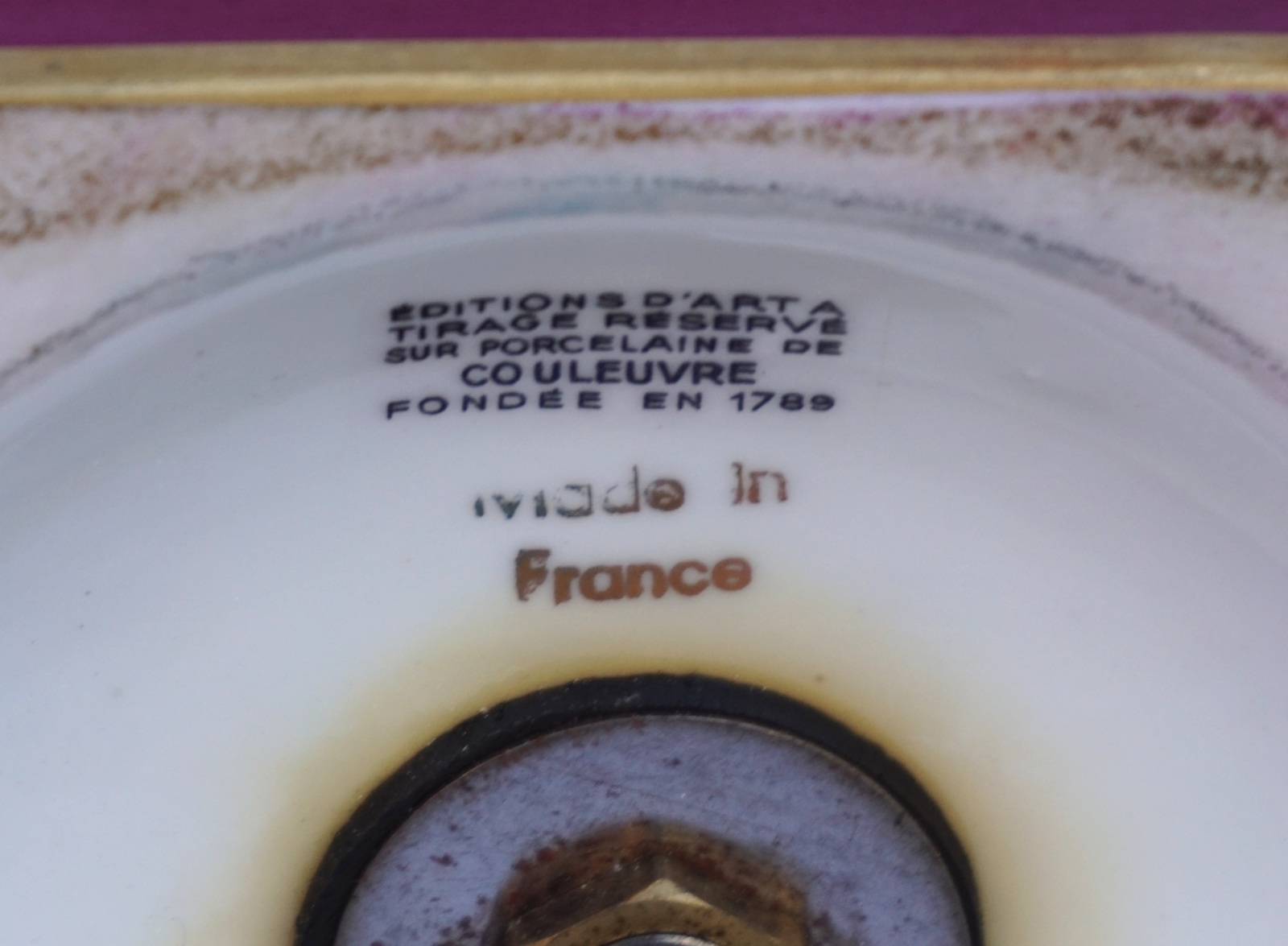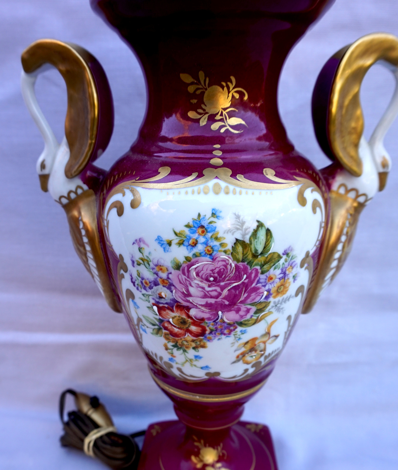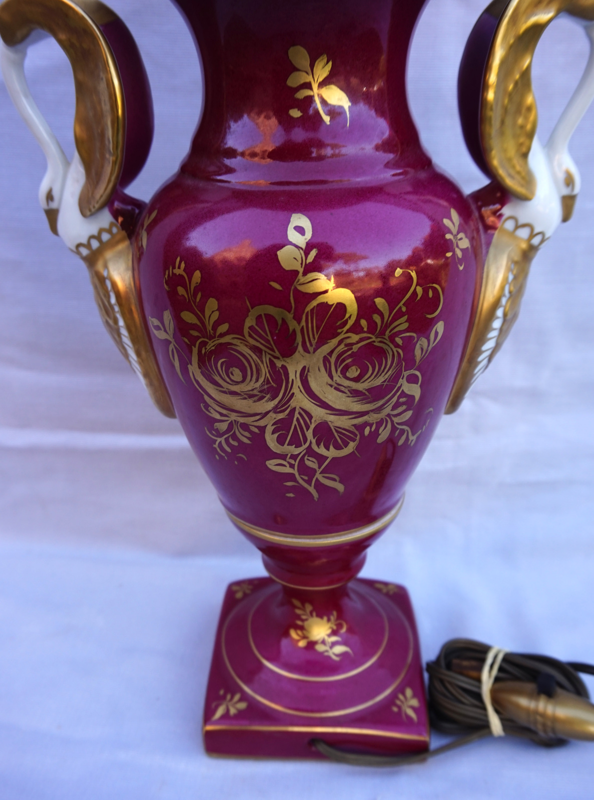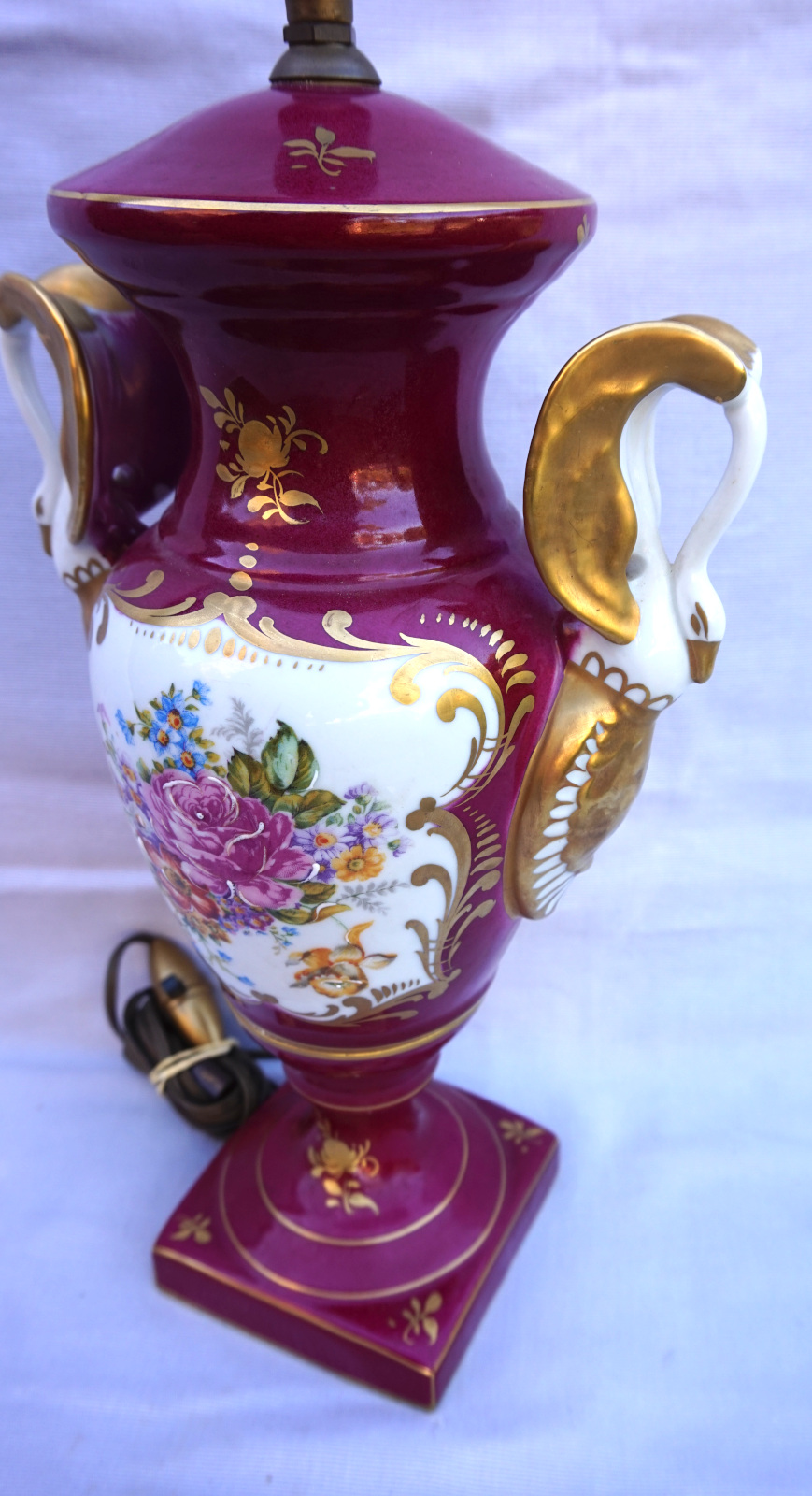 Pied de lampe en porcelaine de Couleuvre de style Empire sur un fond bordeaux un bouquet de fleurs en madaillon et ornée de deux cygnes , milieu XX° siècle. Signée sur son fond. Hauteur 40.5cm, largeur aux anses 20.3cm. Très bel état, l'électrification est à reprendre.