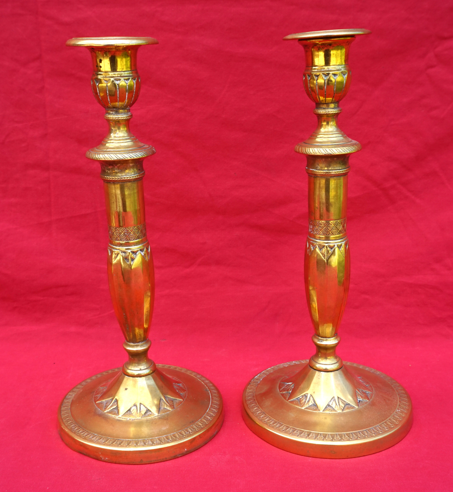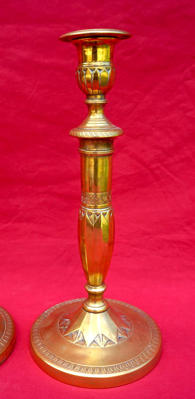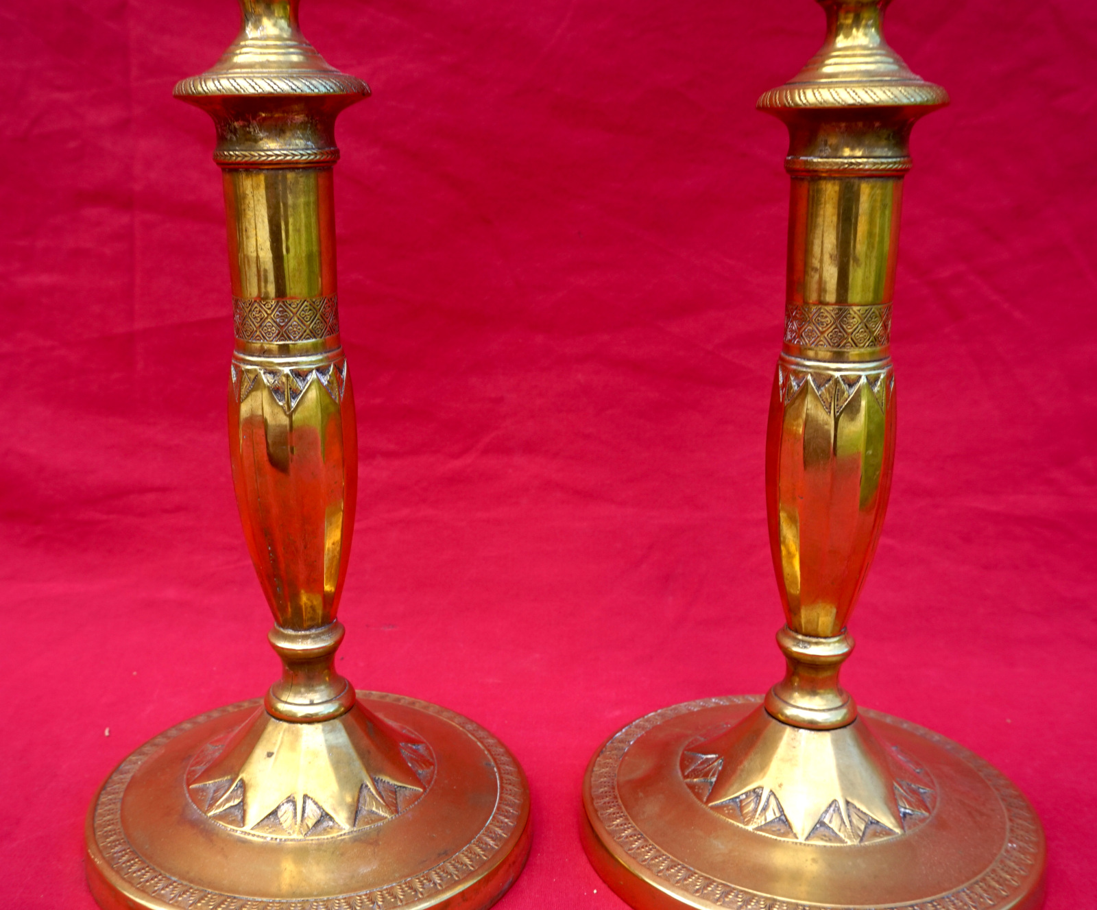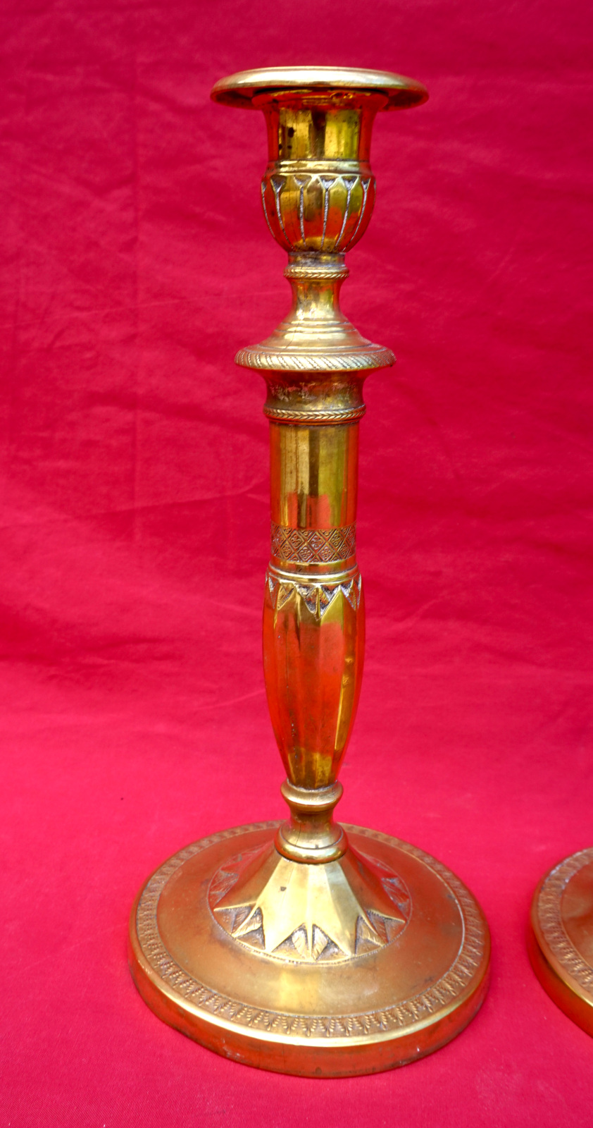 English gilt brass pair of candlestick with guilloche made late 18th century, Adams area. 11 3/8" (29cm) height, 5 1/8" (13cm) diameter to the base, weight 2.81lb (1.275 kilograms). Beautiful condition.