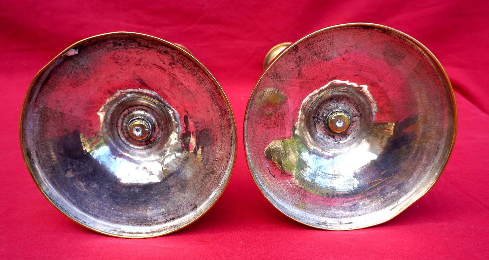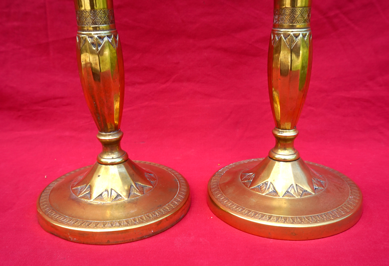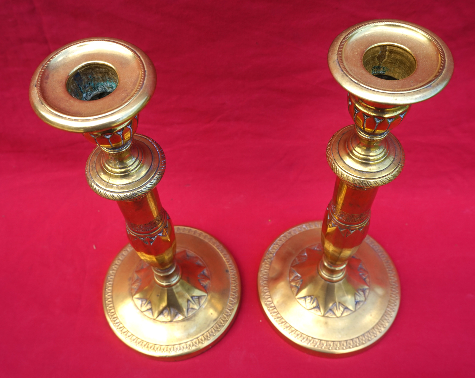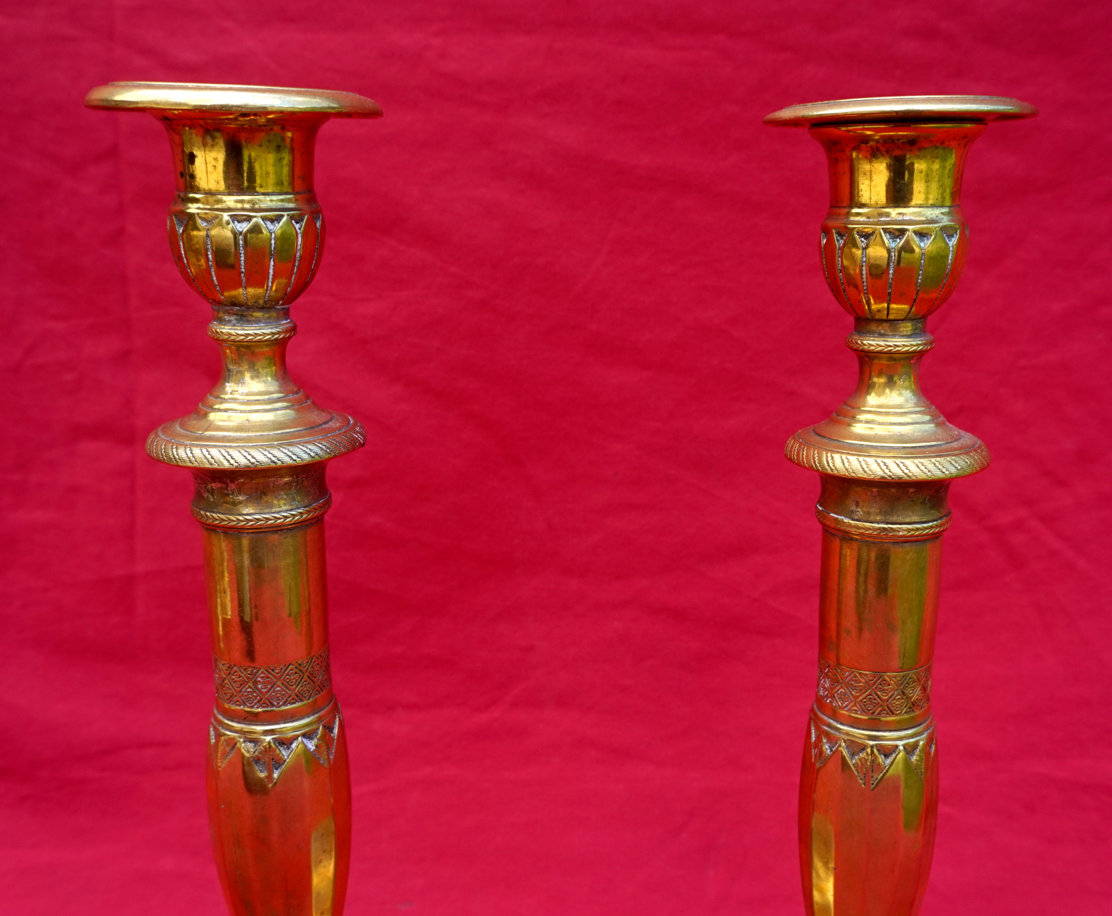 English gilt brass pair of candlestick with guilloche made late 18th century, Adams area. 11 3/8" (29cm) height, 5 1/8" (13cm) diameter to the base, weight 2.81lb (1.275 kilograms). Beautiful condition.