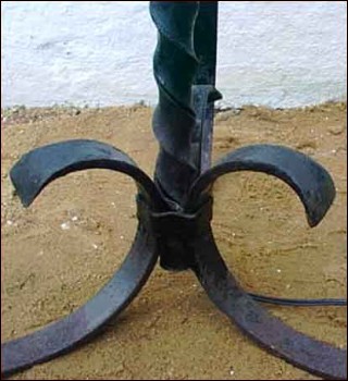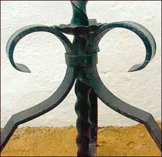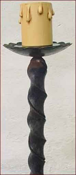 Lampadaire électrifié en forme de bougeoir, vers 1960. Travail de compagnon ferronnier en fer battu et forgé à la main. Il manque juste la prise pour le branché, il est équipé à la norme US. Il est en bon état. Hauteur 137 cm, diamètre 50 cm.