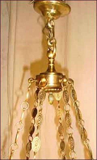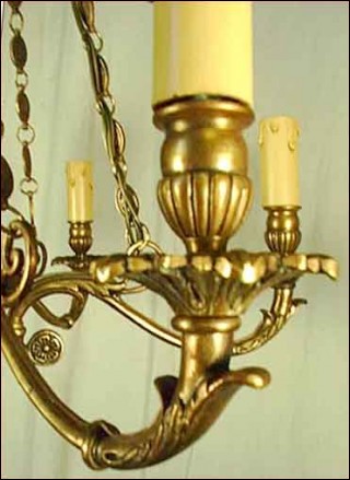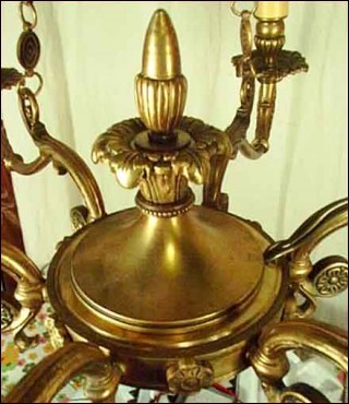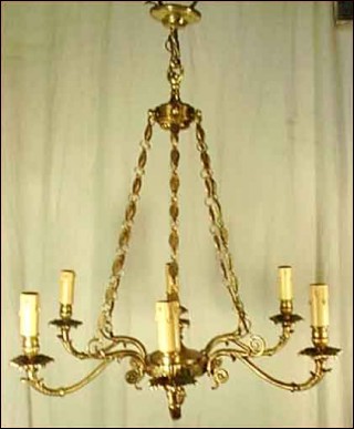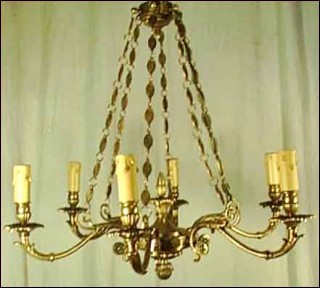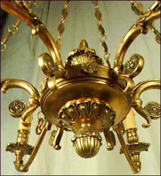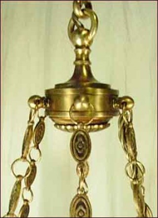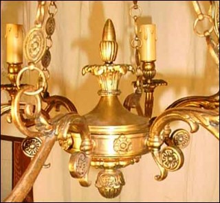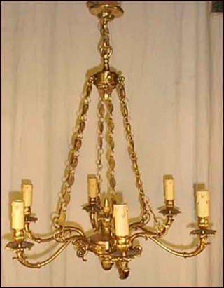 Lustre en bronze de style Empire à six lumières, de trente ans d'age. Il est composé d'une urne à six branches, suspendue par des chaînes à décors de piastres. Il est à double éclairage et à la norme d'électrification américaine. Hauteur 76 cm, diamètre 64 cm.