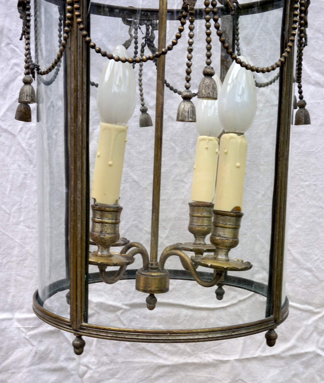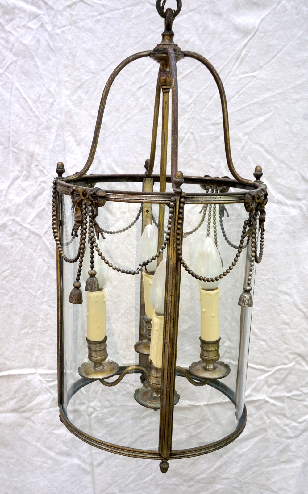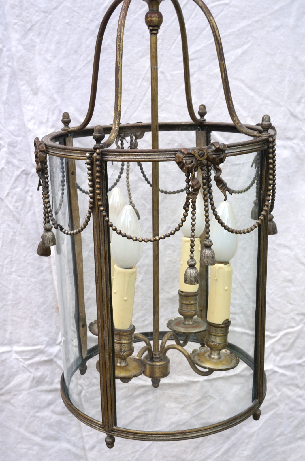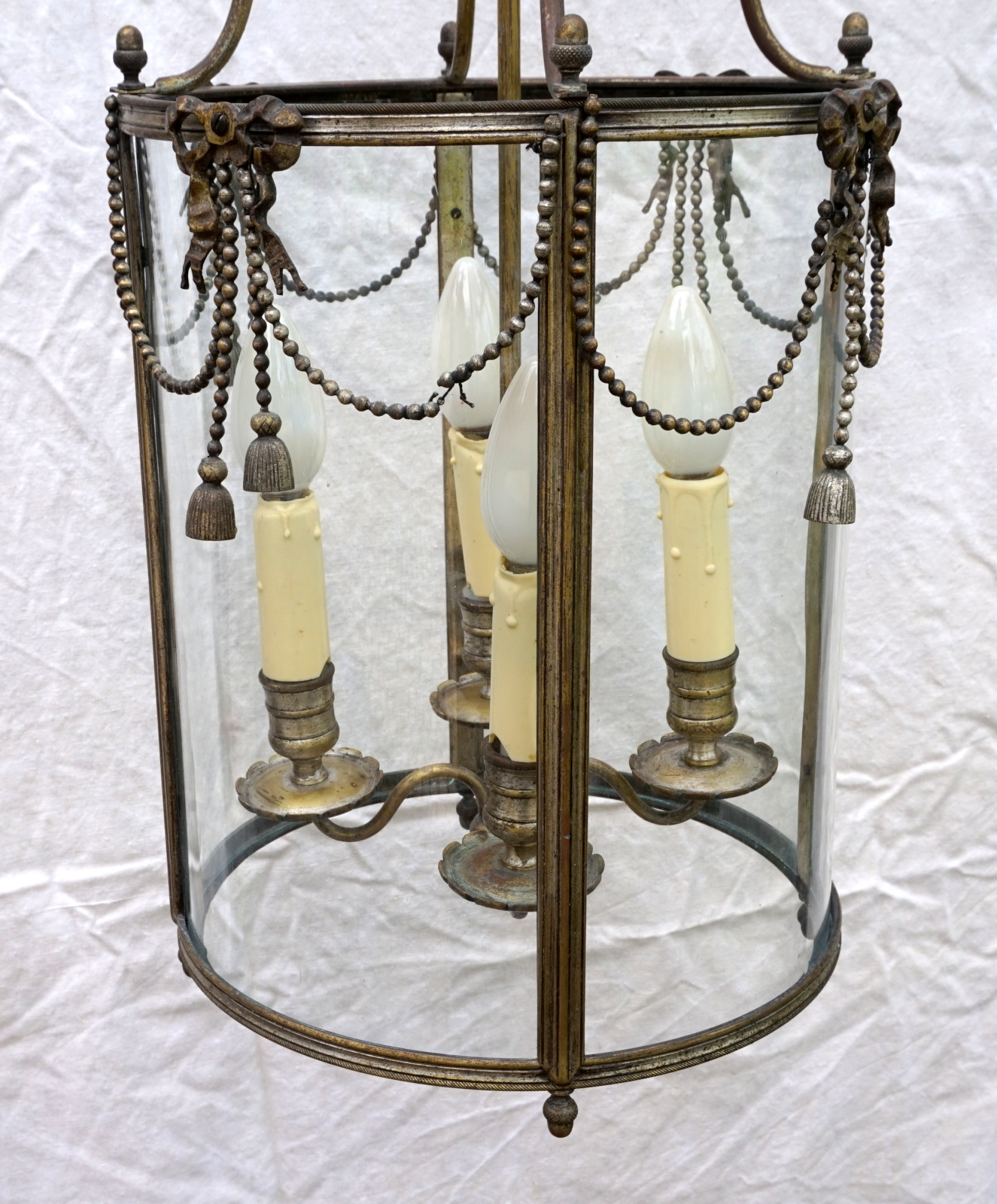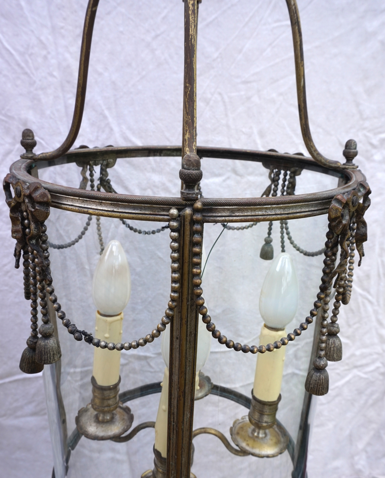 French Louis XVI hall lantern with 4 lights in silvered bronze with ribbons and pompoms made by MDV during the 1930's. It's signed inside. 23 3/4" (60.5cm) total height, 21 5/8" (55cm) shaft height, 11" (28cm) diameter. Good condition a corner of glass broken, a pompom missing and a few repairs on the pearl ribbons.