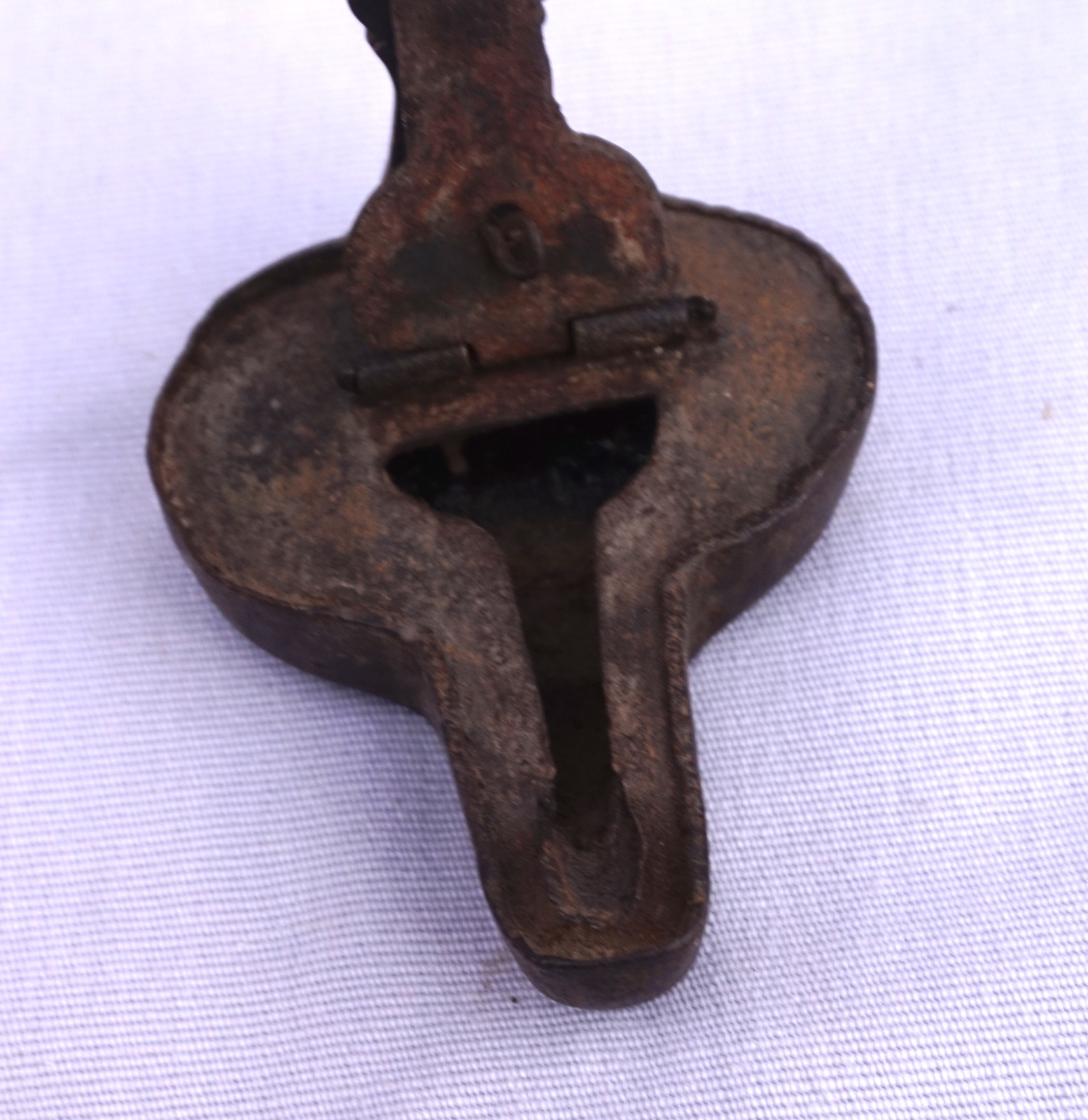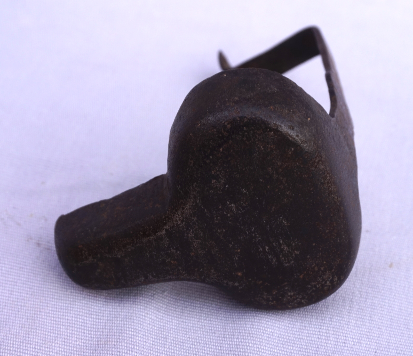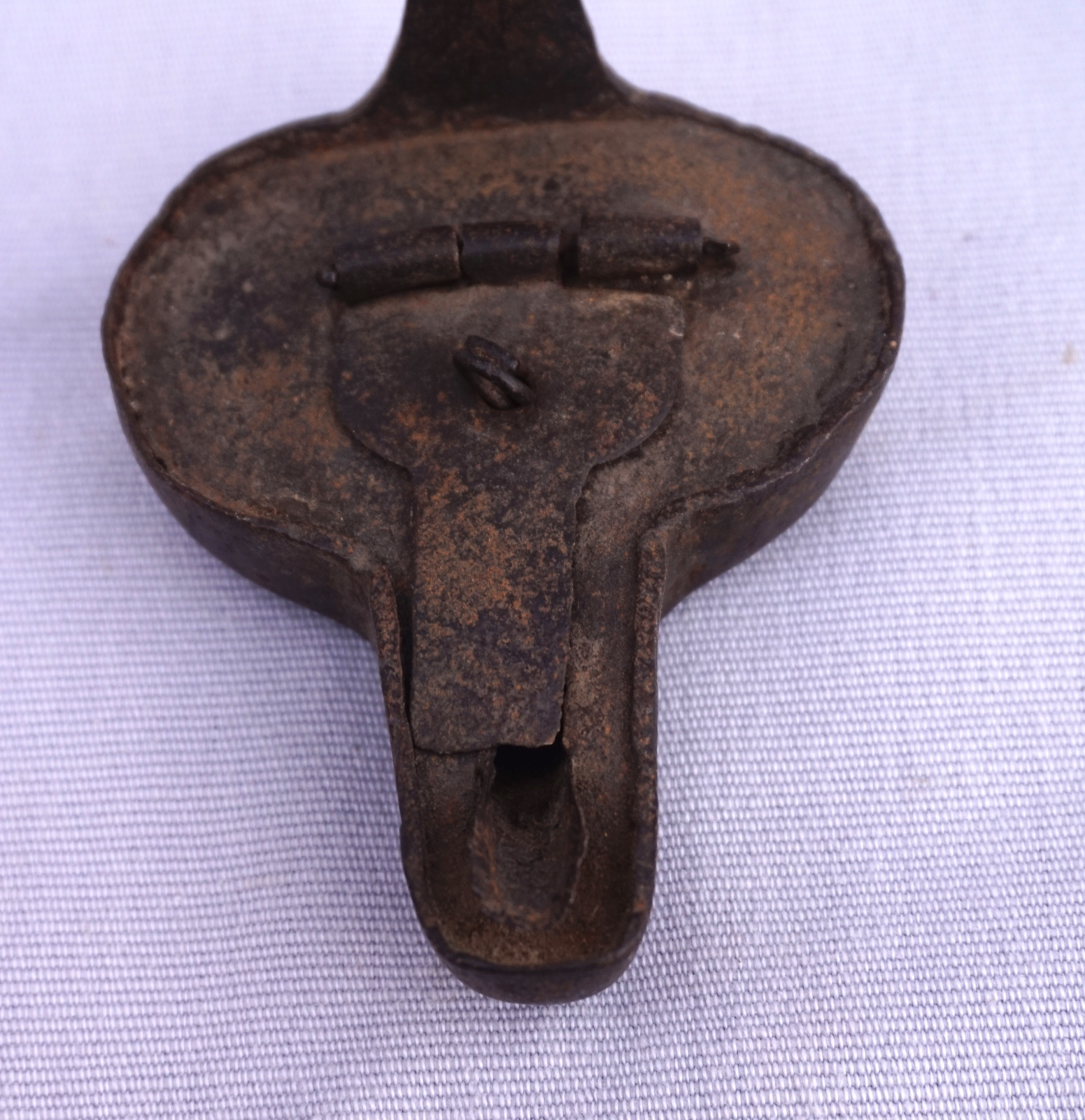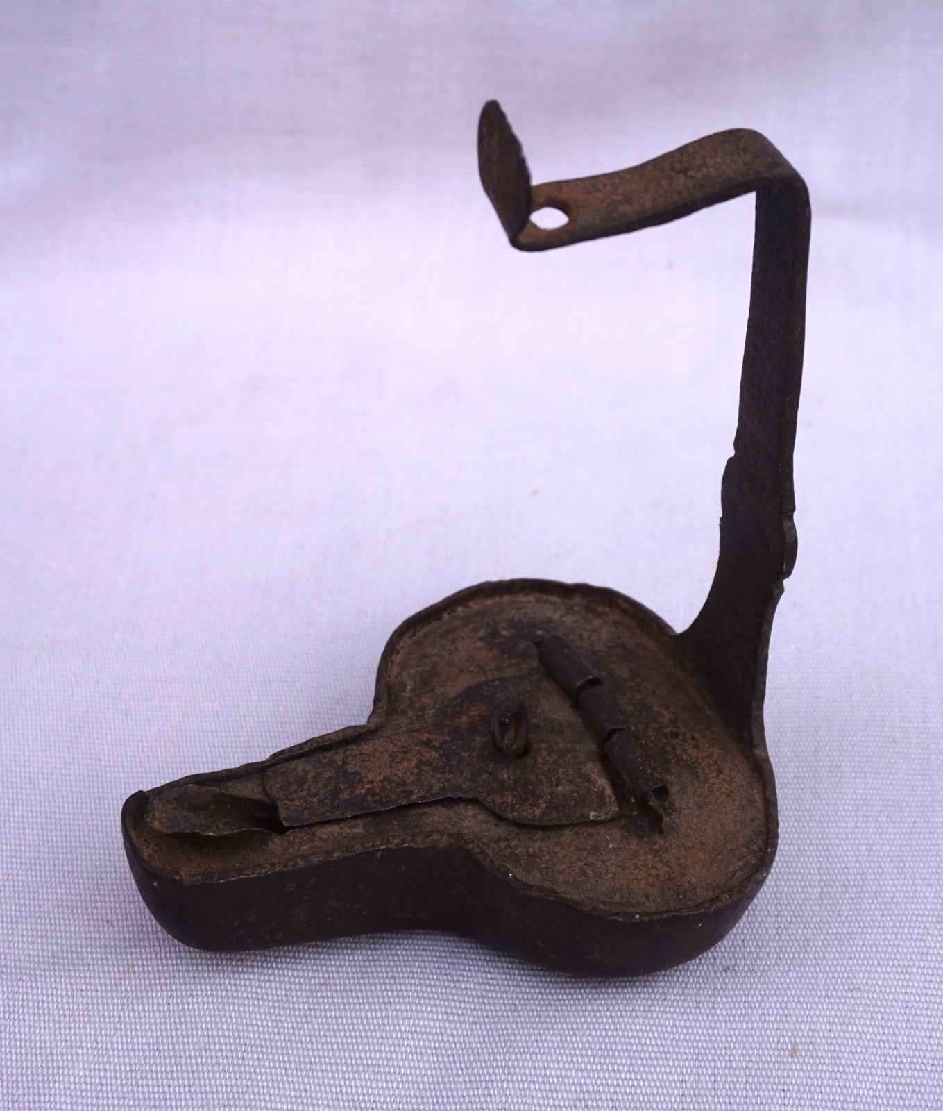 Lampe à huile de mineur en fer forgé à suspendre, dite grenouille, XVIIIème siècle. Longueur 7.6 cm, largeur 9.5 cm width, hauteur 12.7cm. Bel état.