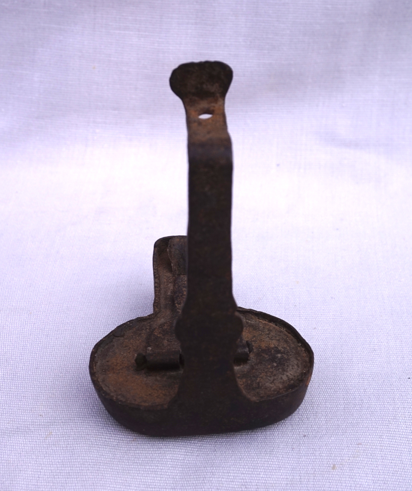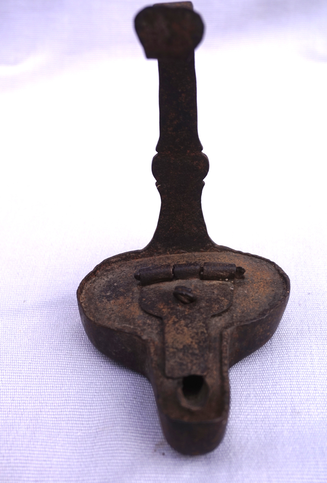 German pit worker hanging oil lamp in hand working wrought iron made during the 18th century. 5" (12.7cm) height, 3"(7.6cm) width, 3 3/4" (9.5cm) depth. Good condition.