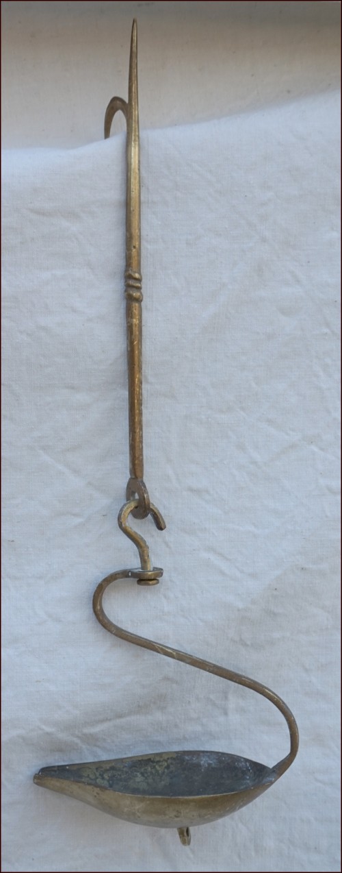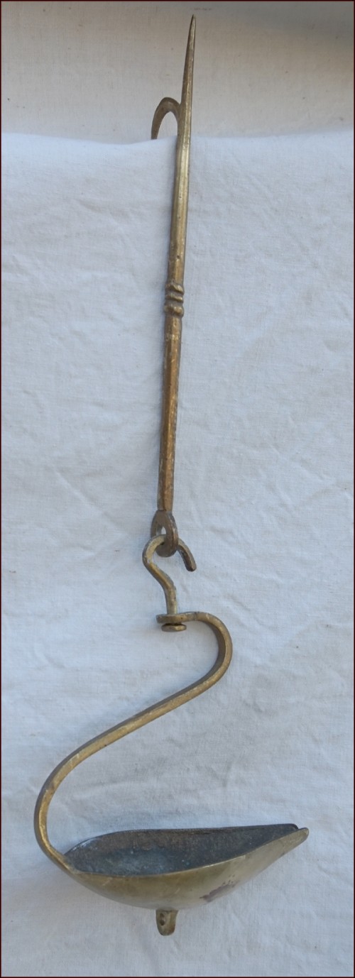 Lampe à huile en laiton dite Crasset, début XXe siècle . Le crasset à perdu son ramasse goutte, il se suspend avec un crochet en hameçon. Très bel état. Hauteur 40 cm, longueur 13,5 cm.