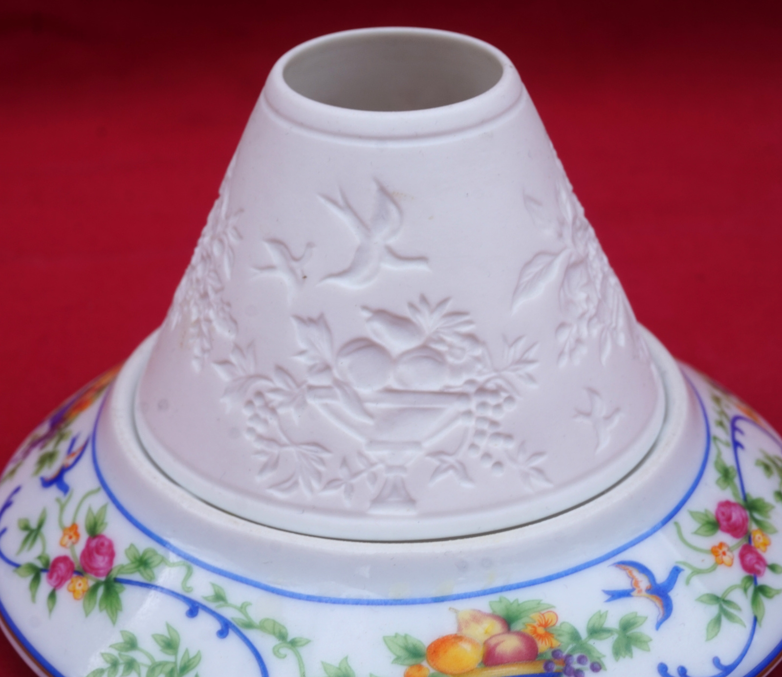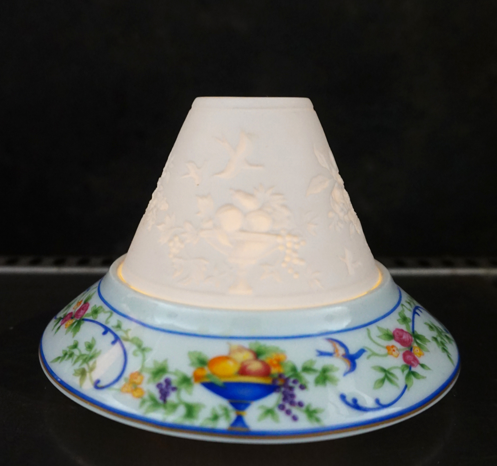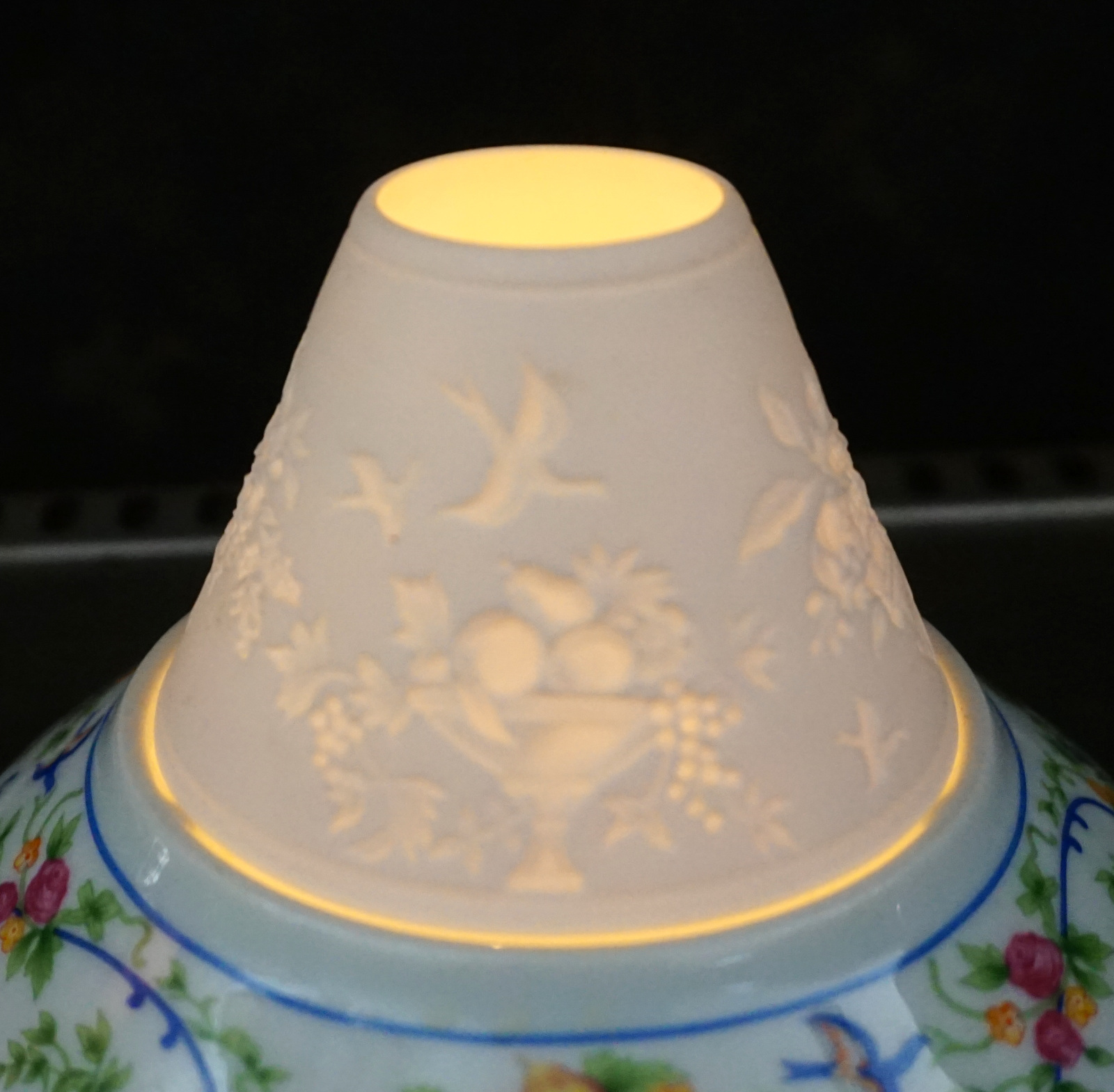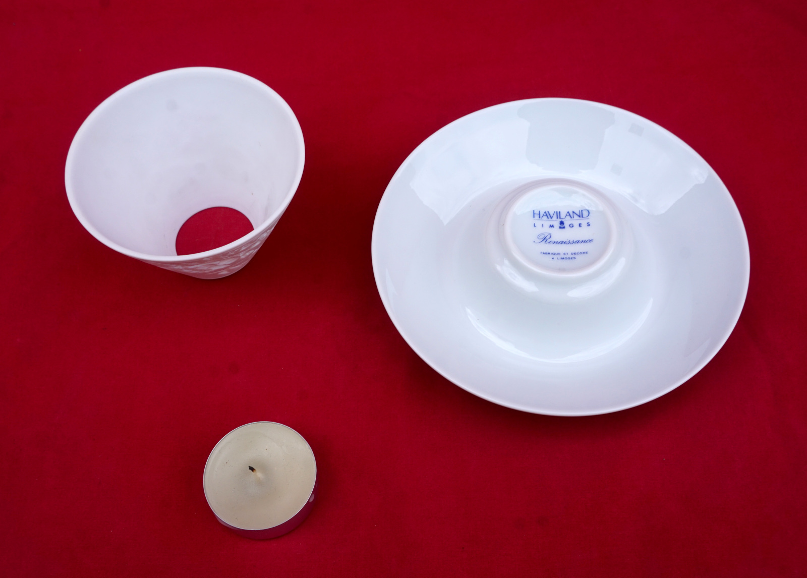 Veilleuse à bougie en porcelaine, décorée par transfert et lithophanie, modèle Renaissance par Haviland Limoges. Elle est signée sur son fond. Diamètre 13.7 cm, hauteur 8.5 cm. Parfait état.