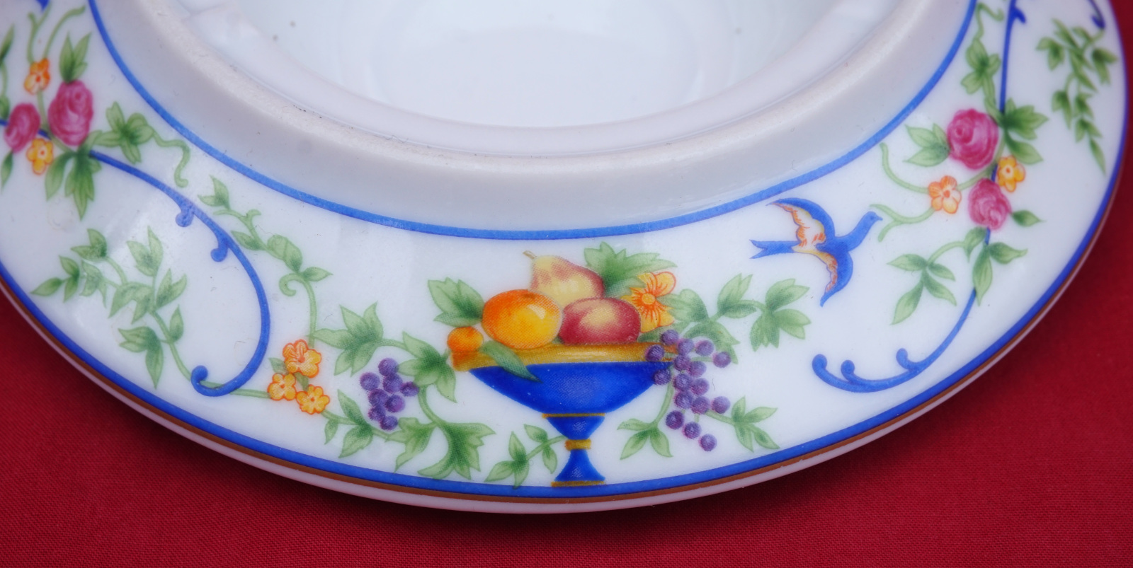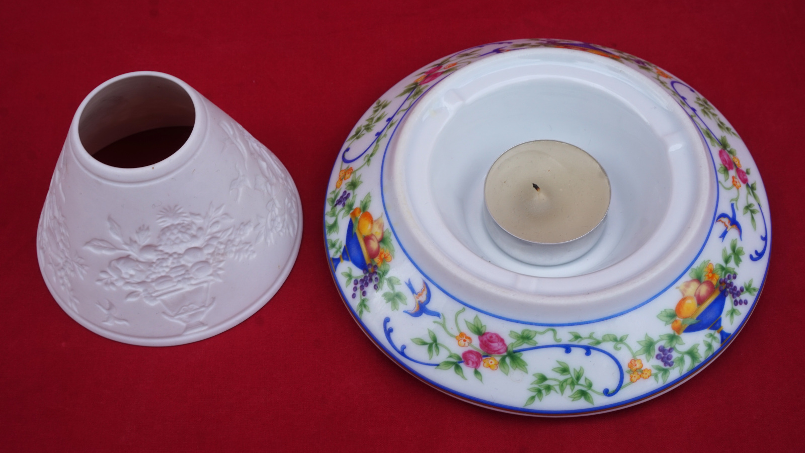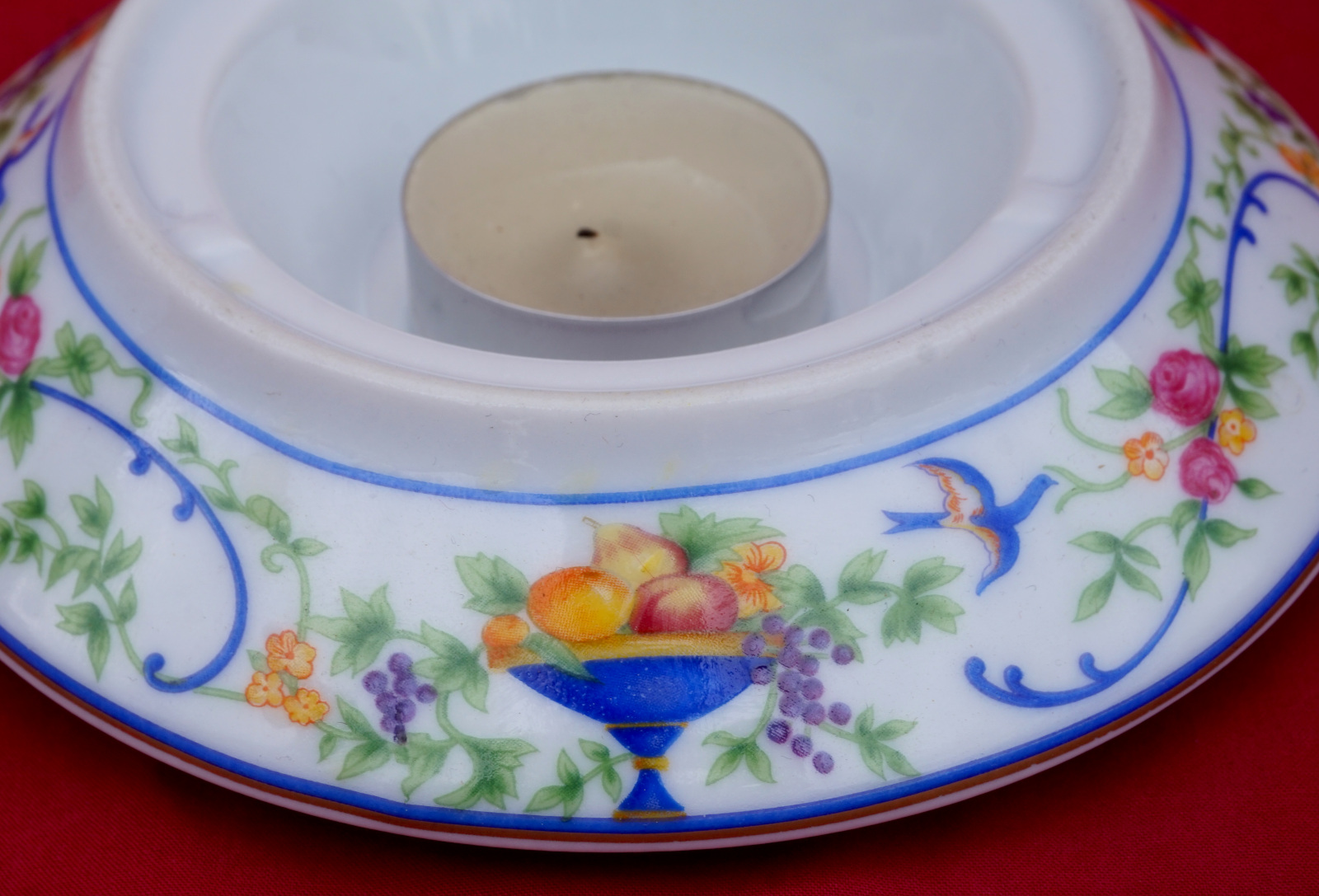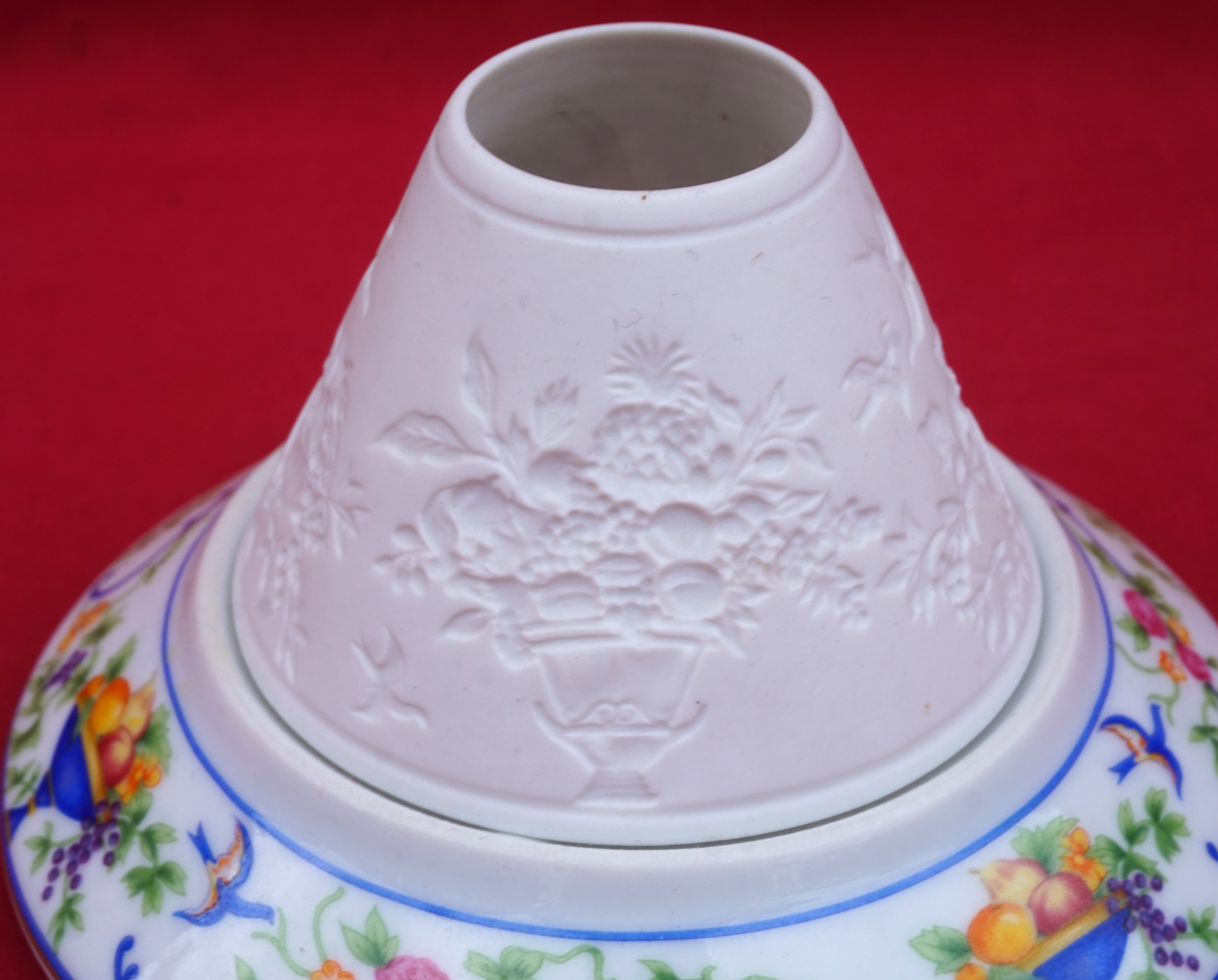 Veilleuse à bougie en porcelaine, décorée par transfert et lithophanie, modèle Renaissance par Haviland Limoges. Elle est signée sur son fond. Diamètre 13.7 cm, hauteur 8.5 cm. Parfait état.