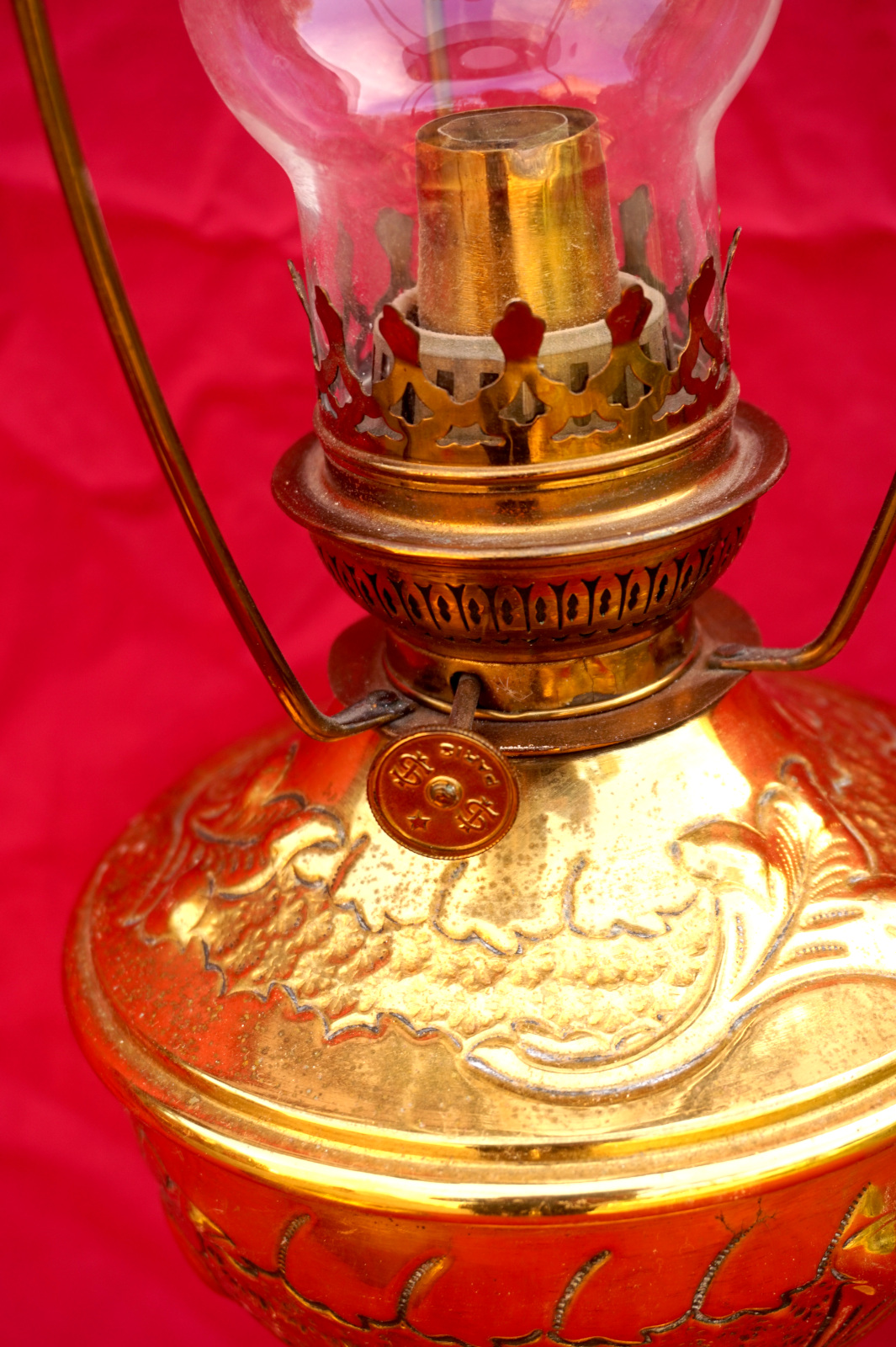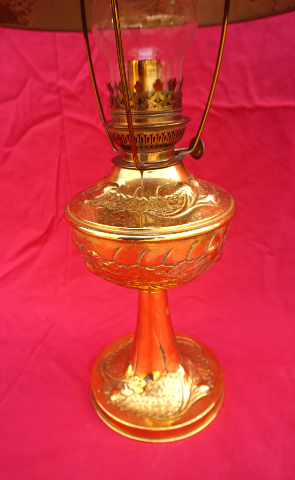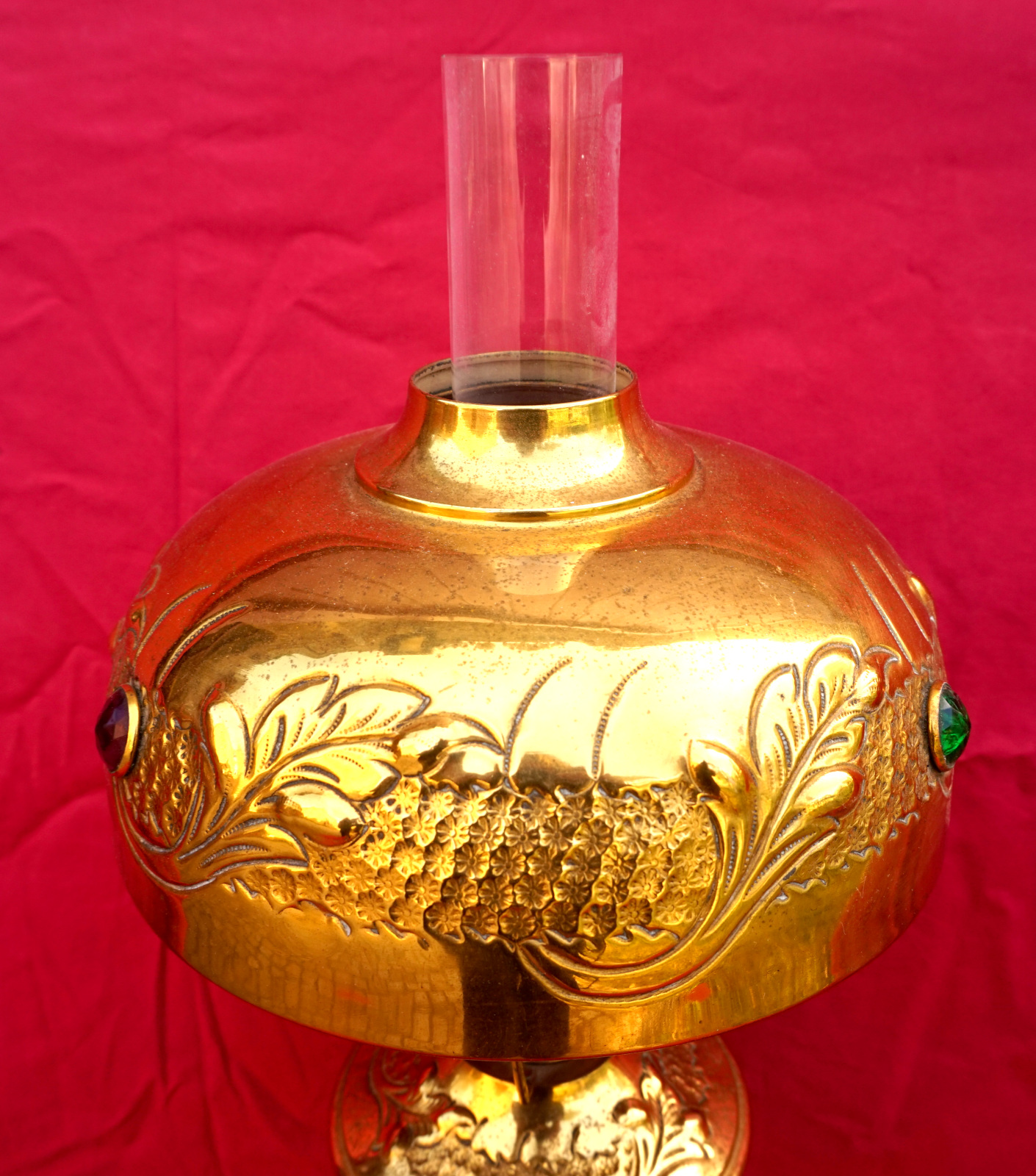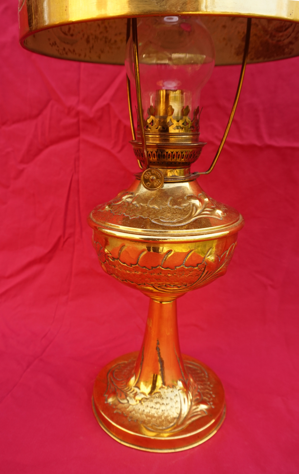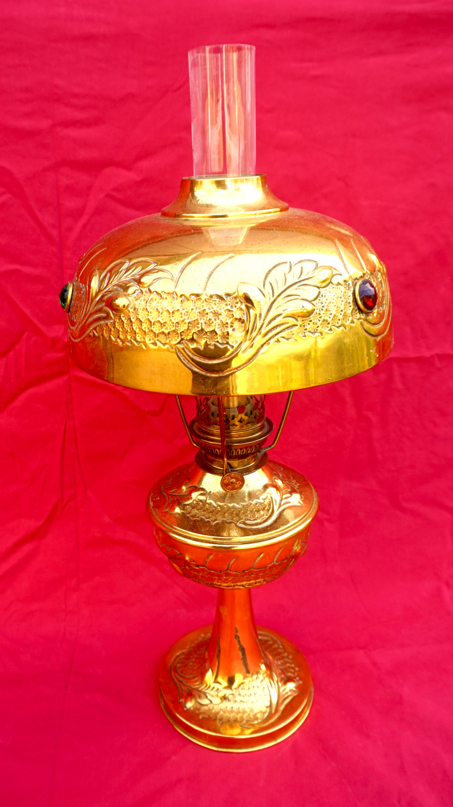 Lampe à pétrole en laiton avec son abat jour orné de cabochons, bruleur UNIS Paris vers 1920. Hauteur totale 55.8 cm, hauteur du pied 31 cm, diamètre de l'abat jour 24cm, poids 1.605 kg. Très bel état, une déchirure en haut du pied, elle ne fuit pas.