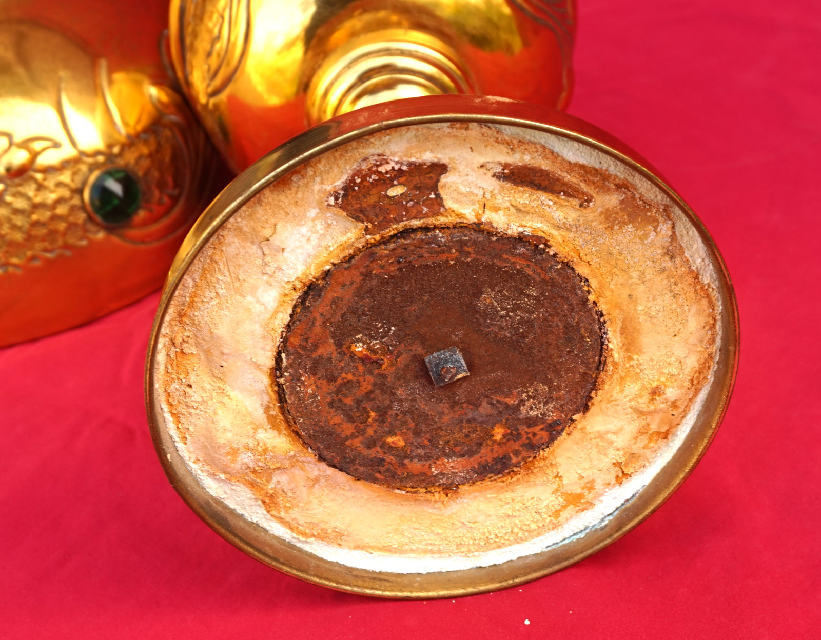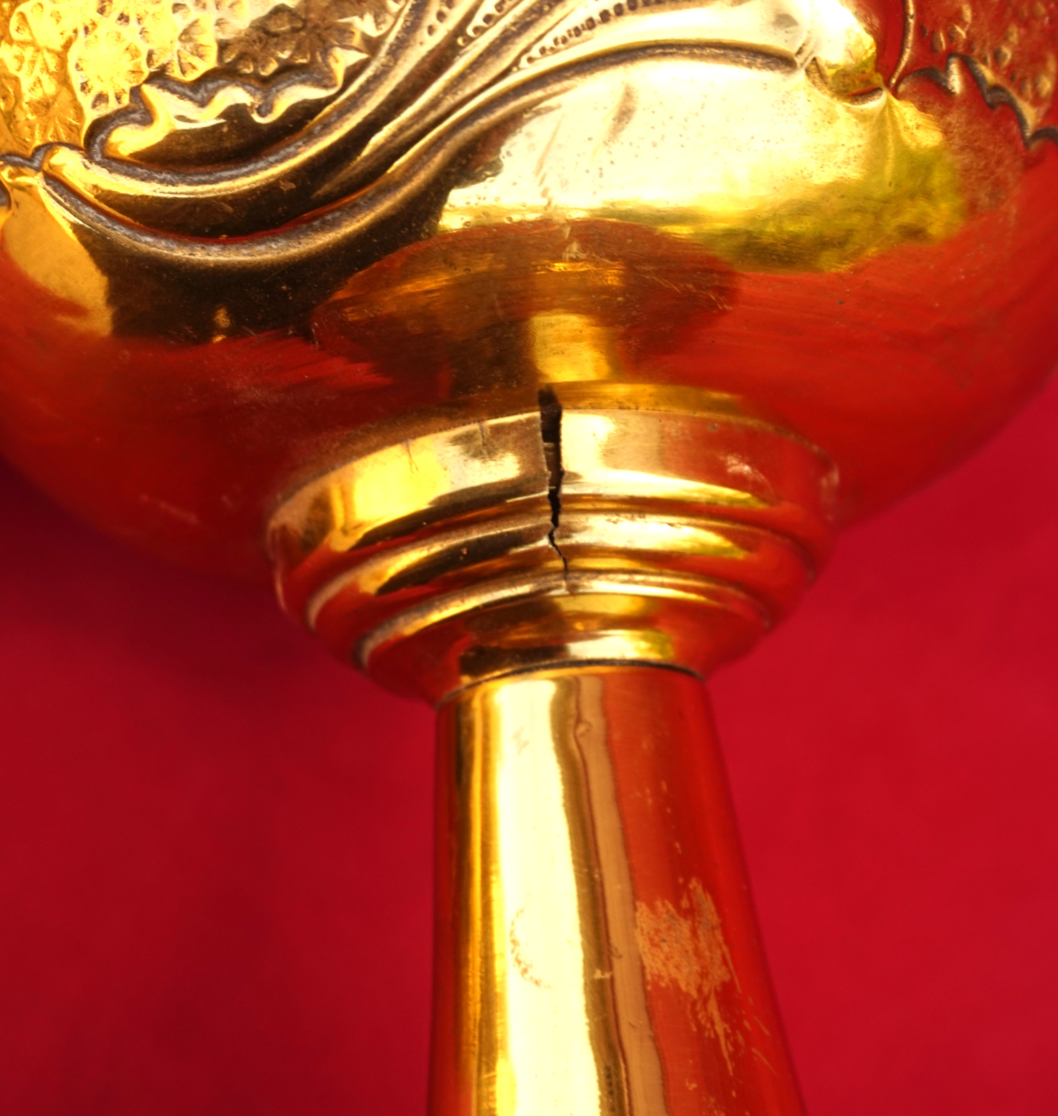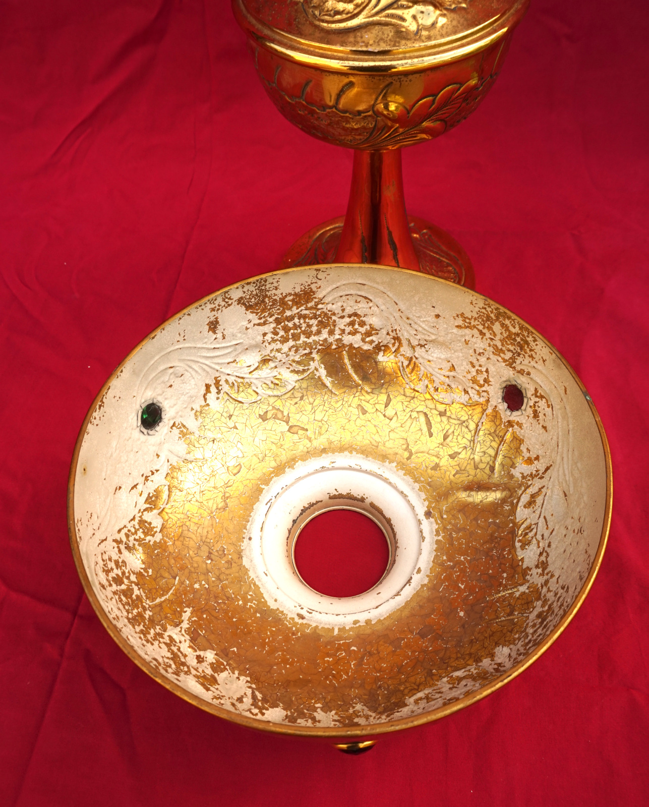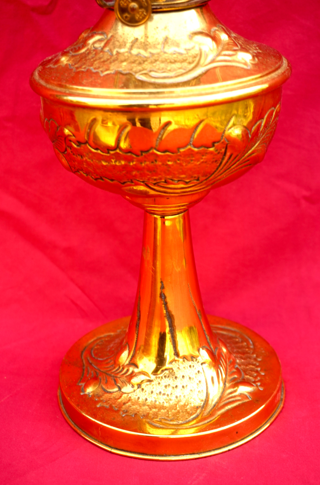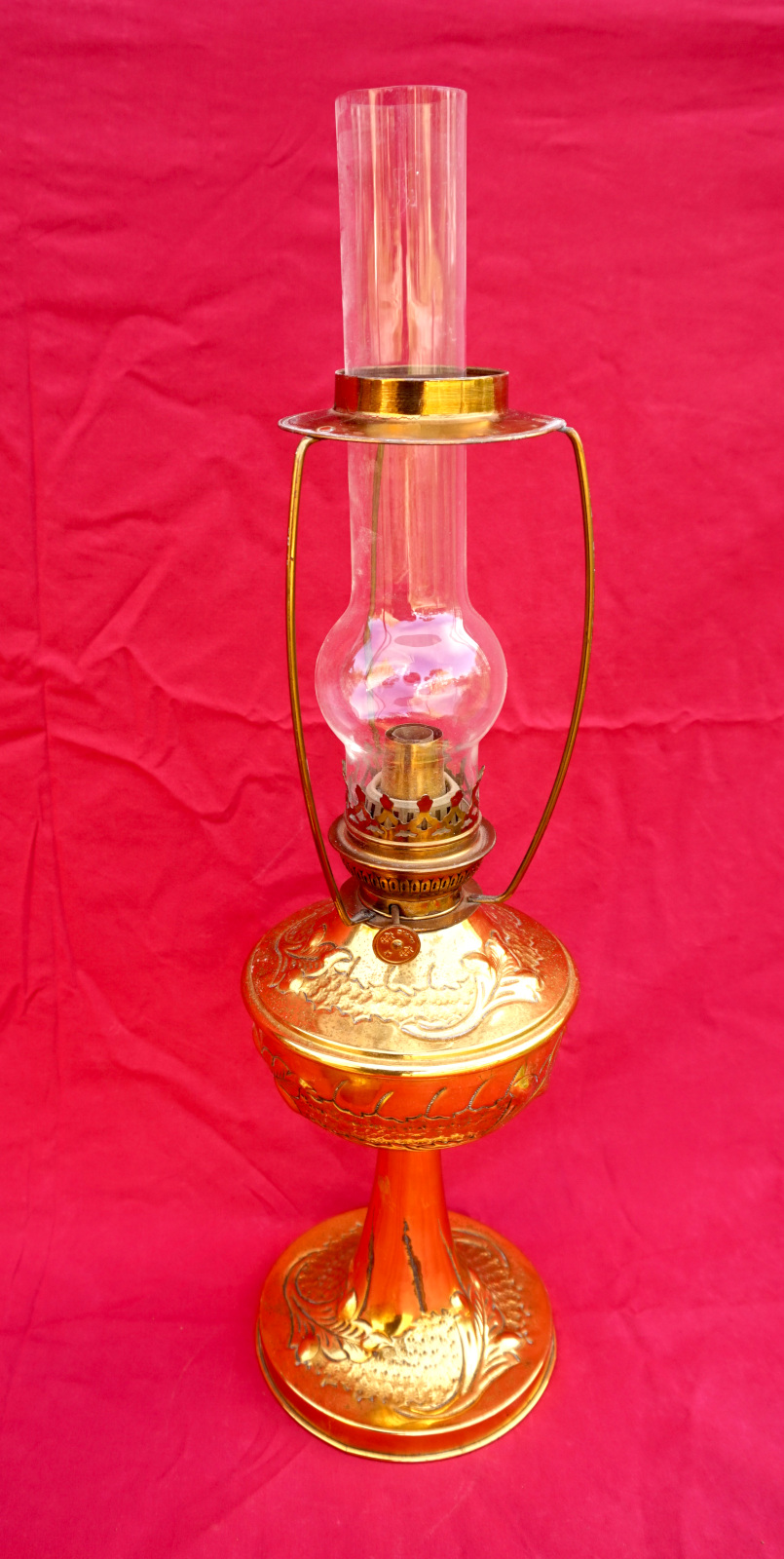 Lampe à pétrole en laiton avec son abat jour orné de cabochons, bruleur UNIS Paris vers 1920. Hauteur totale 55.8 cm, hauteur du pied 31 cm, diamètre de l'abat jour 24cm, poids 1.605 kg. Très bel état, une déchirure en haut du pied, elle ne fuit pas.