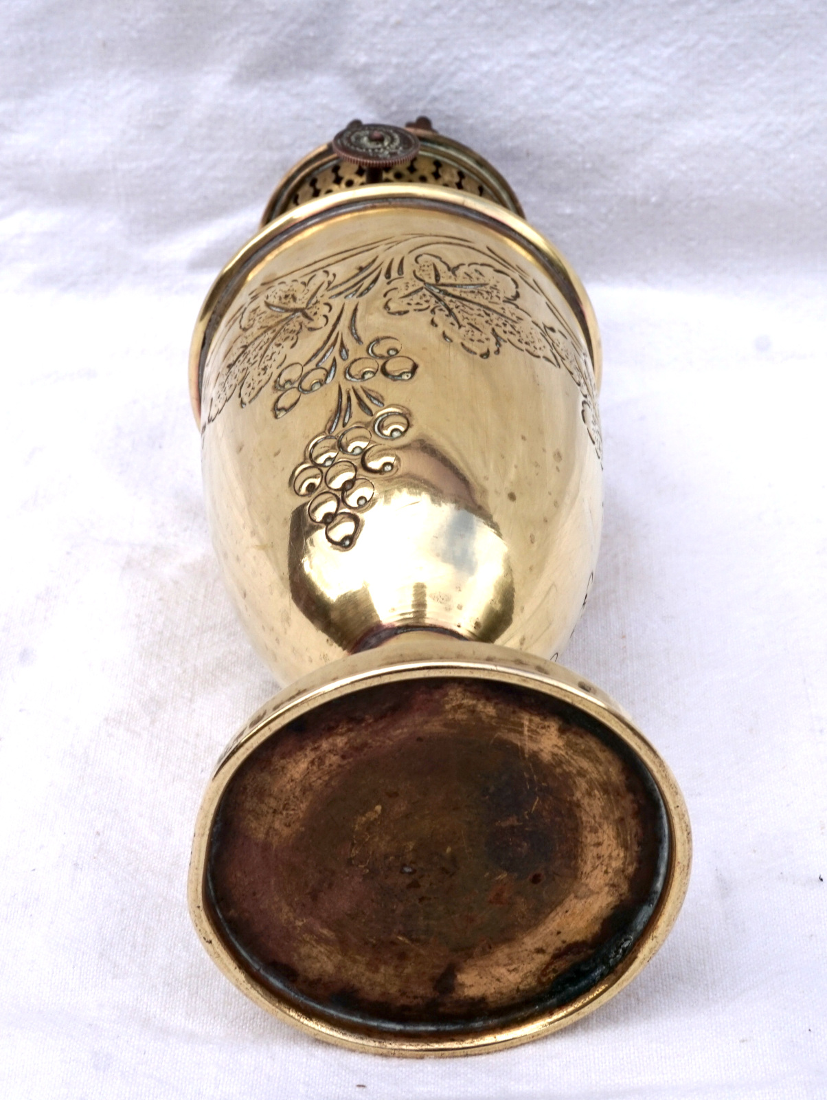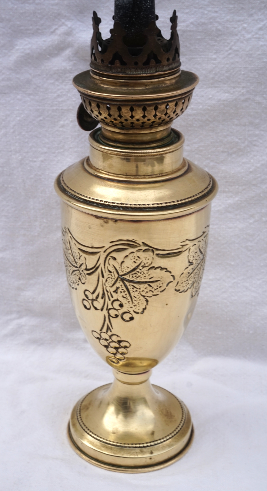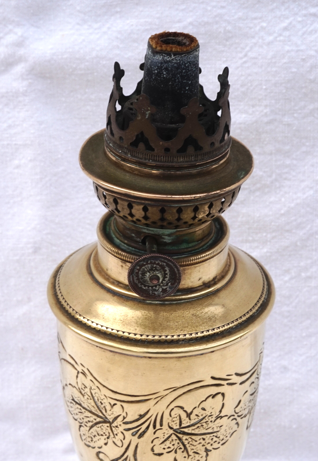 Lampe à pétrole sur un pied en laiton à décor repoussé et bruleur Hasag vers 1900. Hauteur totale 45cm, hauteur du pied 23.5 cm, diamètre du pied 7.5 cm, poids 238 gr. Très bel état.