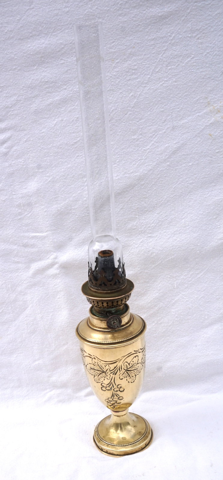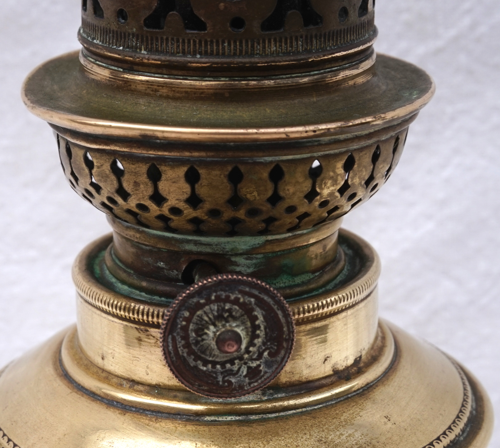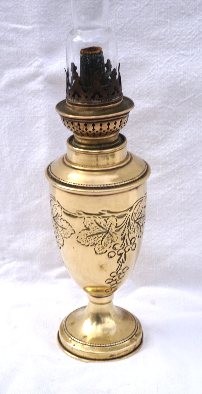 Lampe à pétrole sur un pied en laiton à décor repoussé et bruleur Hasag vers 1900. Hauteur totale 45cm, hauteur du pied 23.5 cm, diamètre du pied 7.5 cm, poids 238 gr. Très bel état.