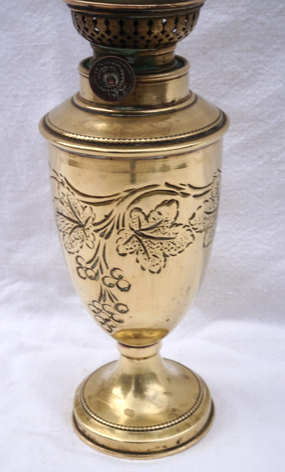 Kerosene oil lamp with repousse brass base and Hasag burner made during the 1900's. 173/4" (45cm) total height, 9 1/4" (23.5cm) base height, 3" (7.5cm) diameter to the body of the base, weight 8.39oz (238 grams). Beautiful condition, complete with chimney and ready for use as shown by the following pictures.